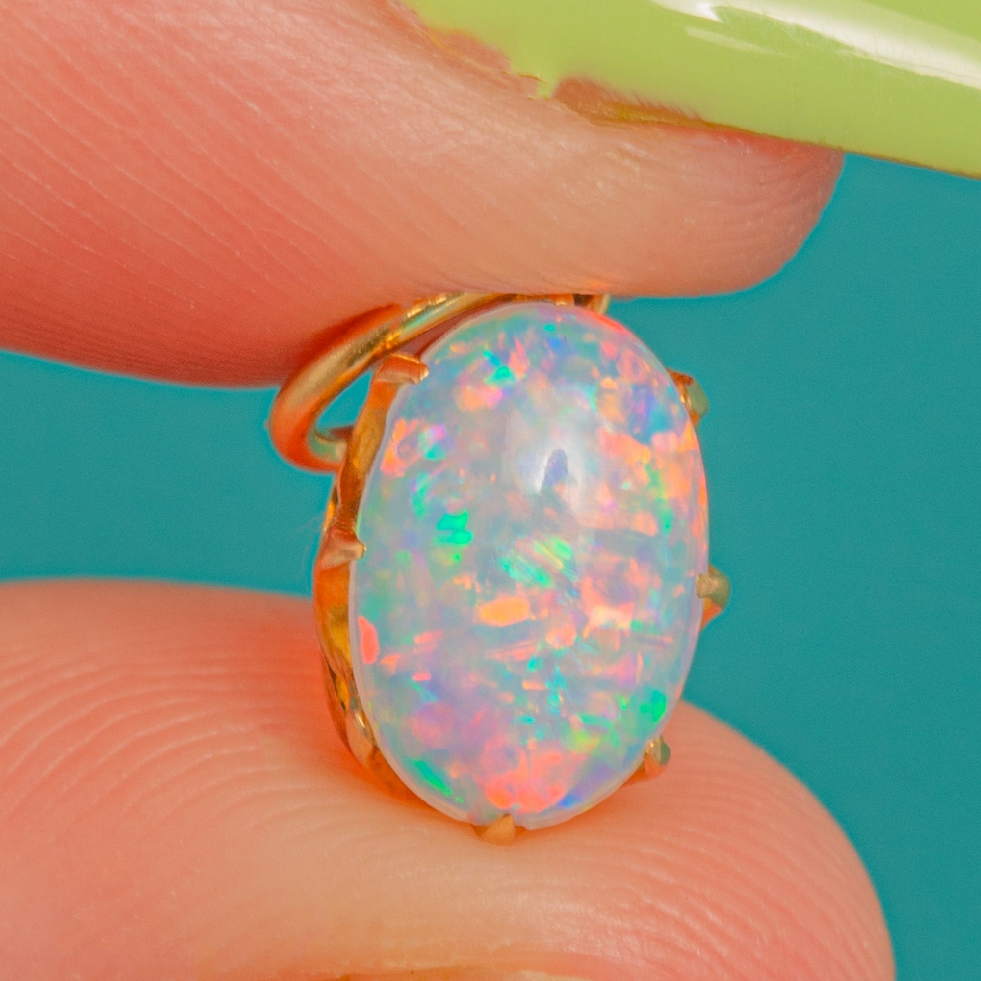 EXCELLENT: The Opal is bright and glossy with no obvious chips or abrasions, displaying vivid play-of-colour. The 18ct Gold setting and prongs are secure with only light surface wear to the high points consistent with age.