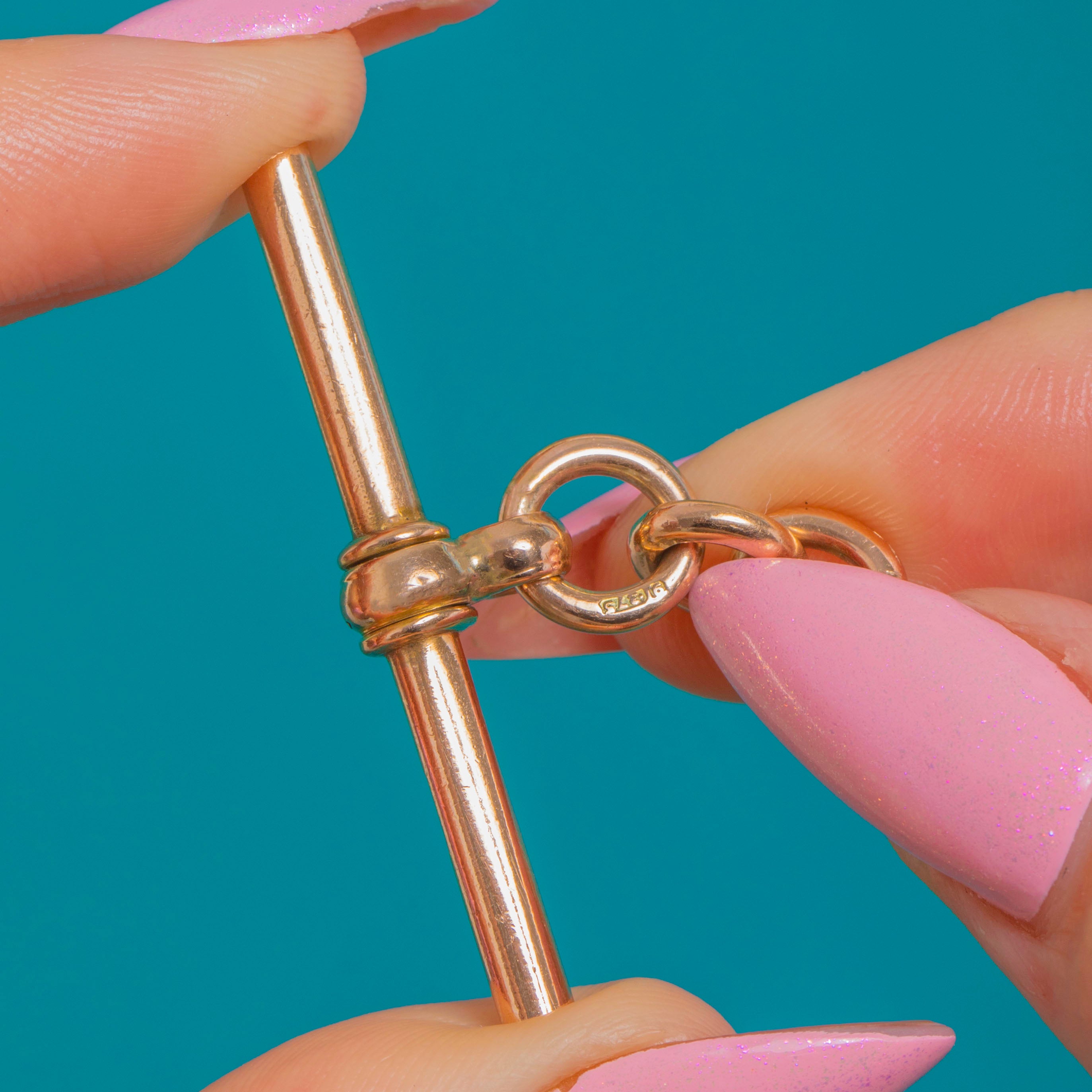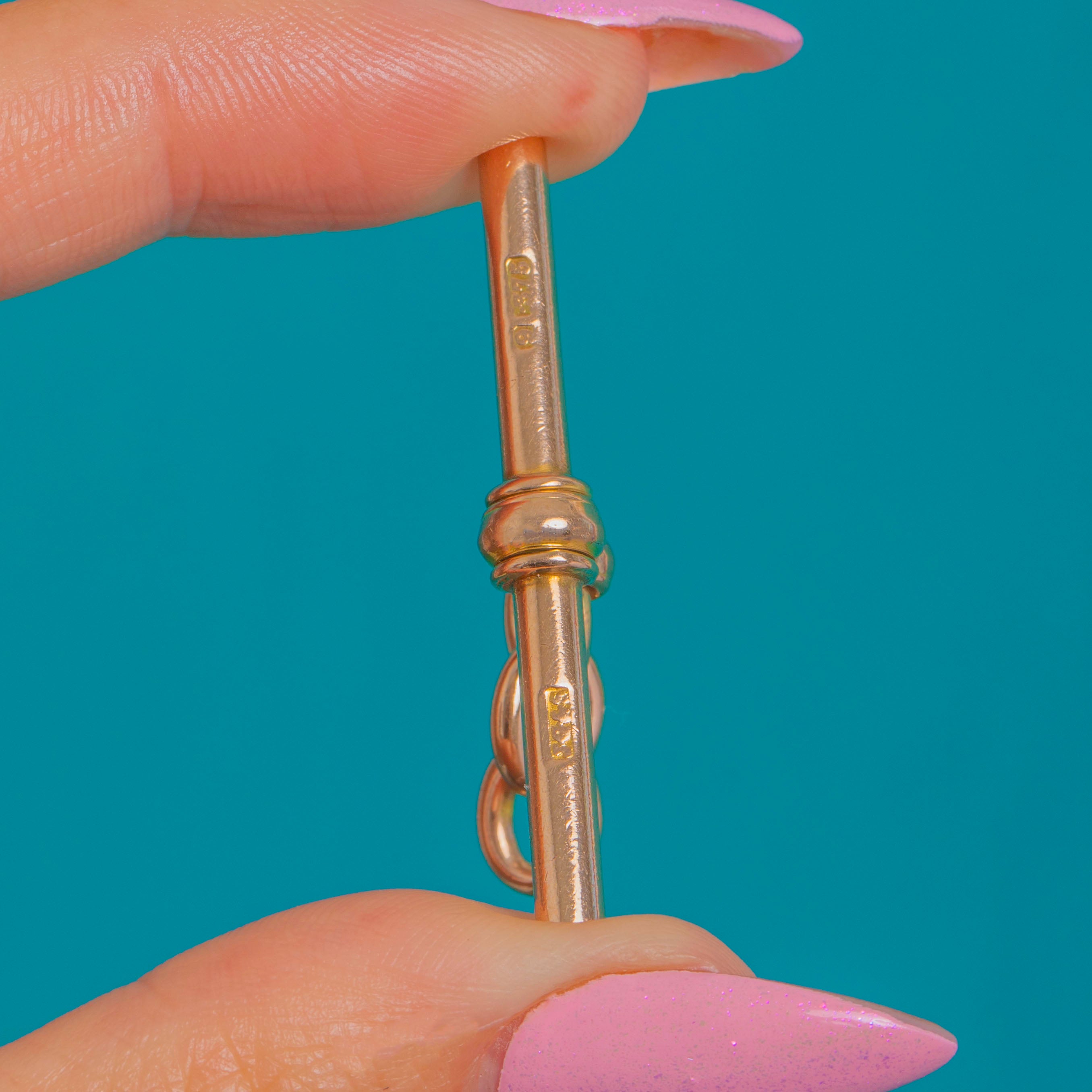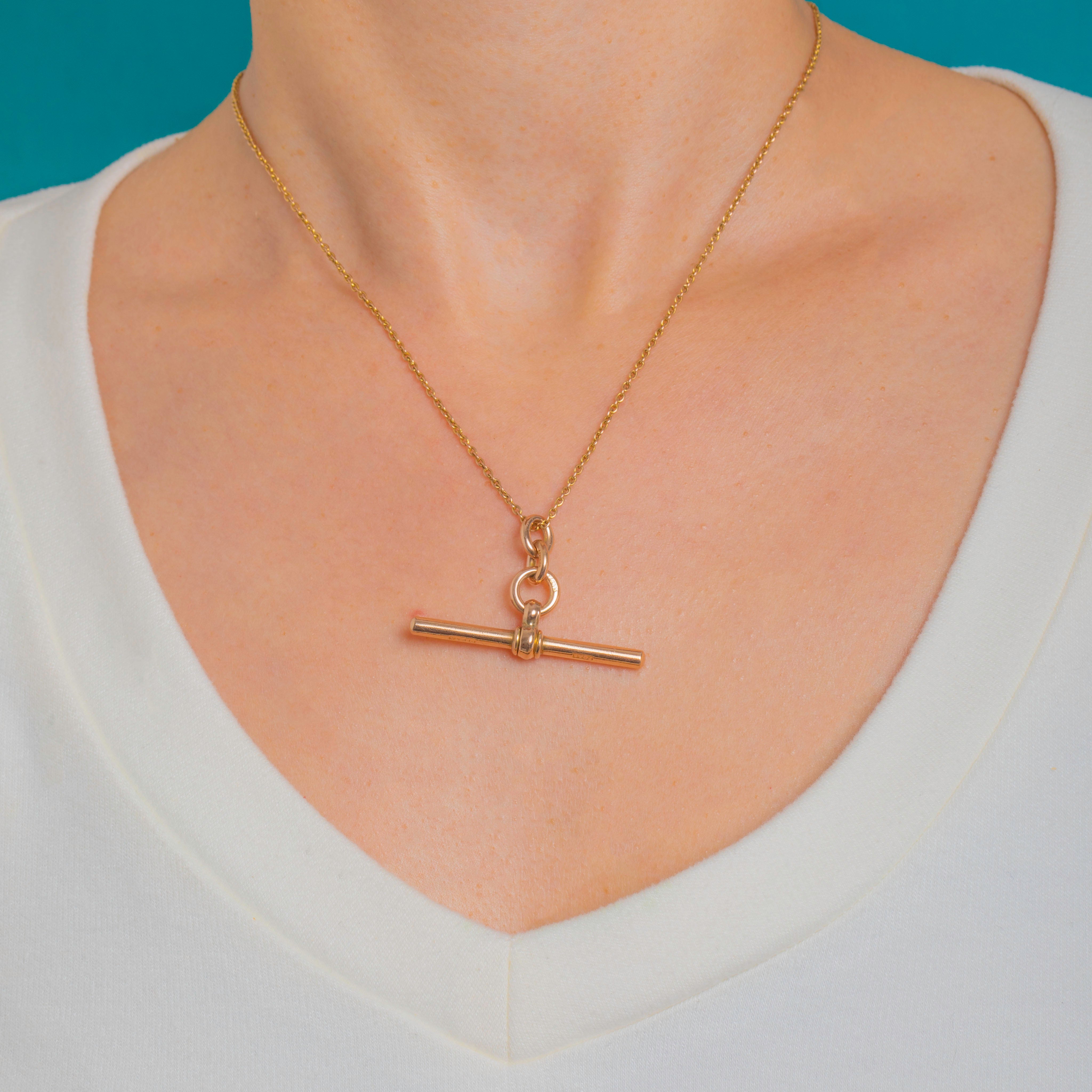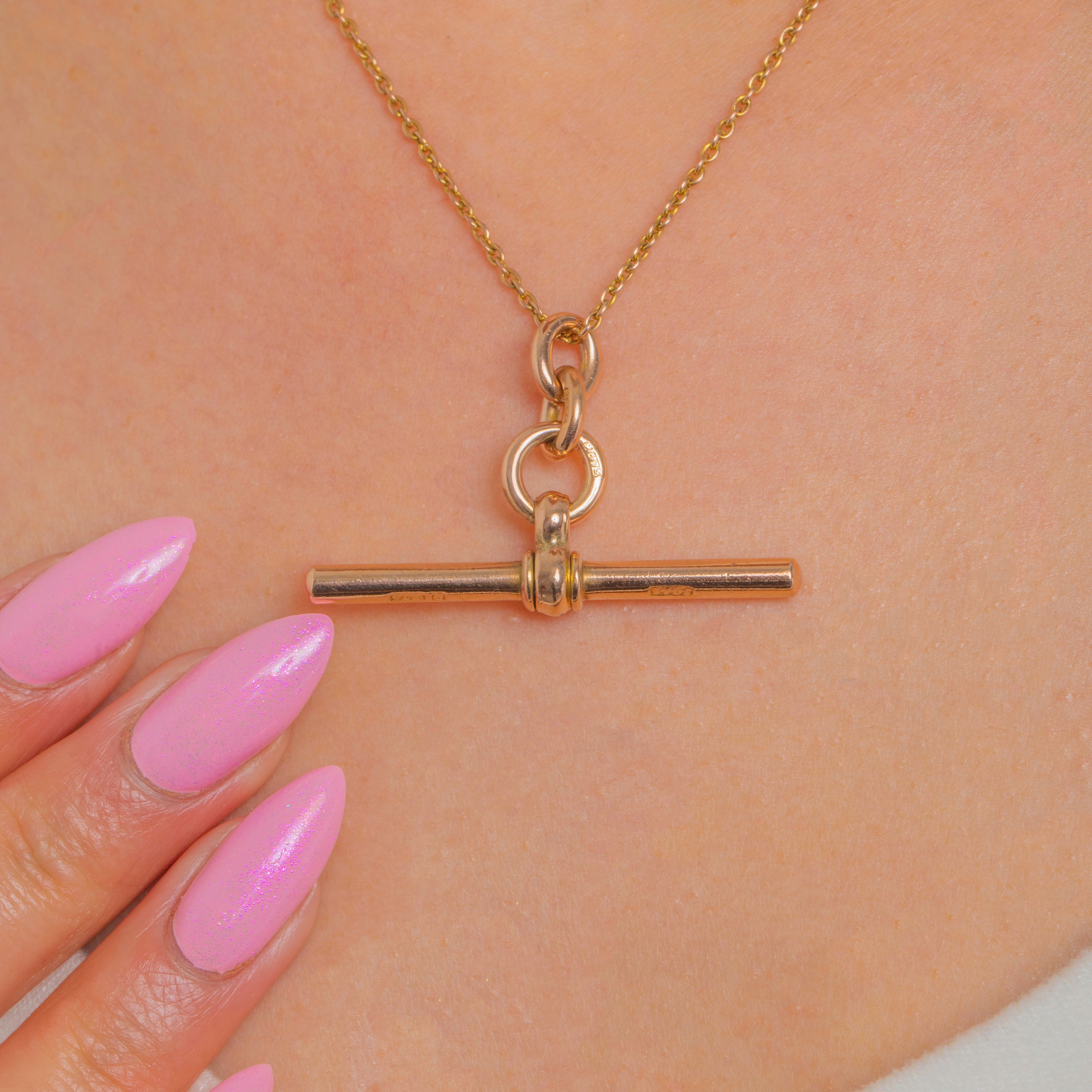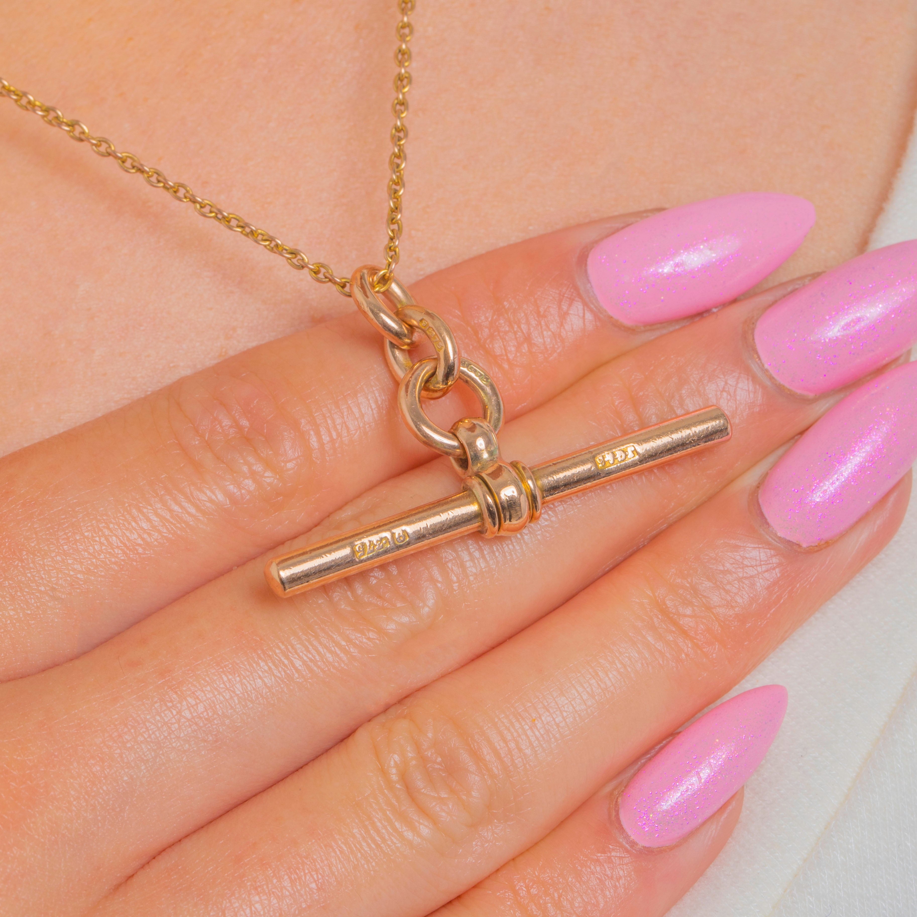 A timeless Victorian 9ct Gold T-bar pendant with clean, utilitarian elegance. The solid tubular bar is accented by a turned central collar and suspended from neatly stacked jump rings, all finished in a bright, polished sheen.