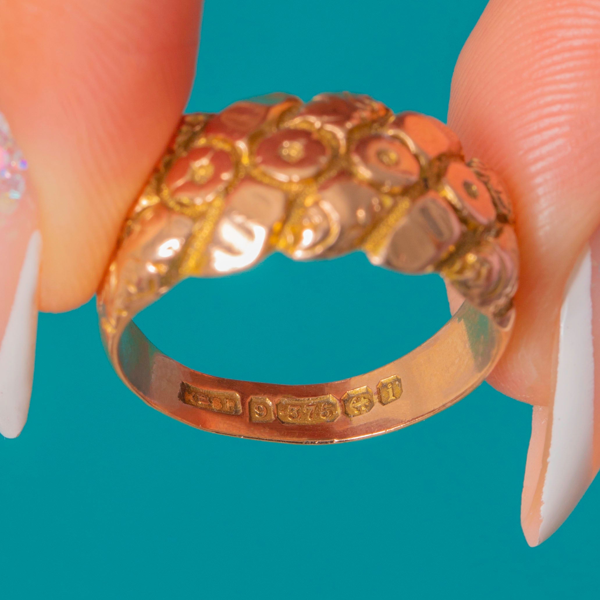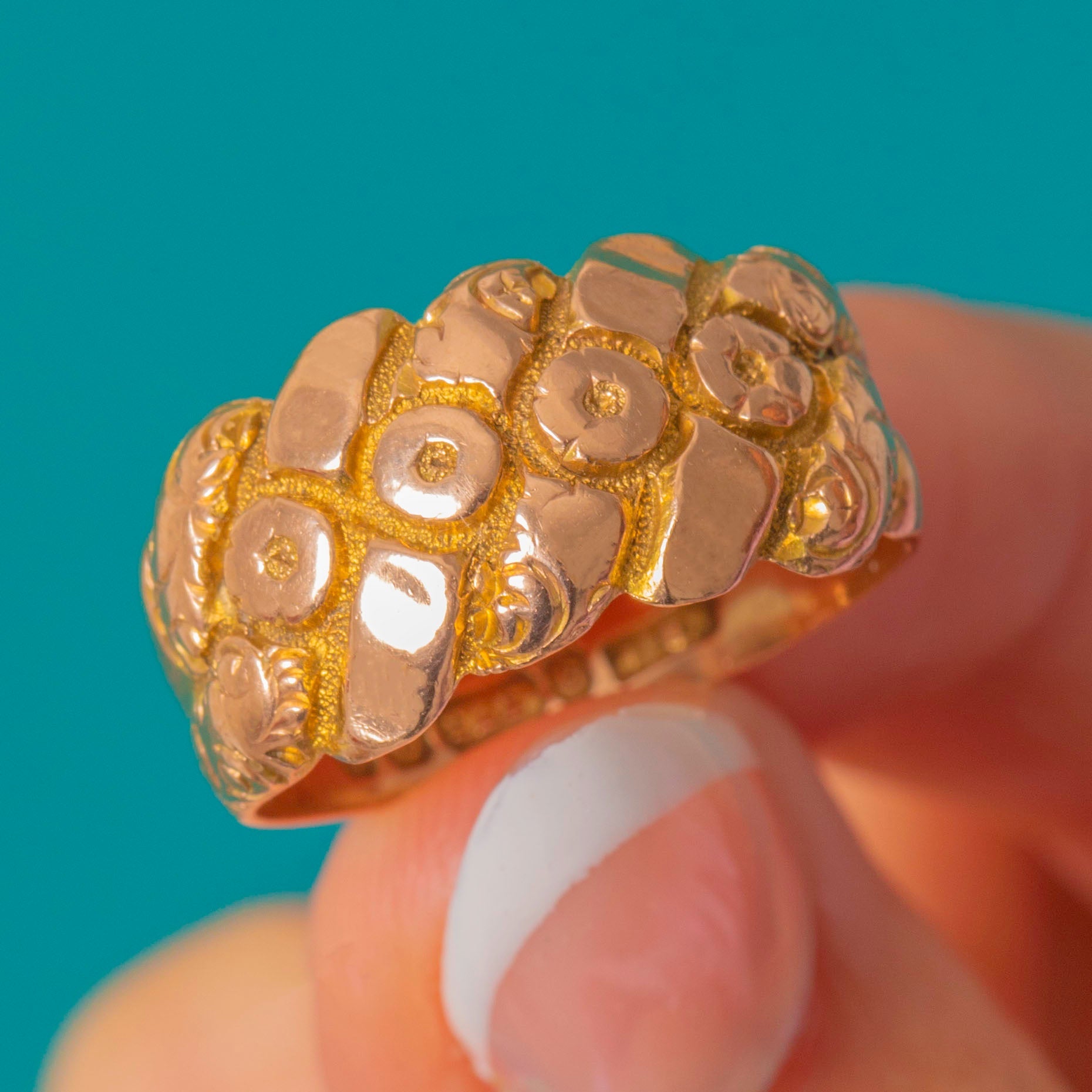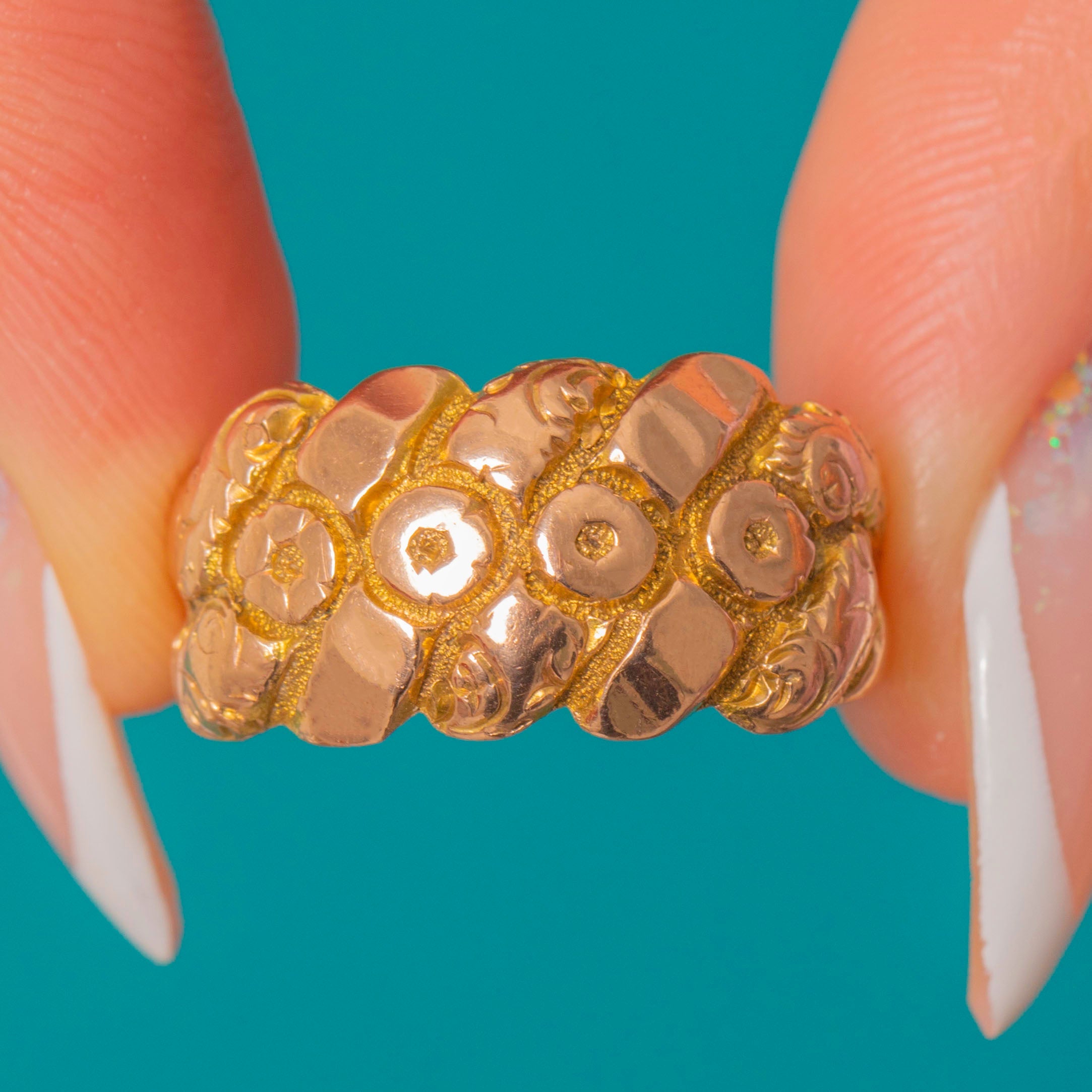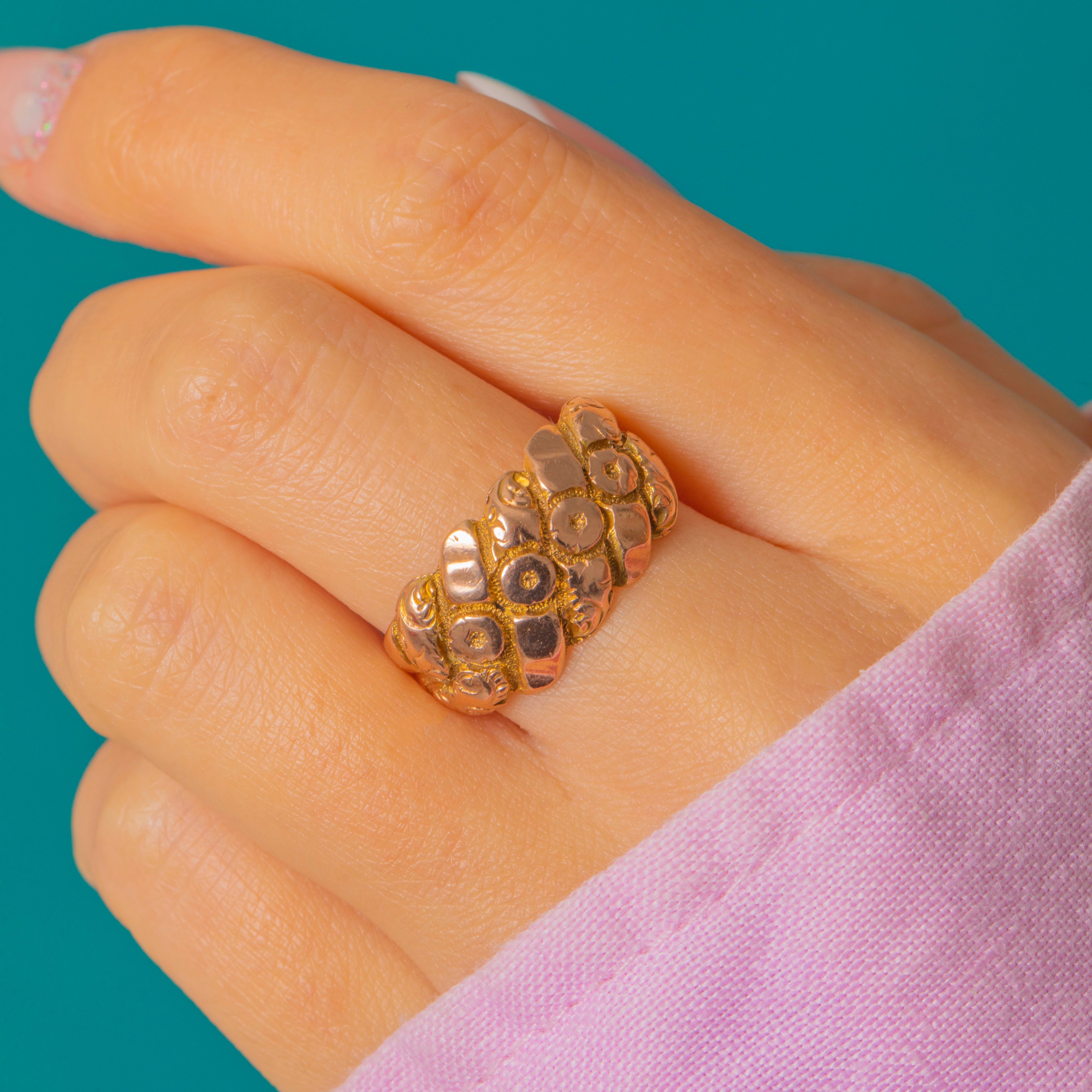 Chunky Edwardian 9ct Gold Engraved Floral Ring, c.1908