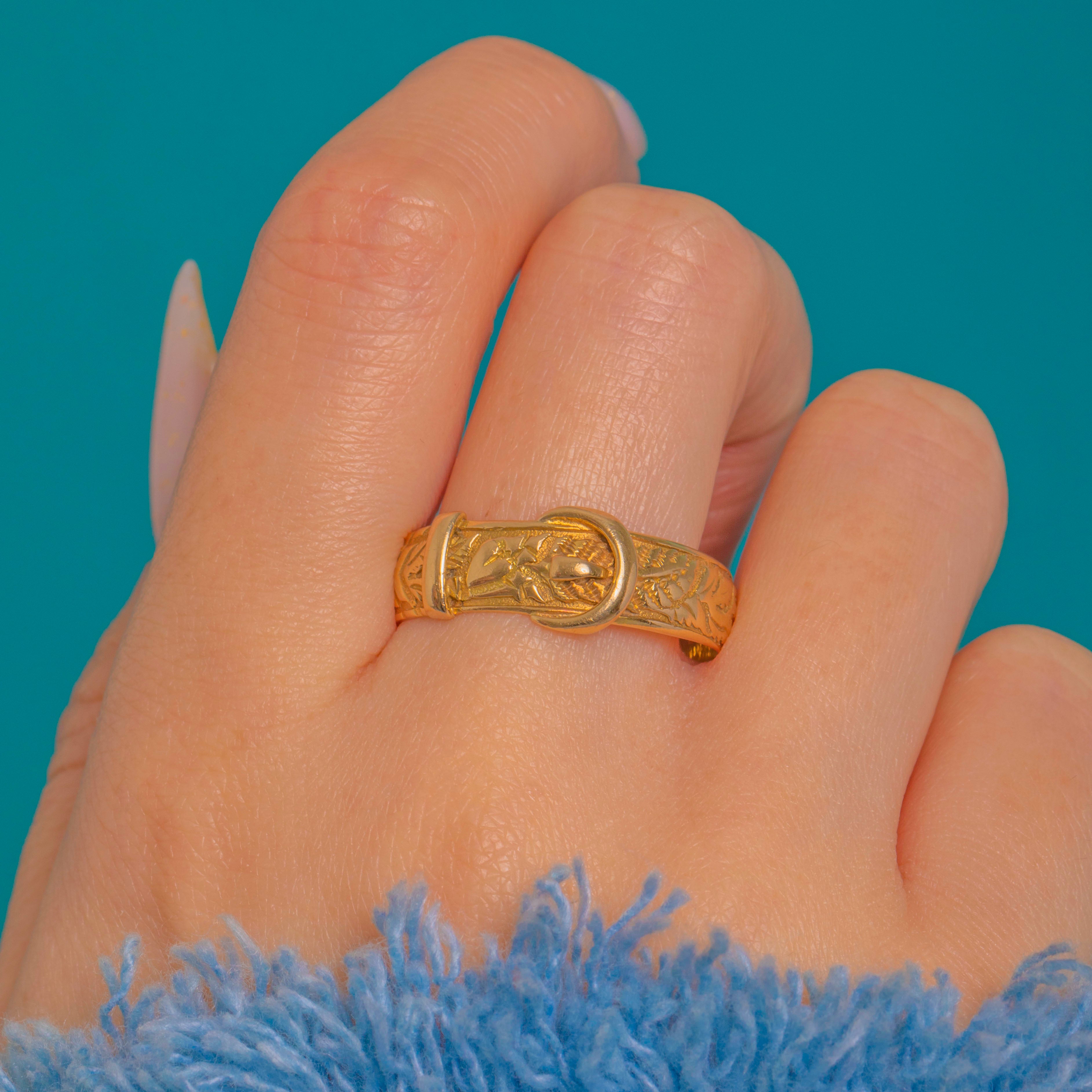 A classic buckle ring in rich 18ct Gold, this antique beauty marries sculpted form with intricate foliate engravings. The raised loop, tongue and keeper sit proudly over a chased leafy ground, giving a low-profile yet substantial presence that feels wonderfully reassuring on the hand.