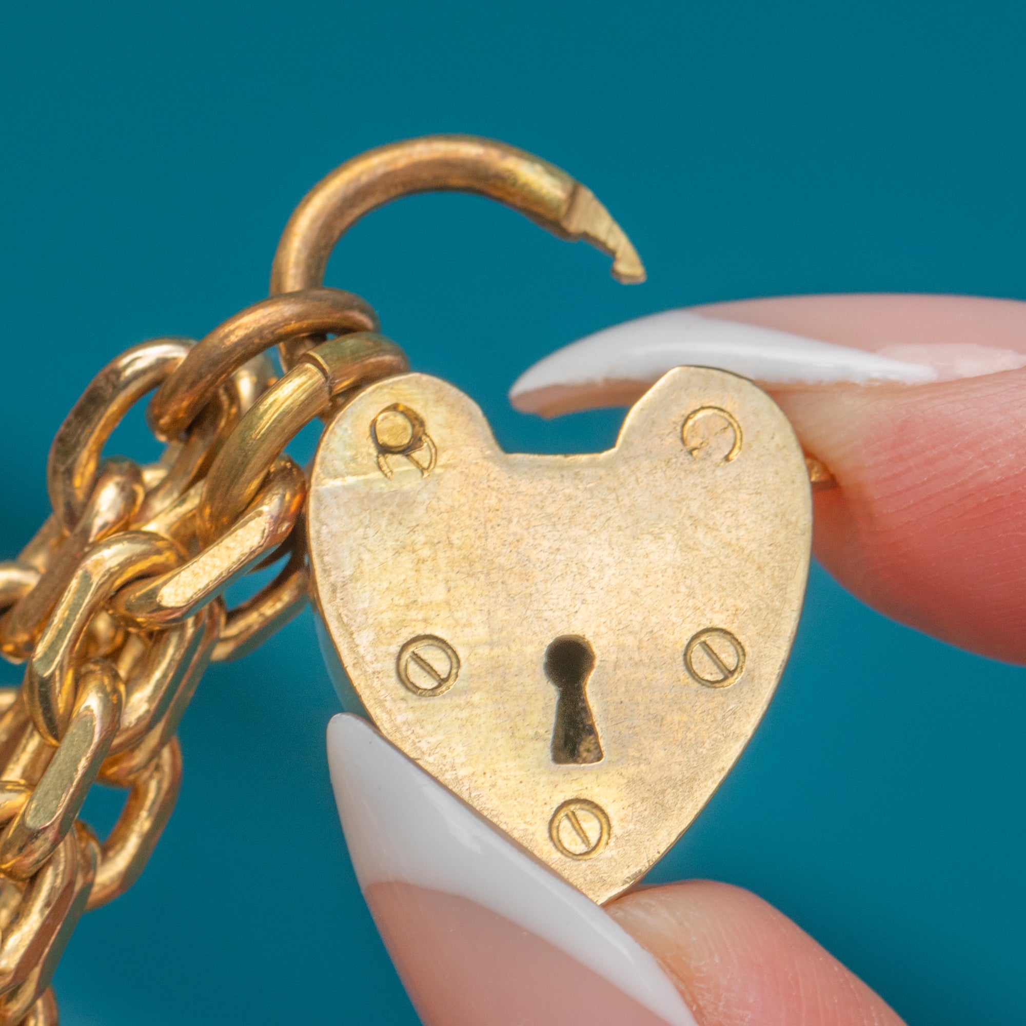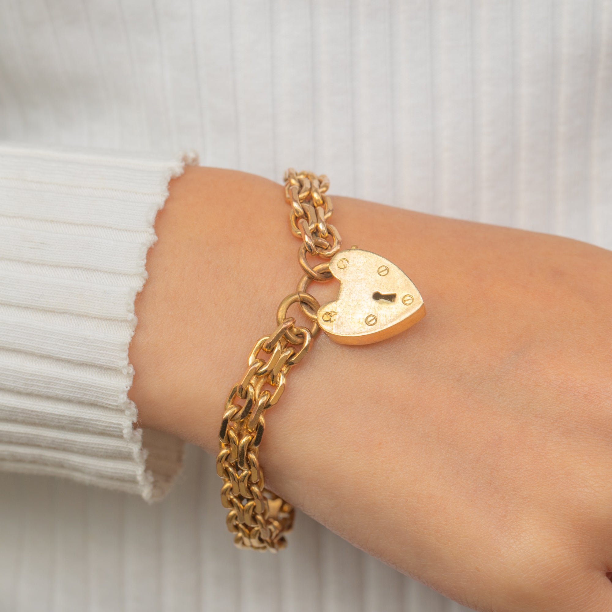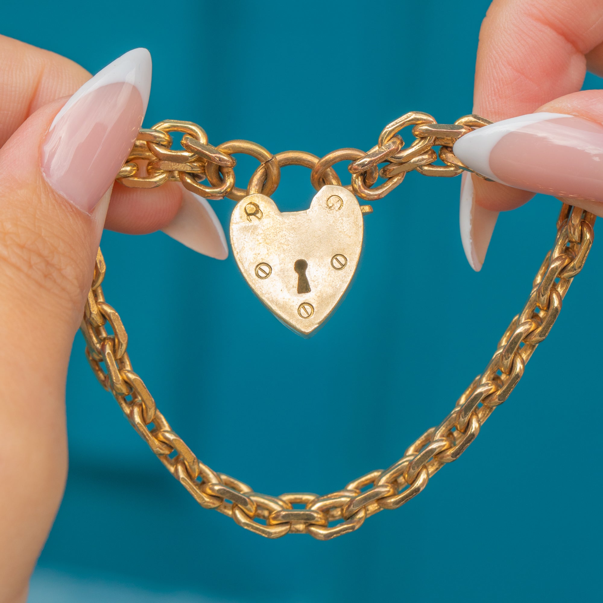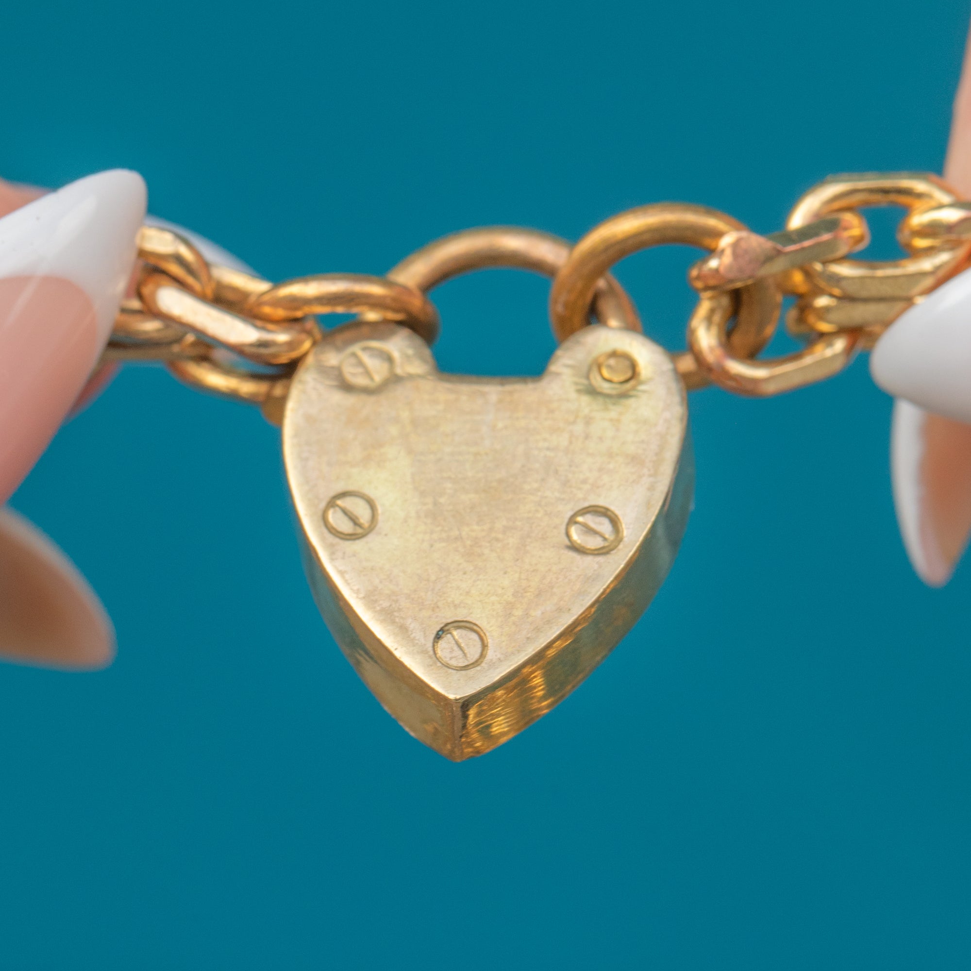 Heart padlock bracelets became popular in the early 20th century and continued to be a beloved jewellery style throughout the Mid-Century era. This example, with its solid curb links and large padlock, carries a timeless appeal that remains fashionable today.