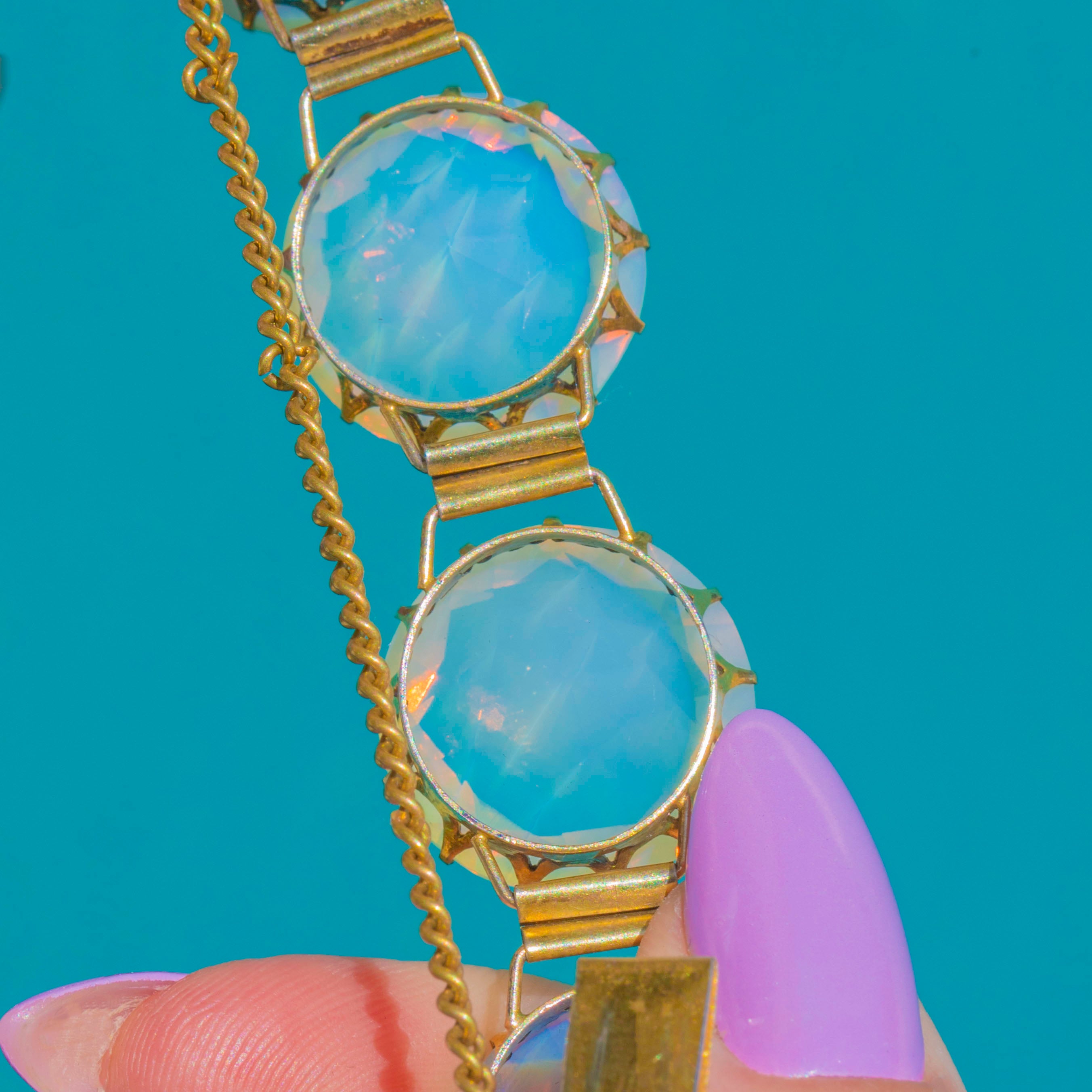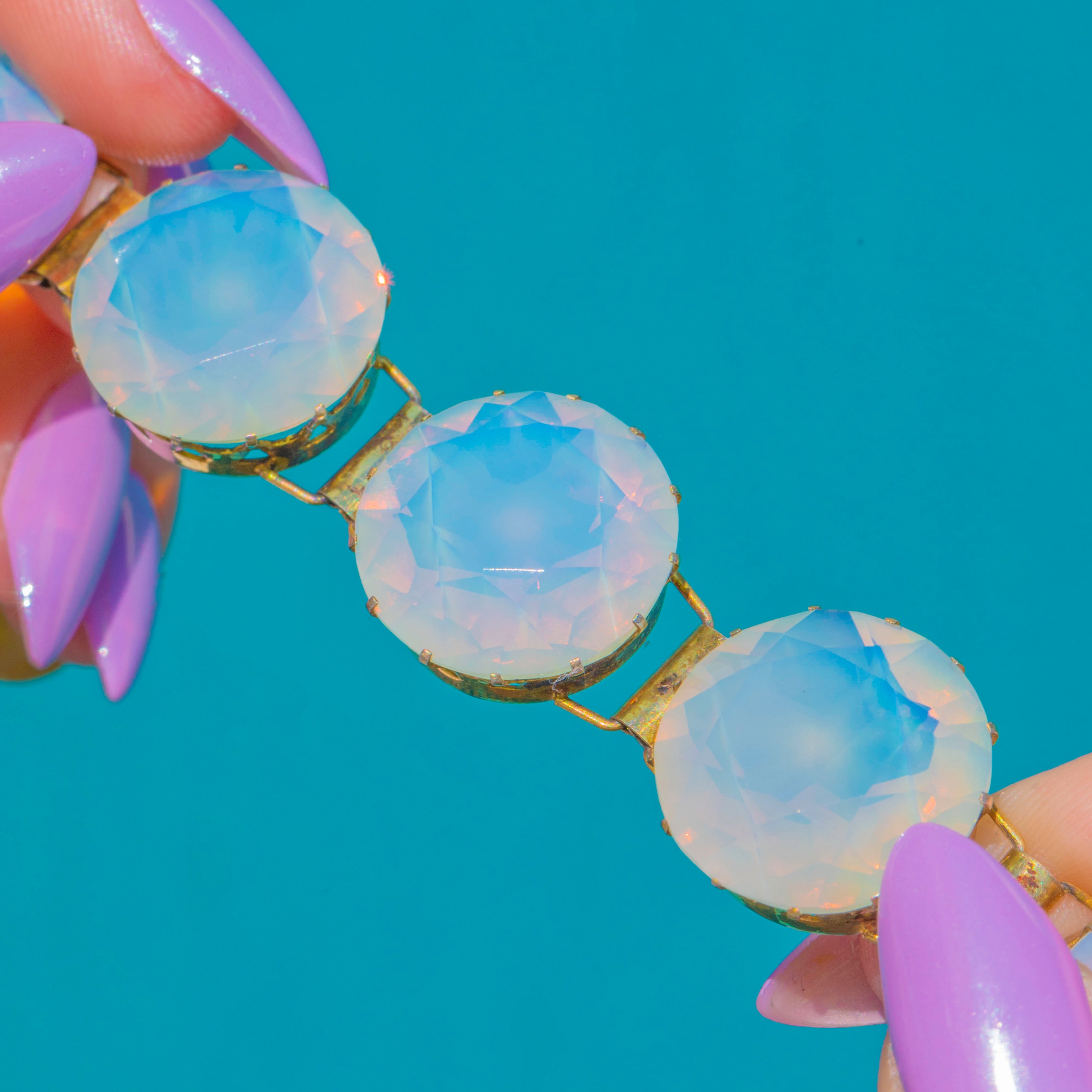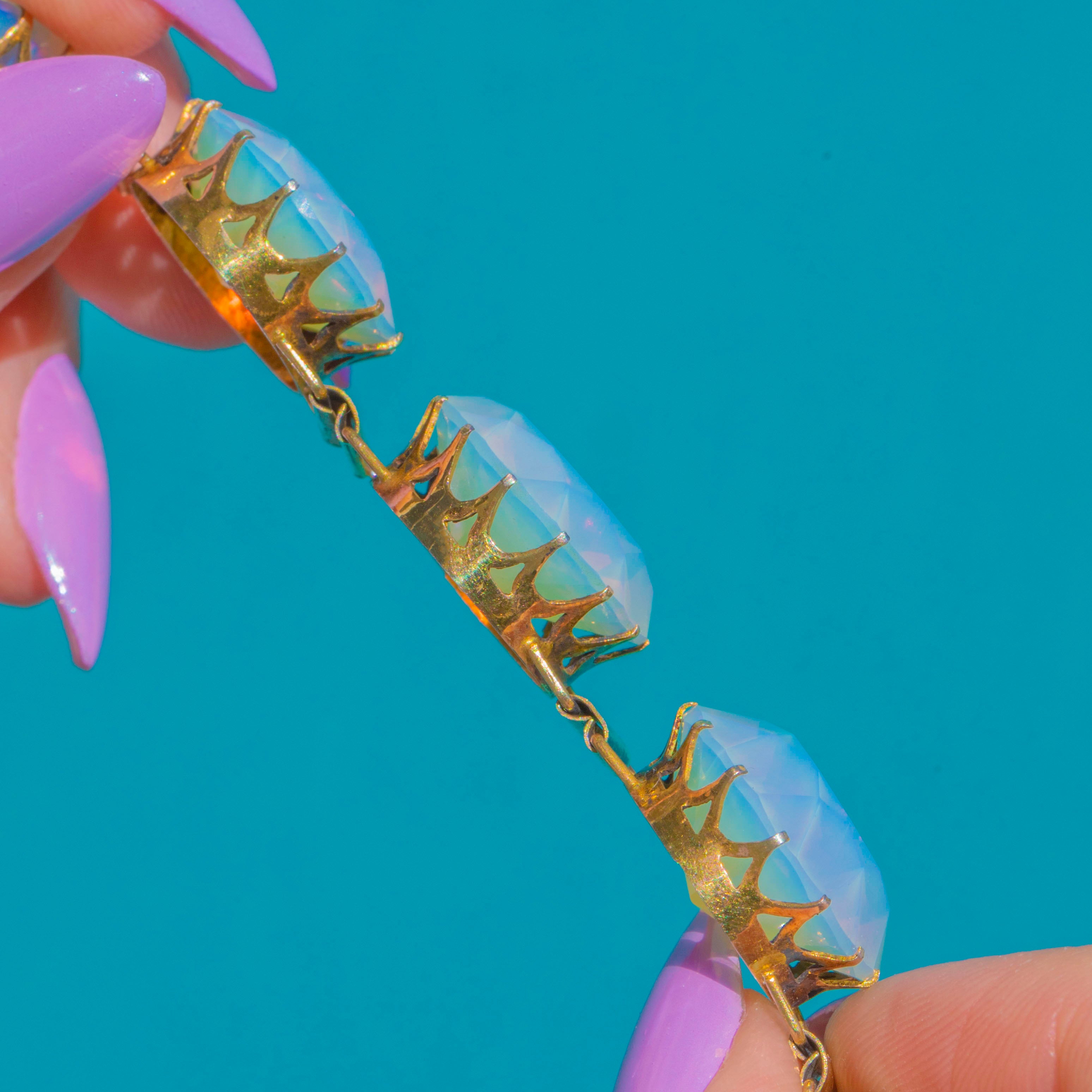 Utterly captivating in its glow, this chunky Victorian bracelet showcases sumptuous rounds of Opaline glass whose pale, moonlit bodies dance with pink, green and orange flashes at every turn. Each large, faceted stone is cradled in a high crown, prong-set setting with decorative openwork detail, the warm sheen of Gilded Sterling Silver adding a regal finish.