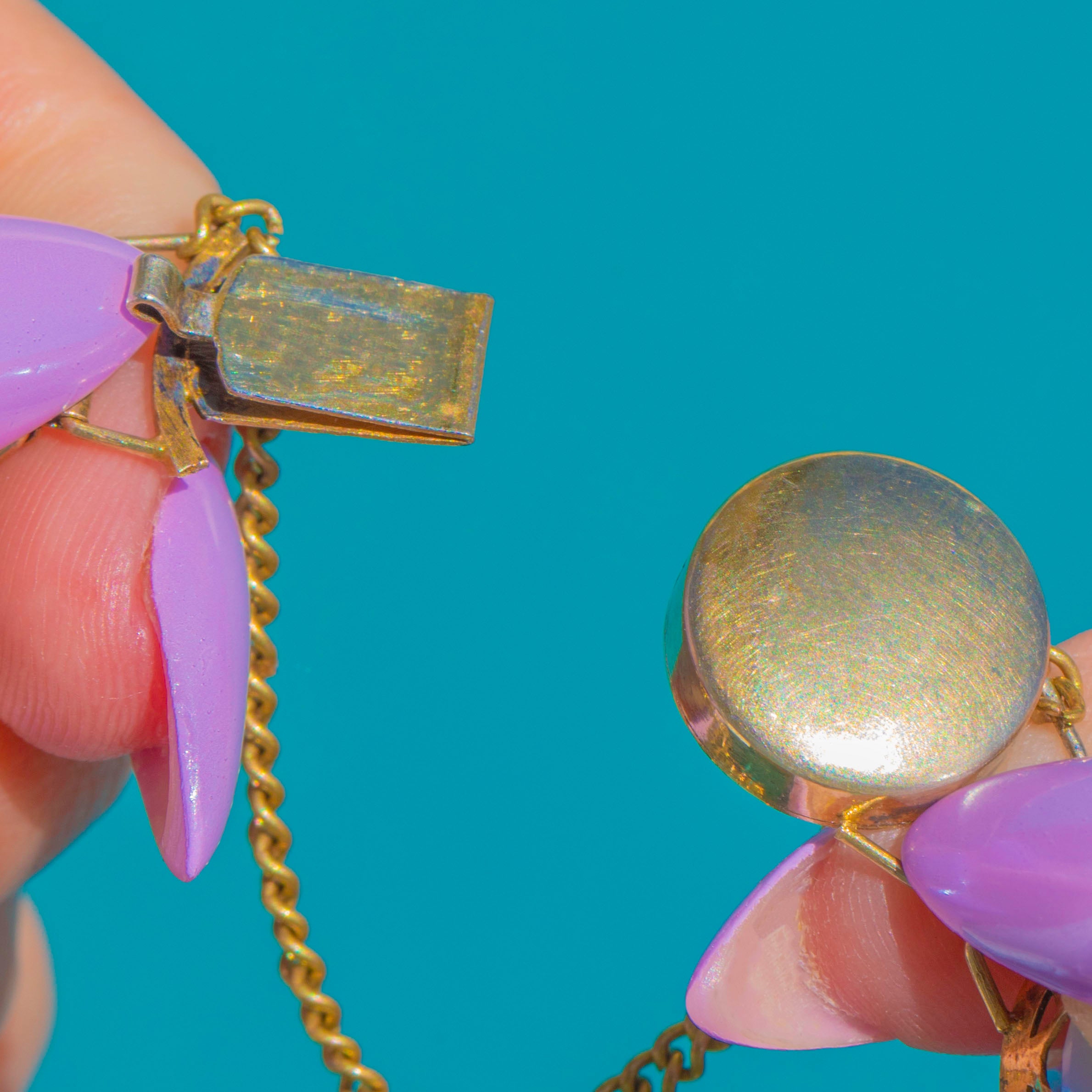 EXCELLENT: The Opaline glass stones are bright and lively with only the most minor surface scuffs visible under close inspection, and no chips or cracks observed. The Gilded Sterling Silver settings and links are secure with light, even wear to the gilding commensurate with age. The box clasp closes securely, the safety chain is intact, and there are no obvious signs of repair.