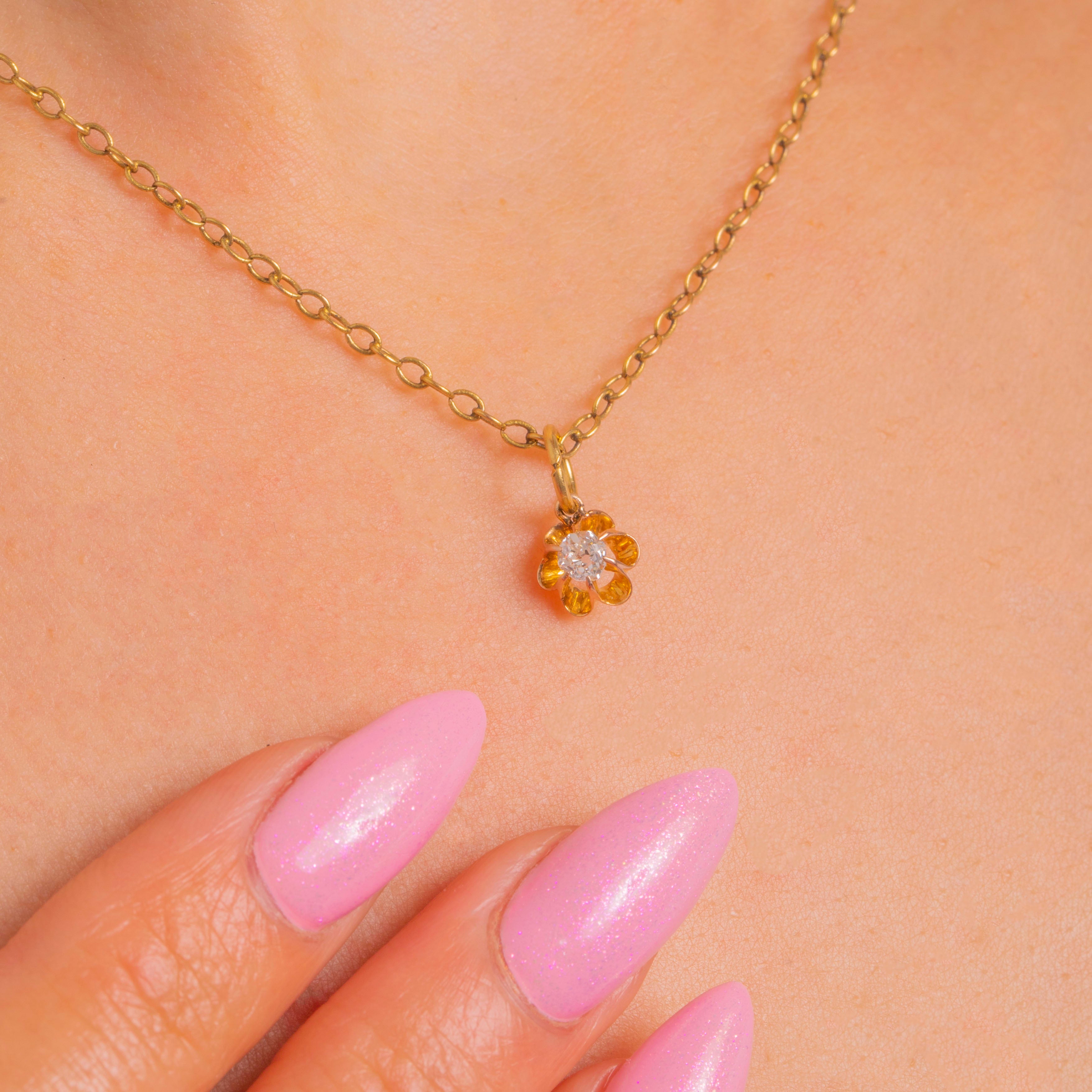 Petite and perfectly formed, this Victorian buttercup charm is crafted in glowing 15ct Gold and set with a bright Diamond at its heart. The classic buttercup setting gently cups the stone so it catches the light beautifully, offering a delicate sparkle in the most refined way.
