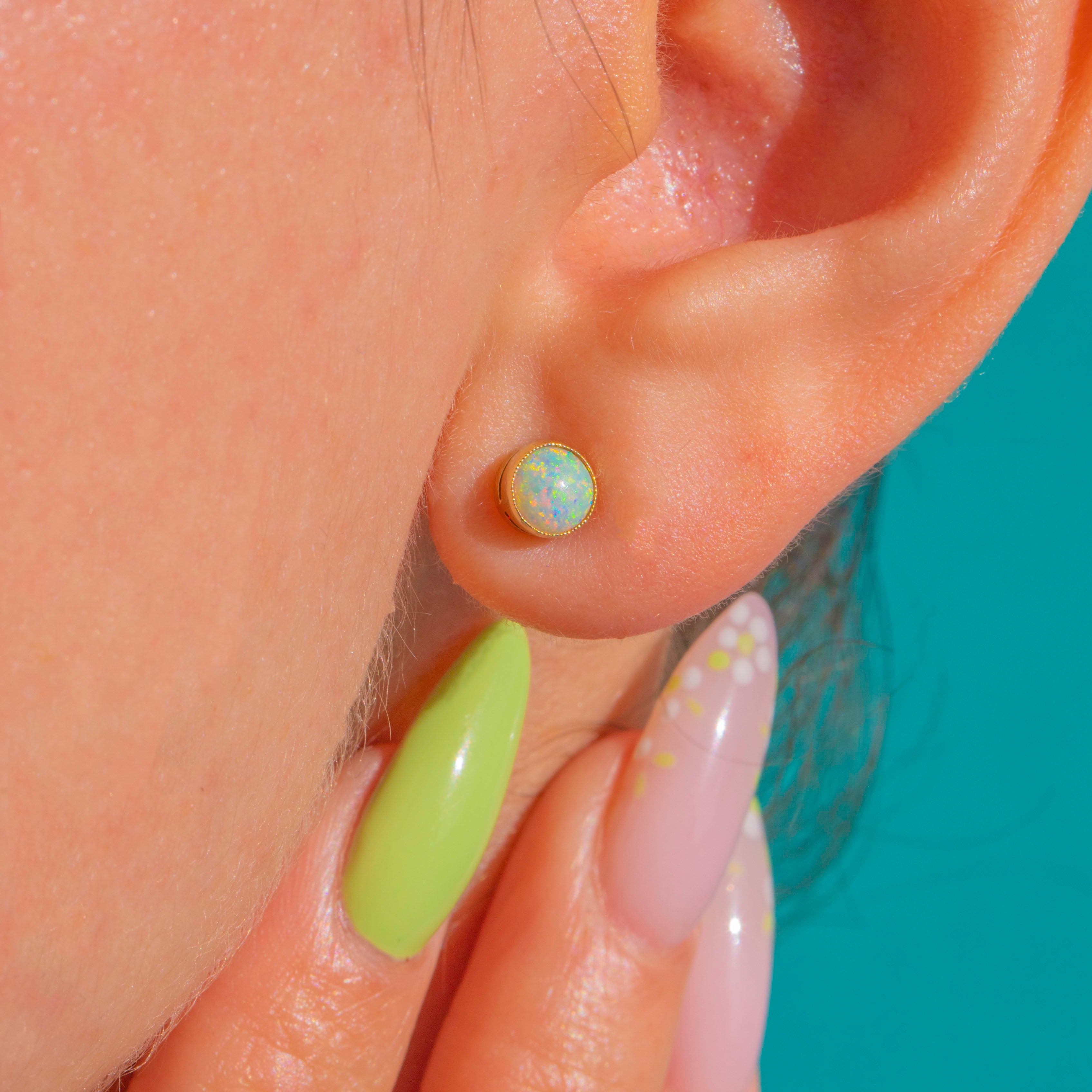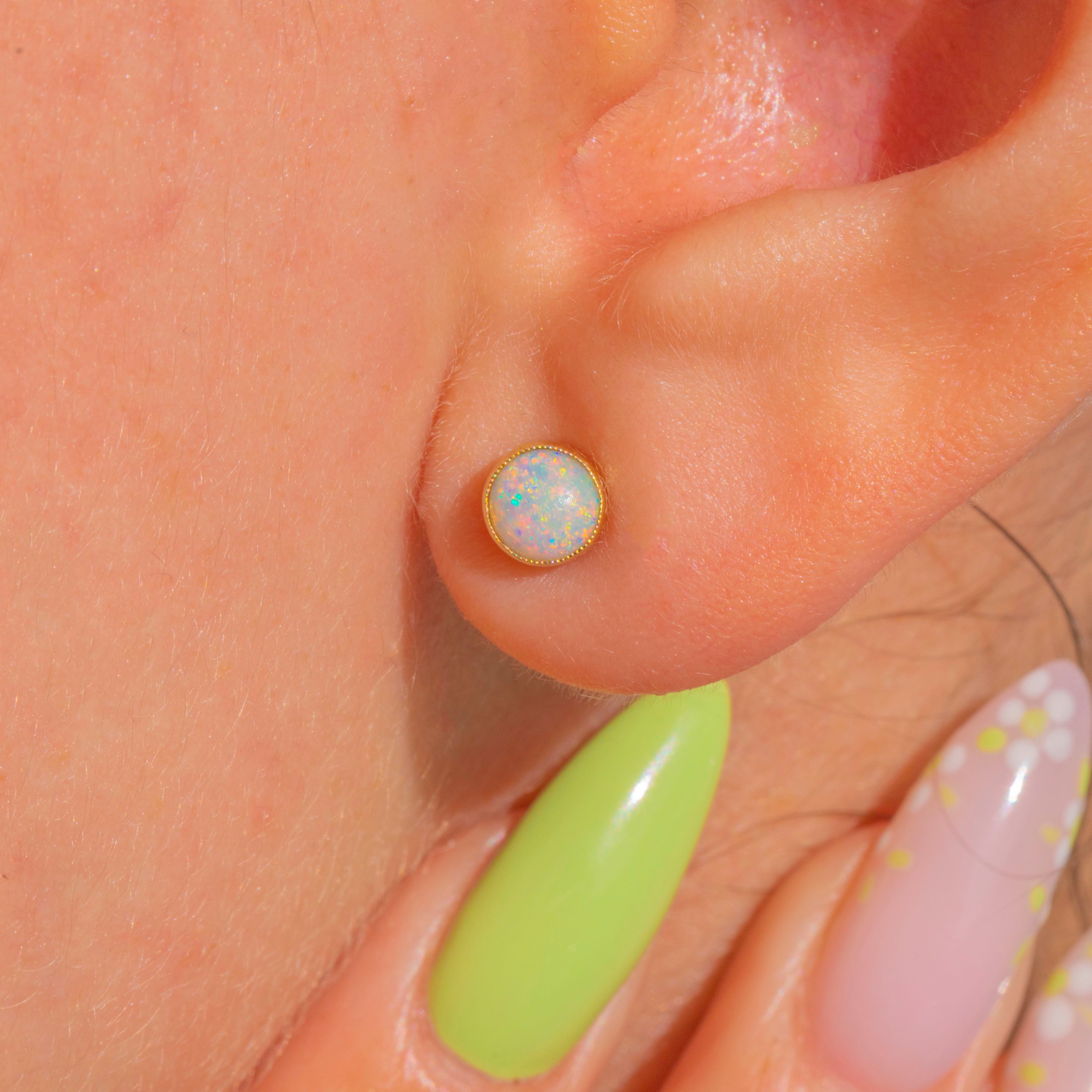 Opals measure 4.5mm in diameter, weighing approximately 0.45ct each.