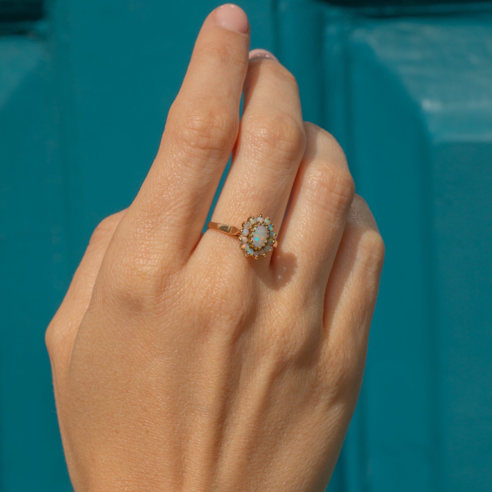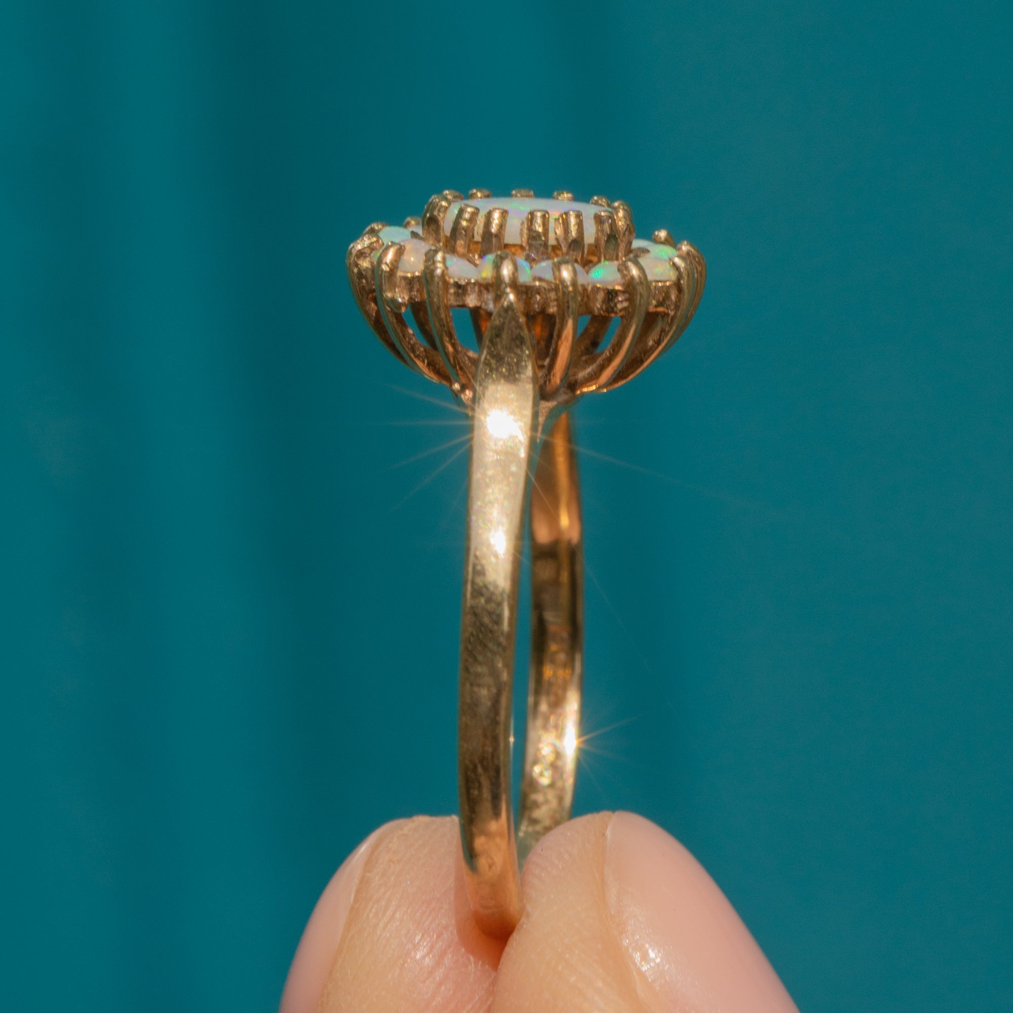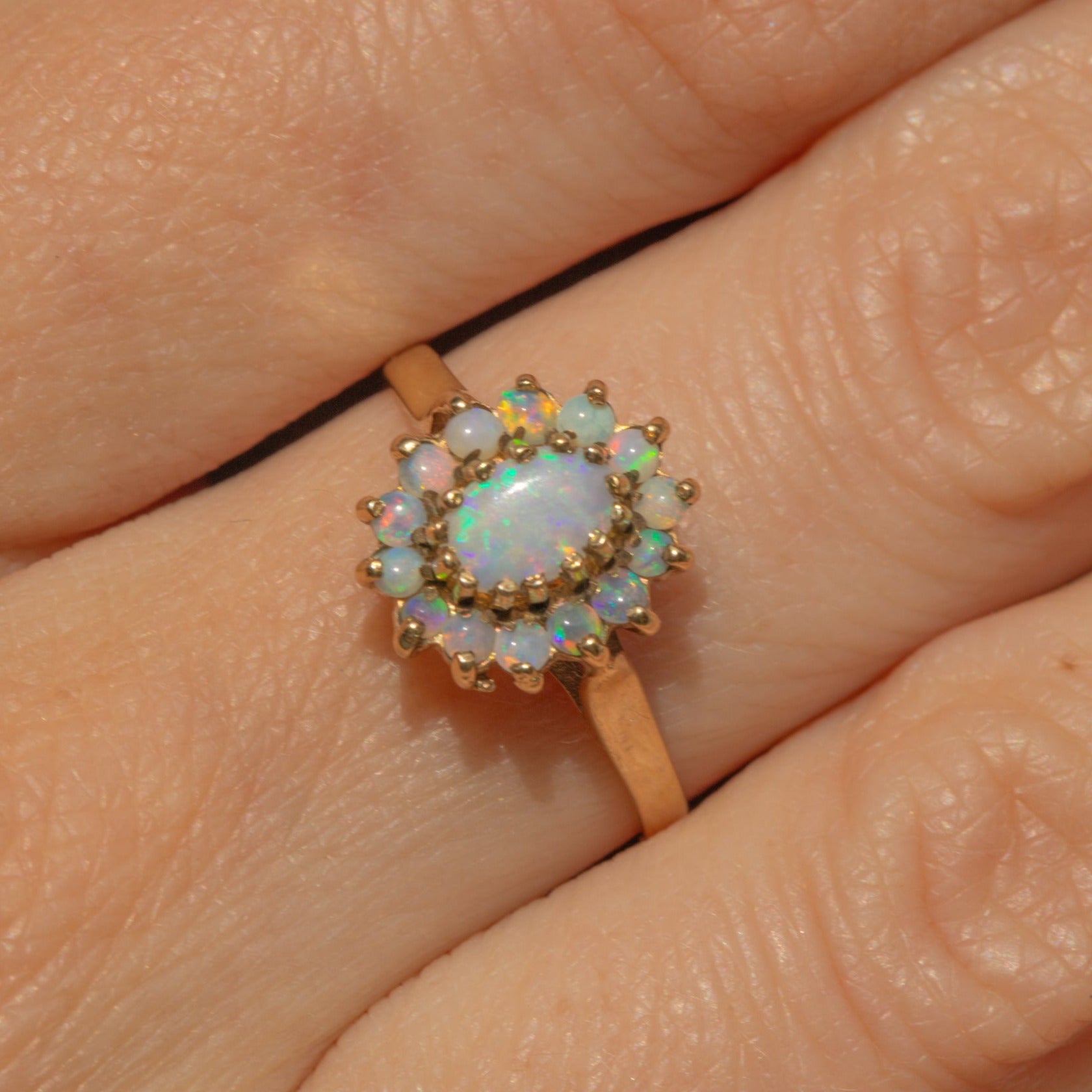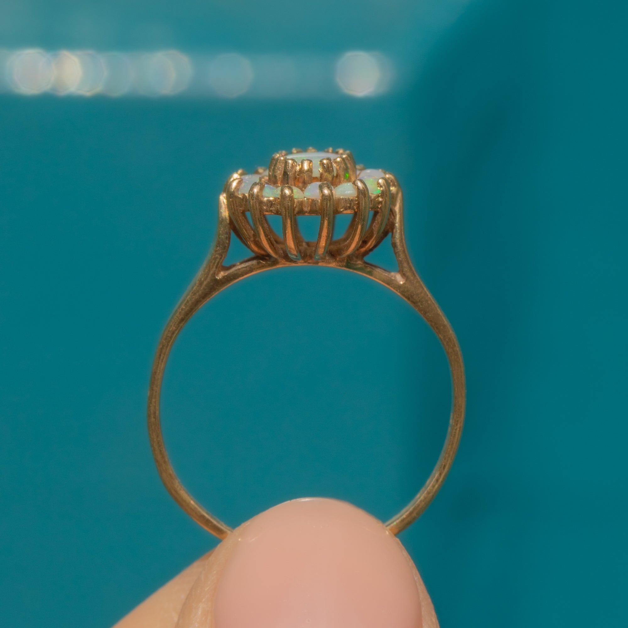 EXCELLENT. This 9ct Gold Opal flower cluster ring is in excellent condition, maintaining its original lustre. The Opals are secure in their setting with a glossy smooth finish. The Gold is buttery and has retained its form well, allowing you to wear it comfortably and securely all day long.
