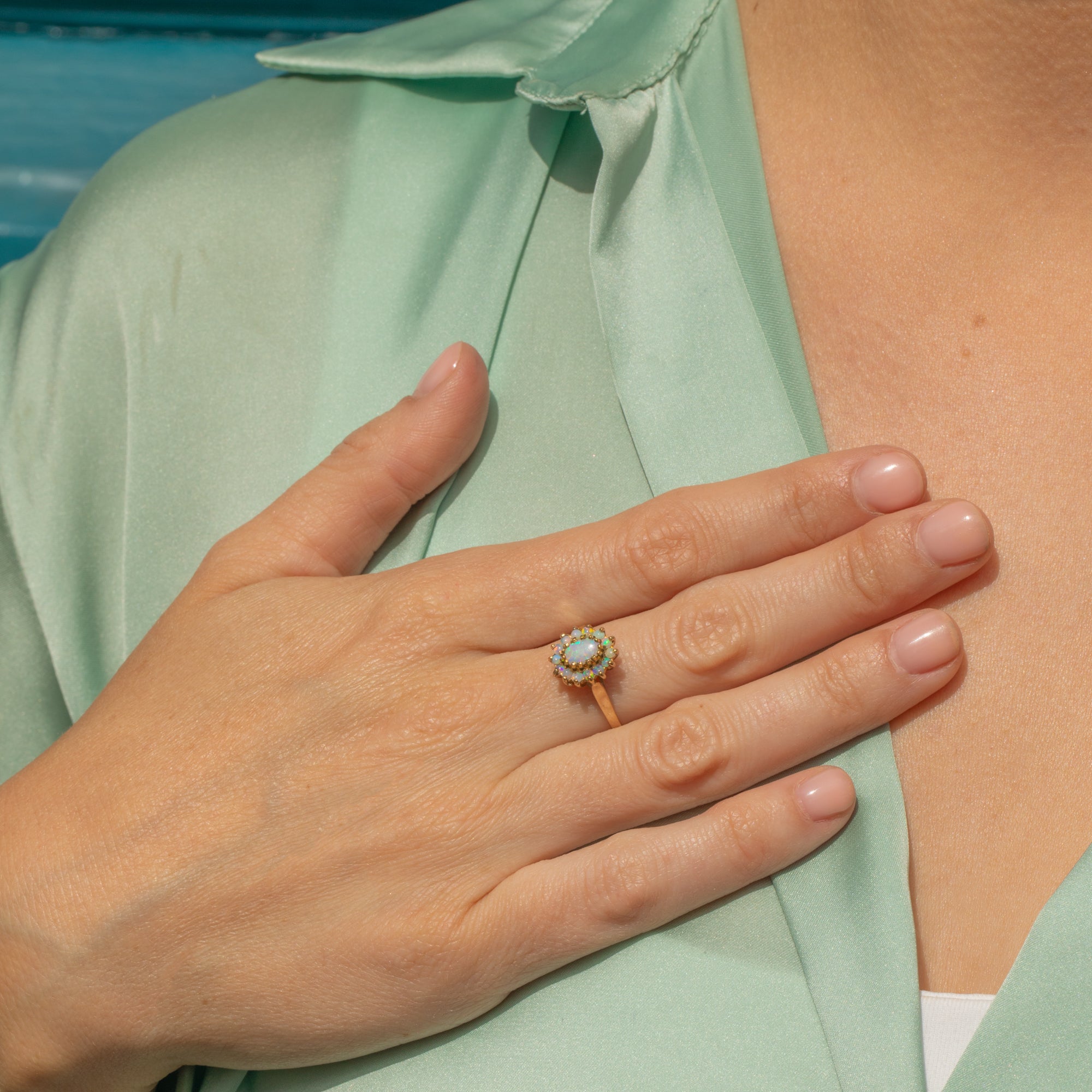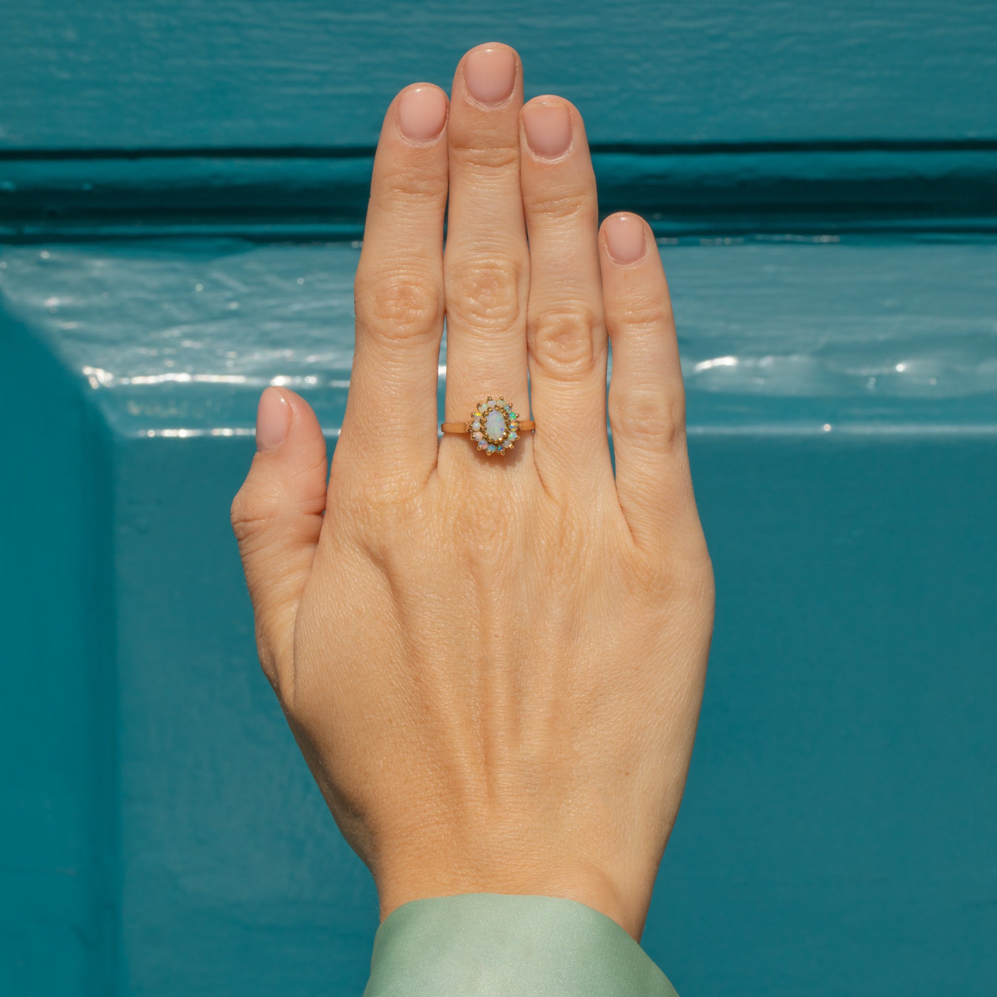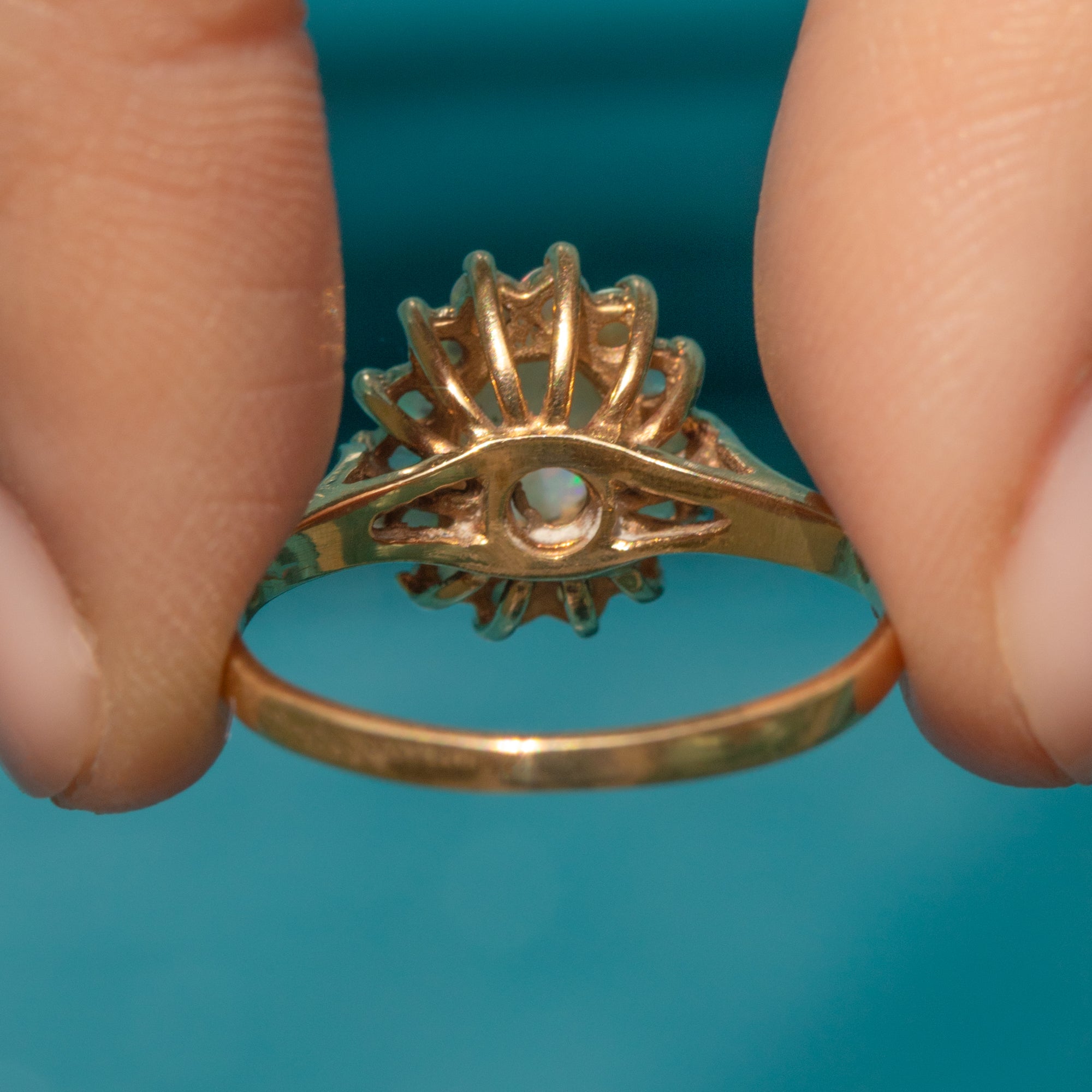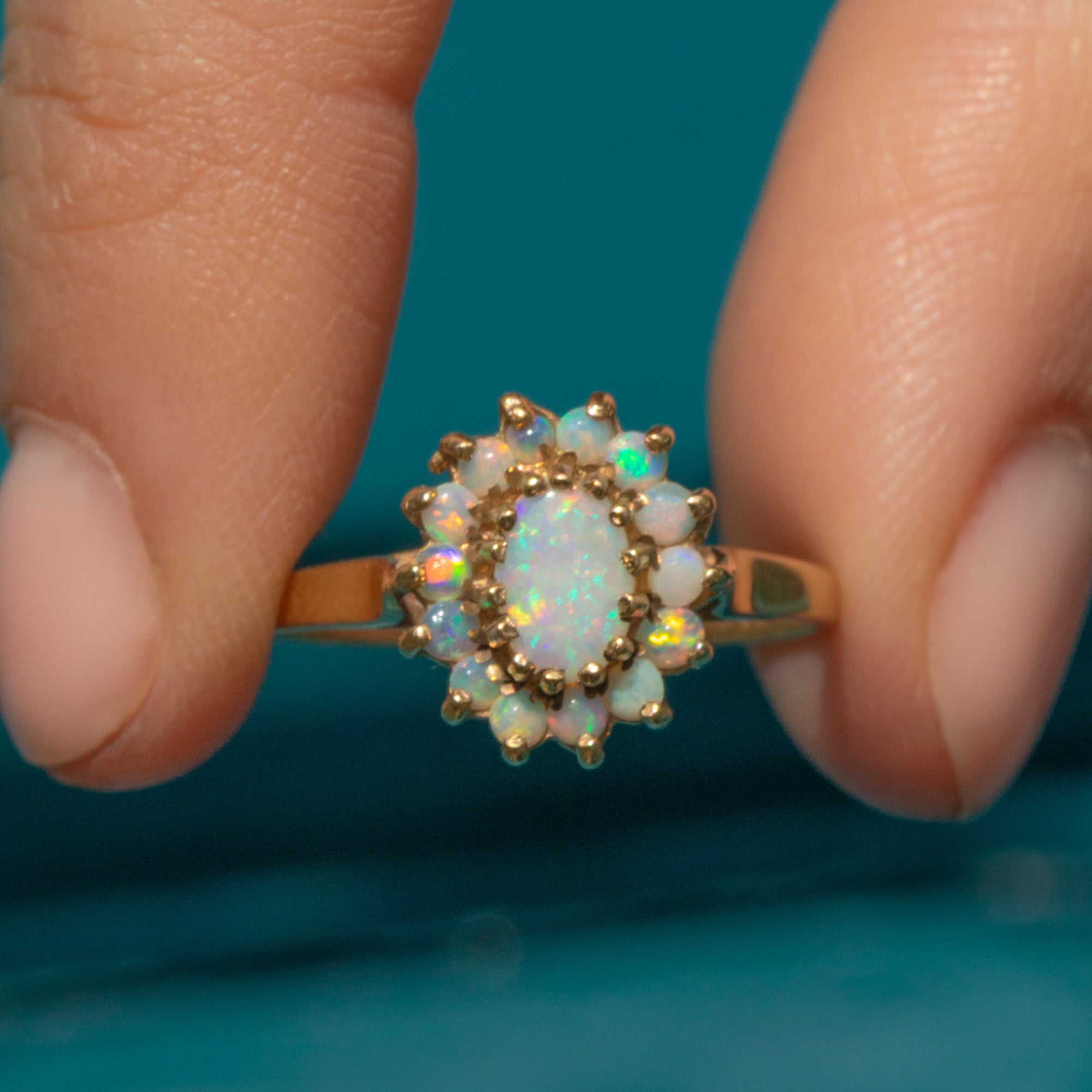 EXCELLENT. This 9ct Gold Opal flower cluster ring is in excellent condition, maintaining its original lustre. The Opals are secure in their setting with a glossy smooth finish. The Gold is buttery and has retained its form well, allowing you to wear it comfortably and securely all day long.