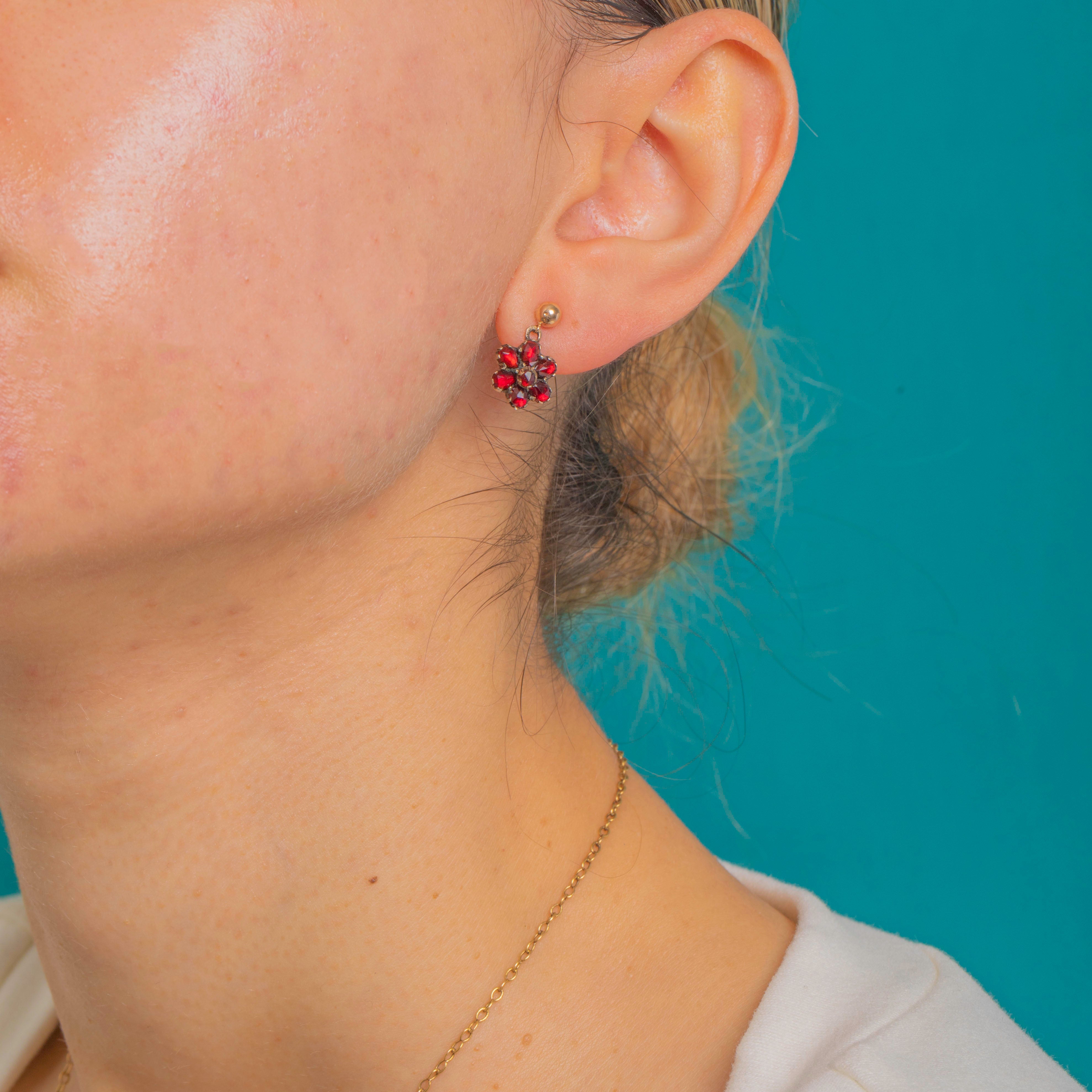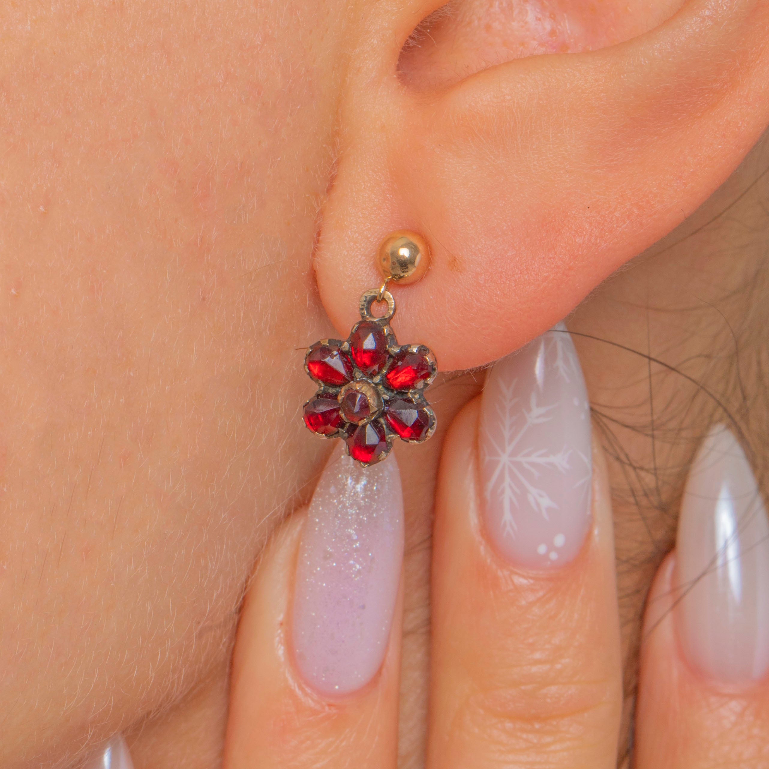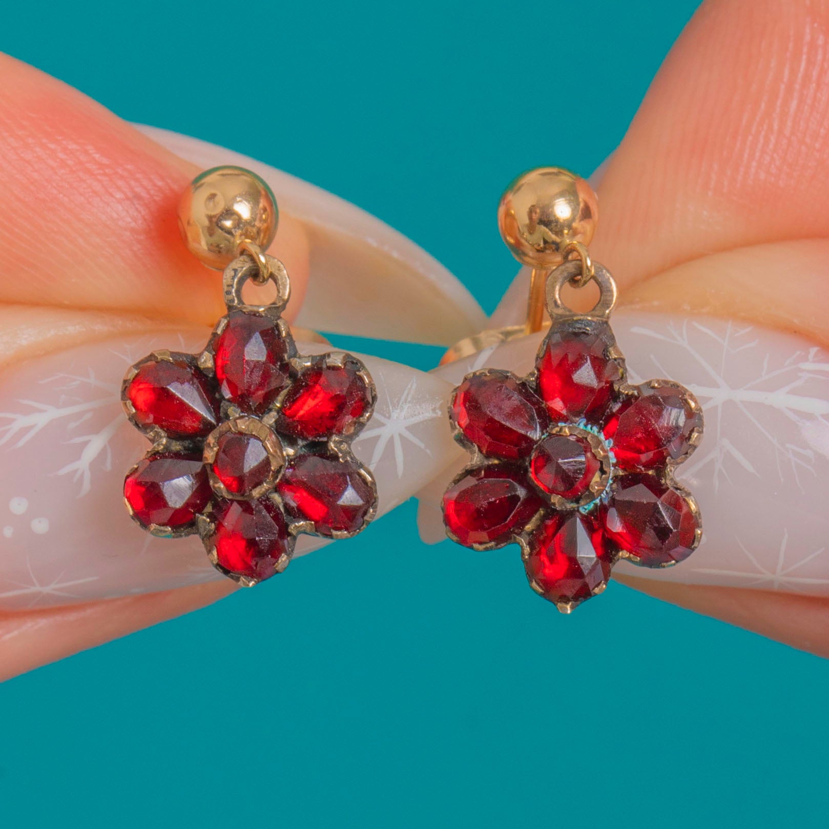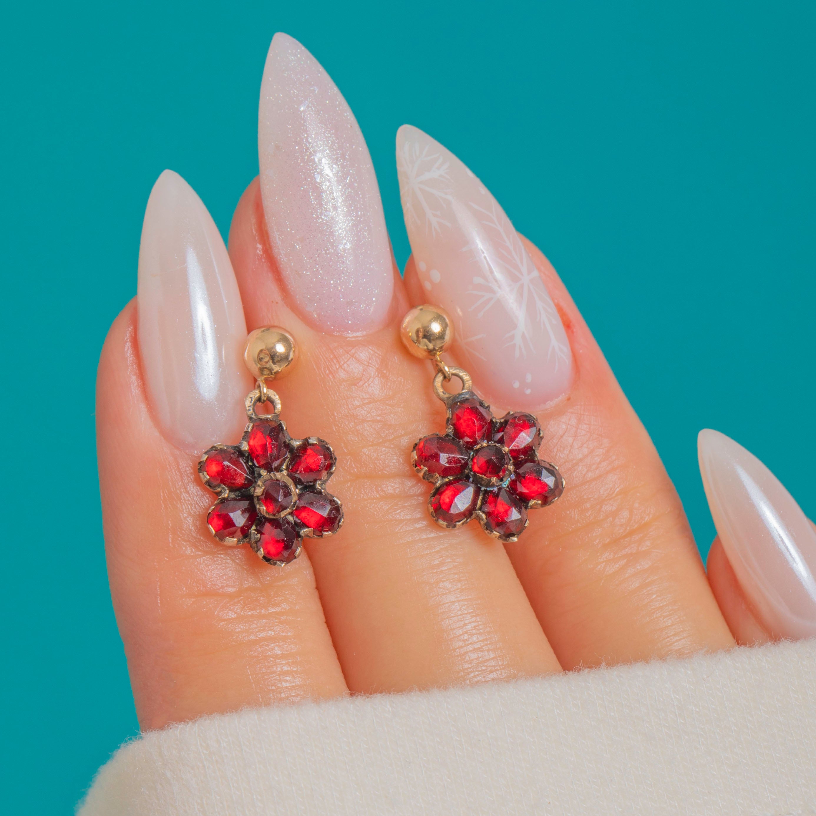 Petite Victorian charm meets romantic colour in these antique Garnet flower drops. Each rosette is set with richly hued deep red Bohemian Garnets arranged around a central stone, their crimped, closed-back collets showing a gentle, time-worn patina that beautifully amplifies the glow of the stones. The sweetly scaled, articulated design gives a delicate flicker of movement with every turn.