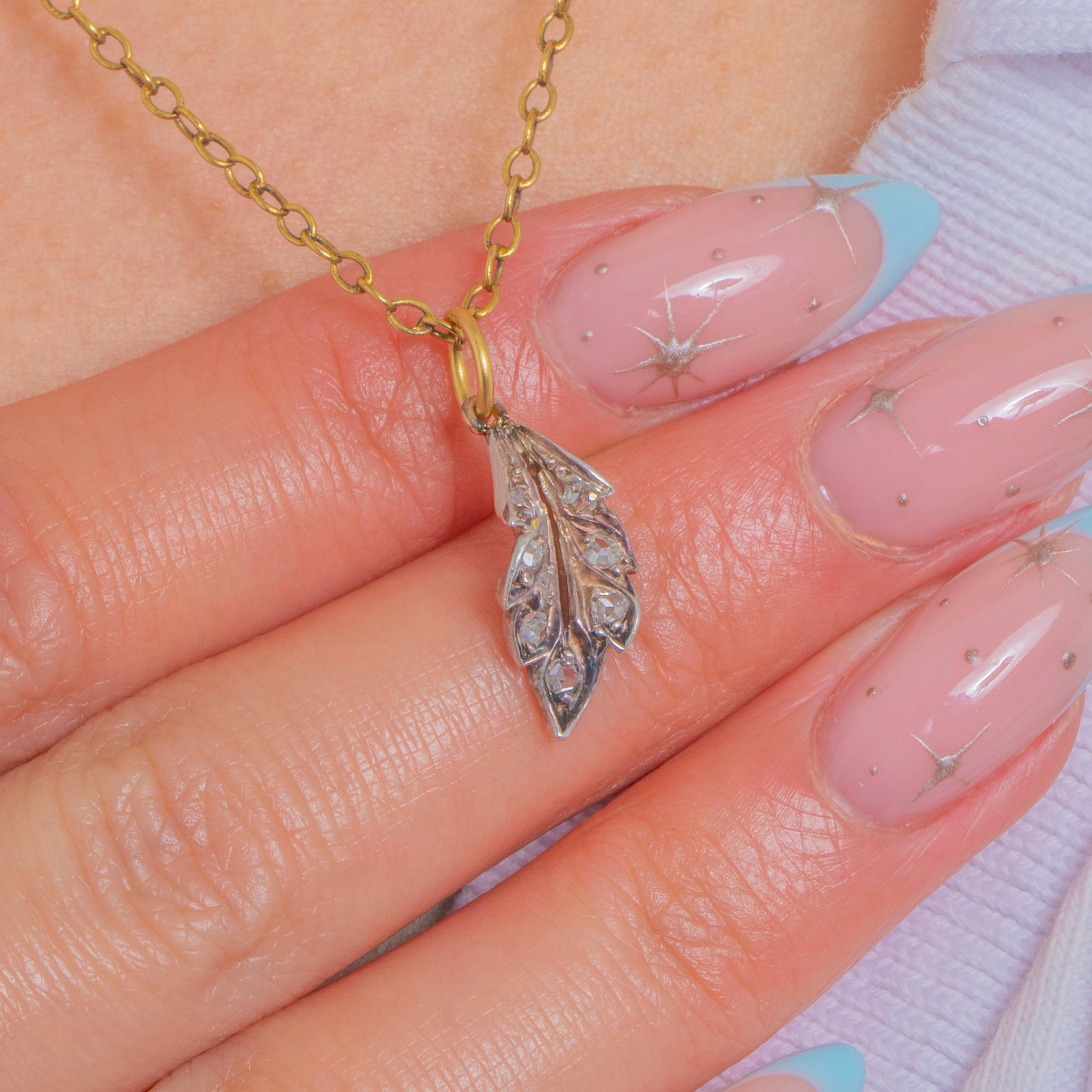 A perfectly dainty Victorian leaf charm, set with glittering rose-cut Diamonds that catch the light with that unmistakable old-world sparkle. With its elegant, nature-inspired silhouette, it’s the kind of piece that adds instant character—whether worn solo on a fine chain or layered into a curated charm story.