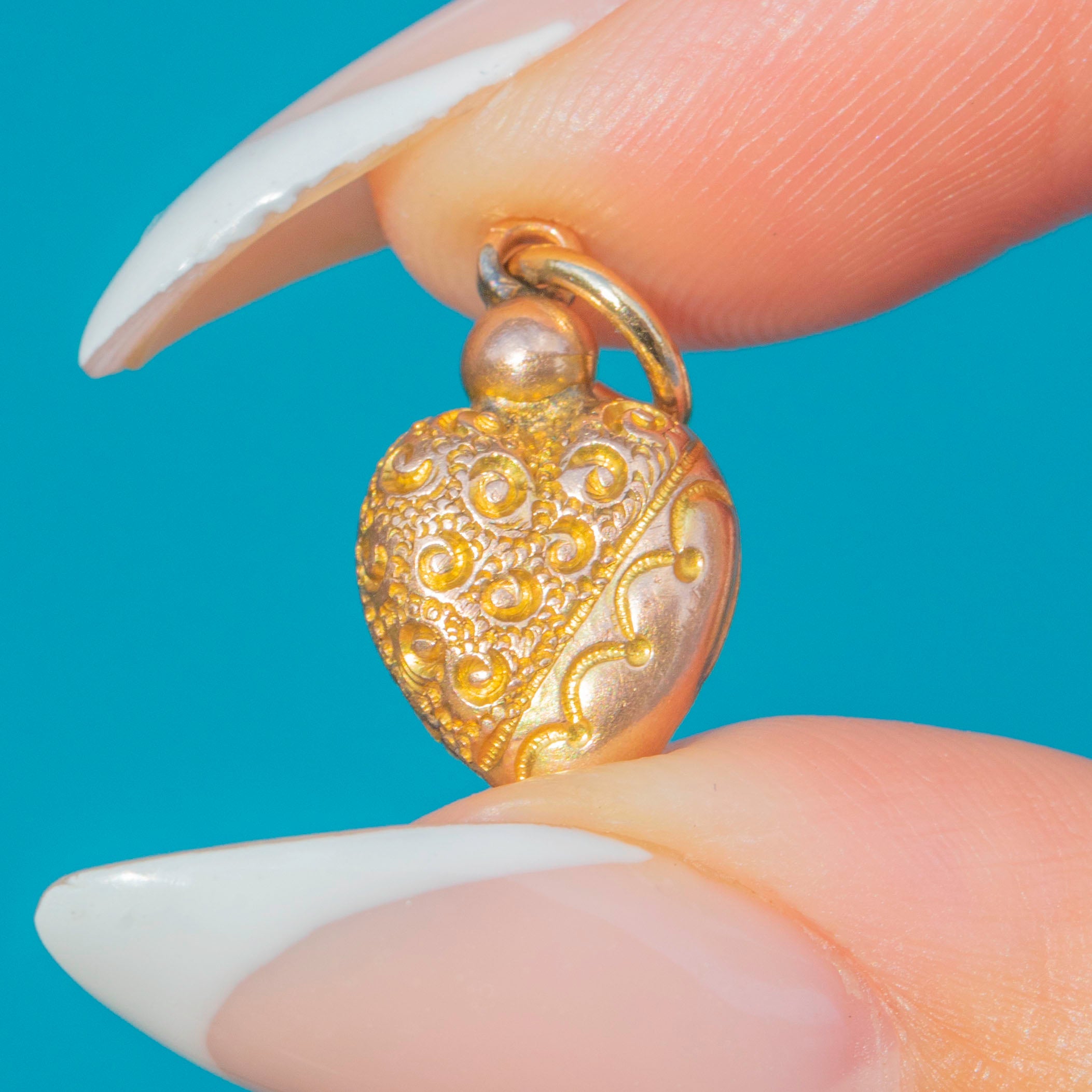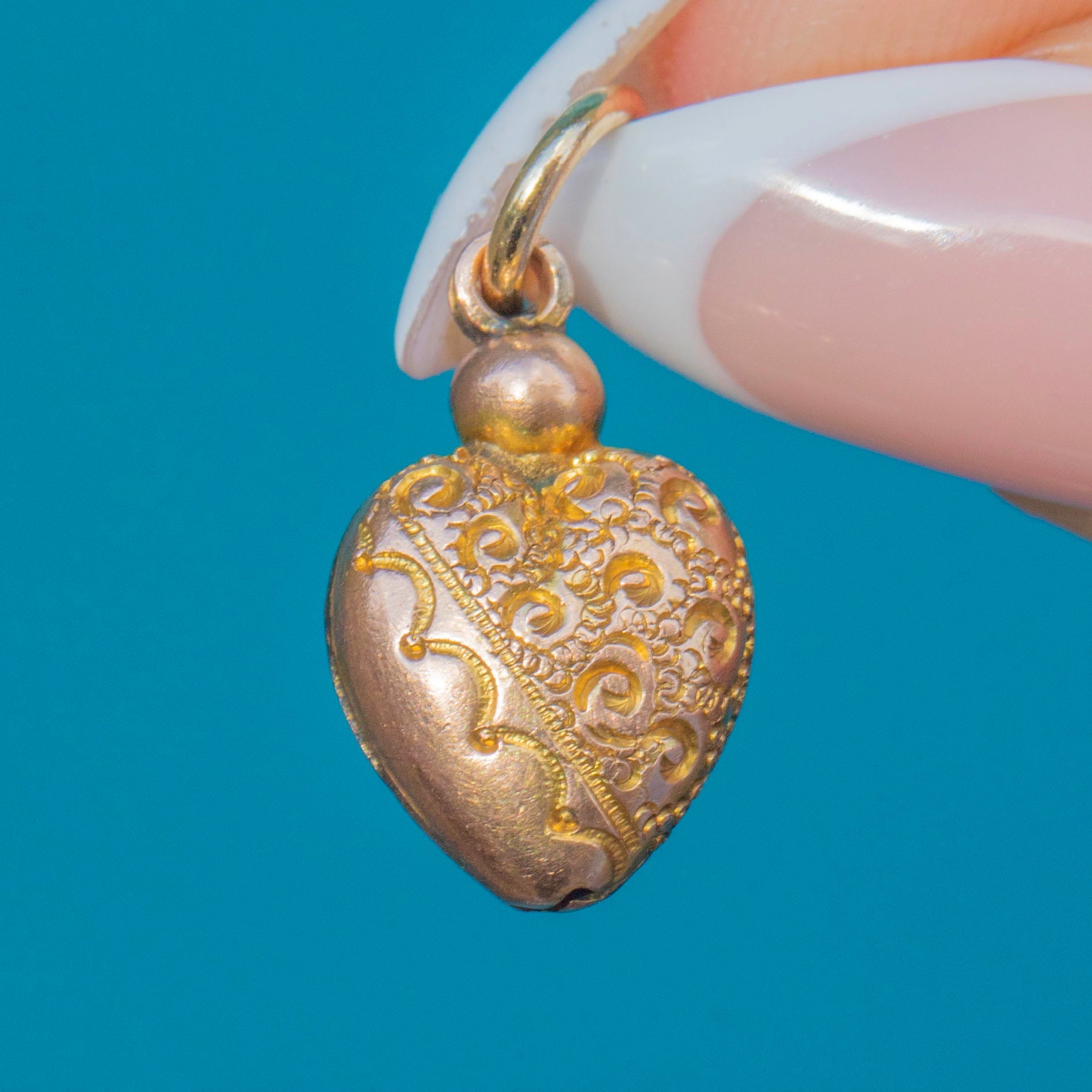 This dainty Victorian heart pendant is a sweet and romantic jewel. Crafted in 9ct Gold, the front is decorated with ornate repoussé detailing, adding texture and depth to the warm Gold surface. Heart charms were much loved in the Victorian era as sentimental tokens of love and devotion, and this petite example captures that symbolism beautifully.