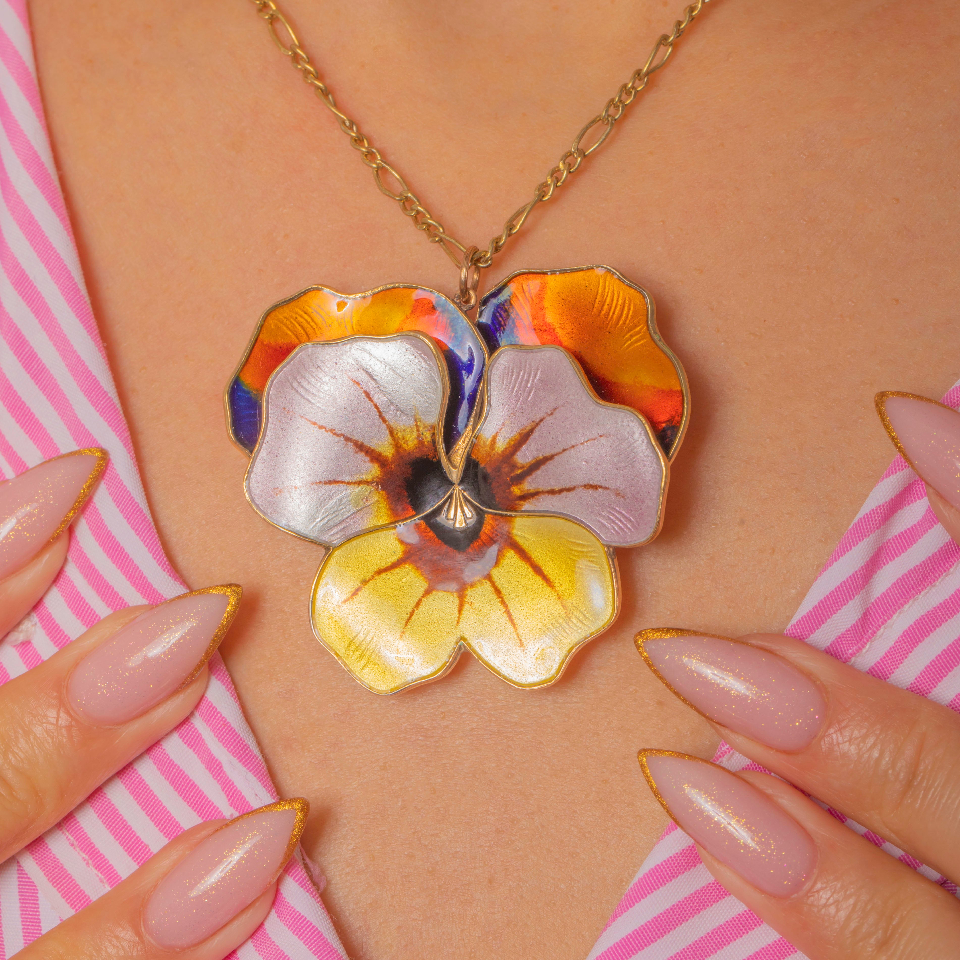 This exquisite mid-century pansy pendant showcases the bold colour and craftsmanship that made the David Andersen world-famous. Formed in solid Sterling Silver- (cleverly gilded with Gold on the reverse to avoid tarnishing!), its lifelike petals are painted with layers of translucent Enamel in glowing orange, soft pink and lemon yellow — each shaded by hand to create a luminous, naturalistic finish.