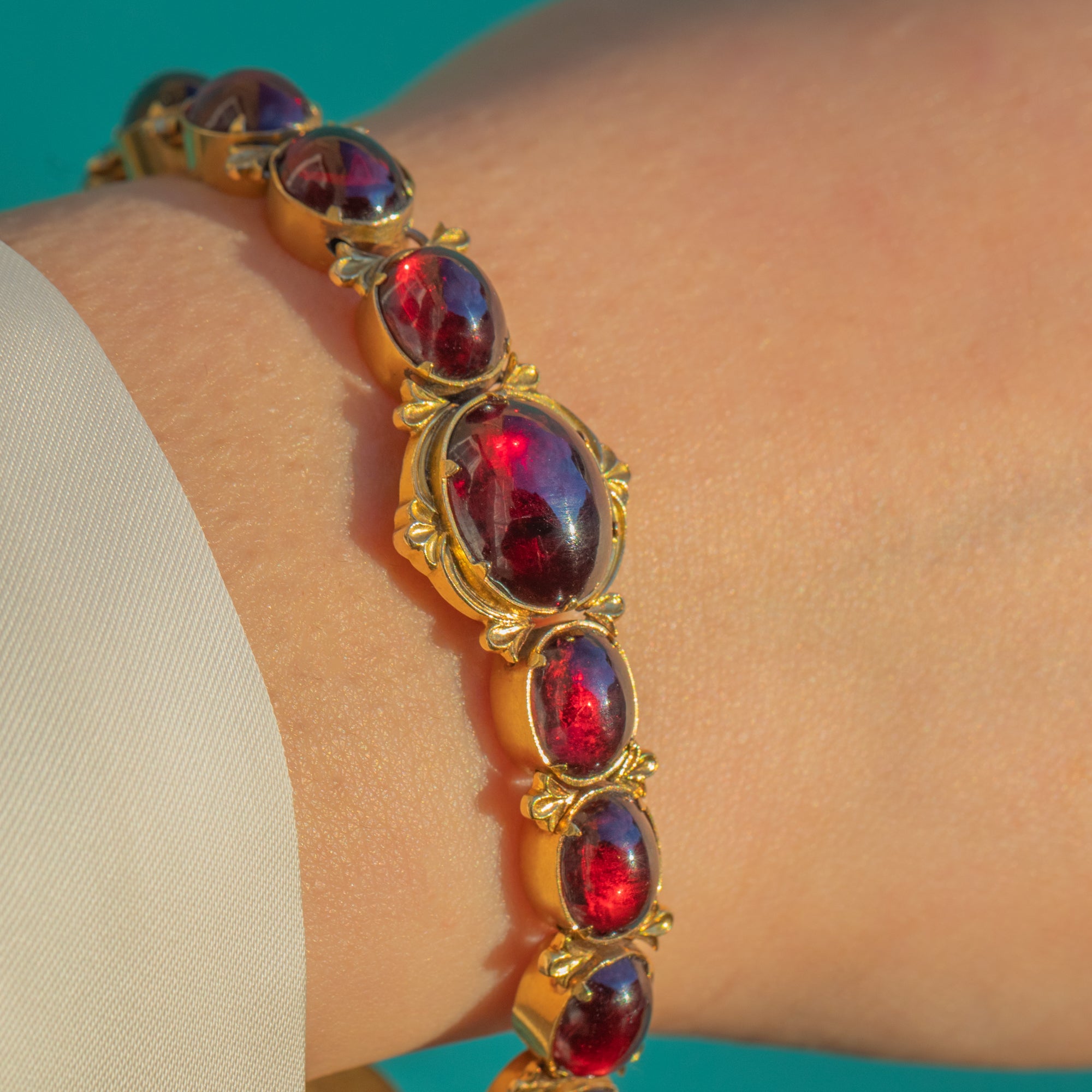 Each Garnet showcases its deep wine-red hue, the links articulated for an elegant, fluid drape. A neat push-in box clasp completes the design, true to the period and wonderfully wearable today—an antique treasure with timeless allure.