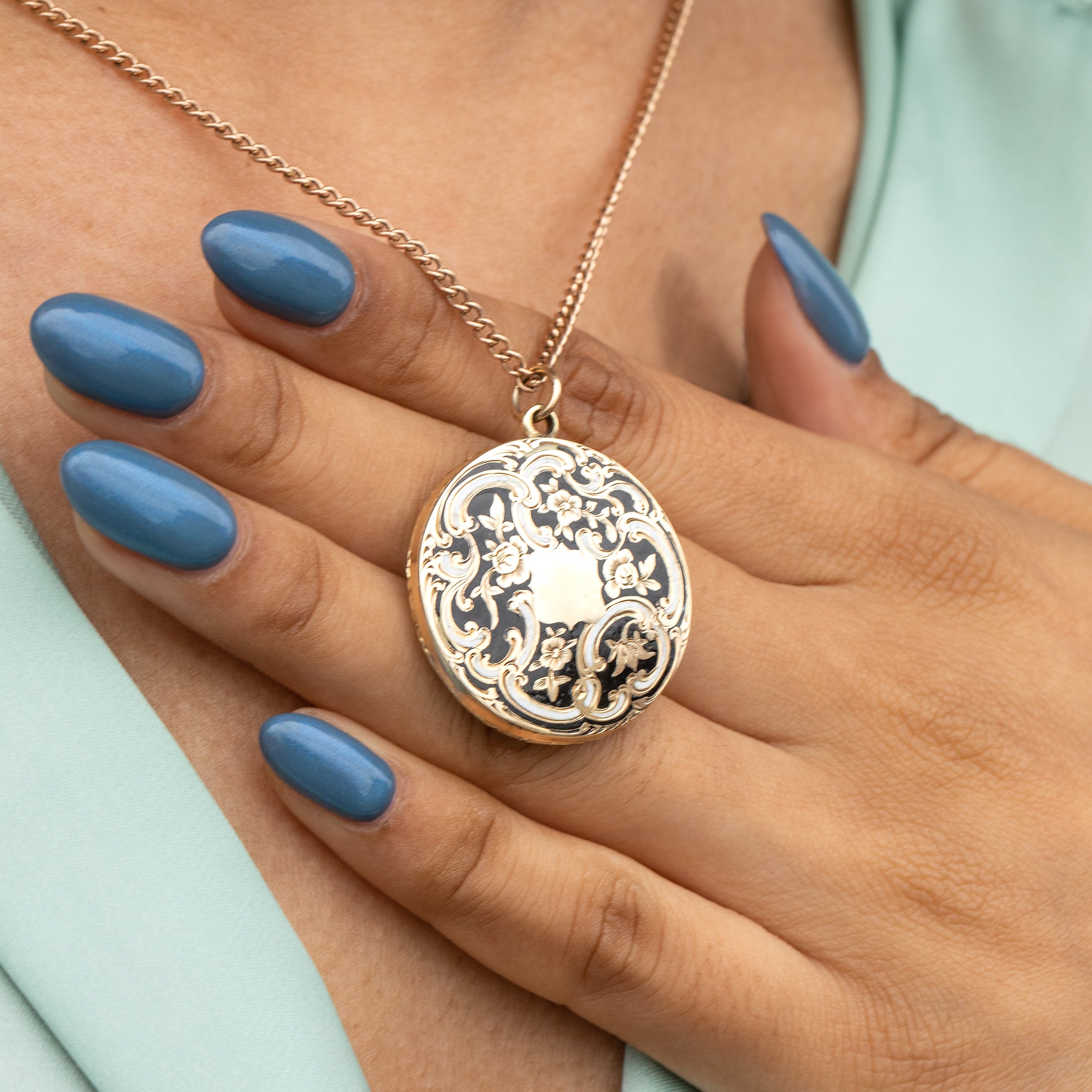 The front of the locket features ornately engraved florals backed by black Enamel with sweeping lines inlaid with white Enamel, framing the blank cartouche in the centre. This undeniably feminine piece is the perfect size for daily wear and will make an impact wherever she goes!