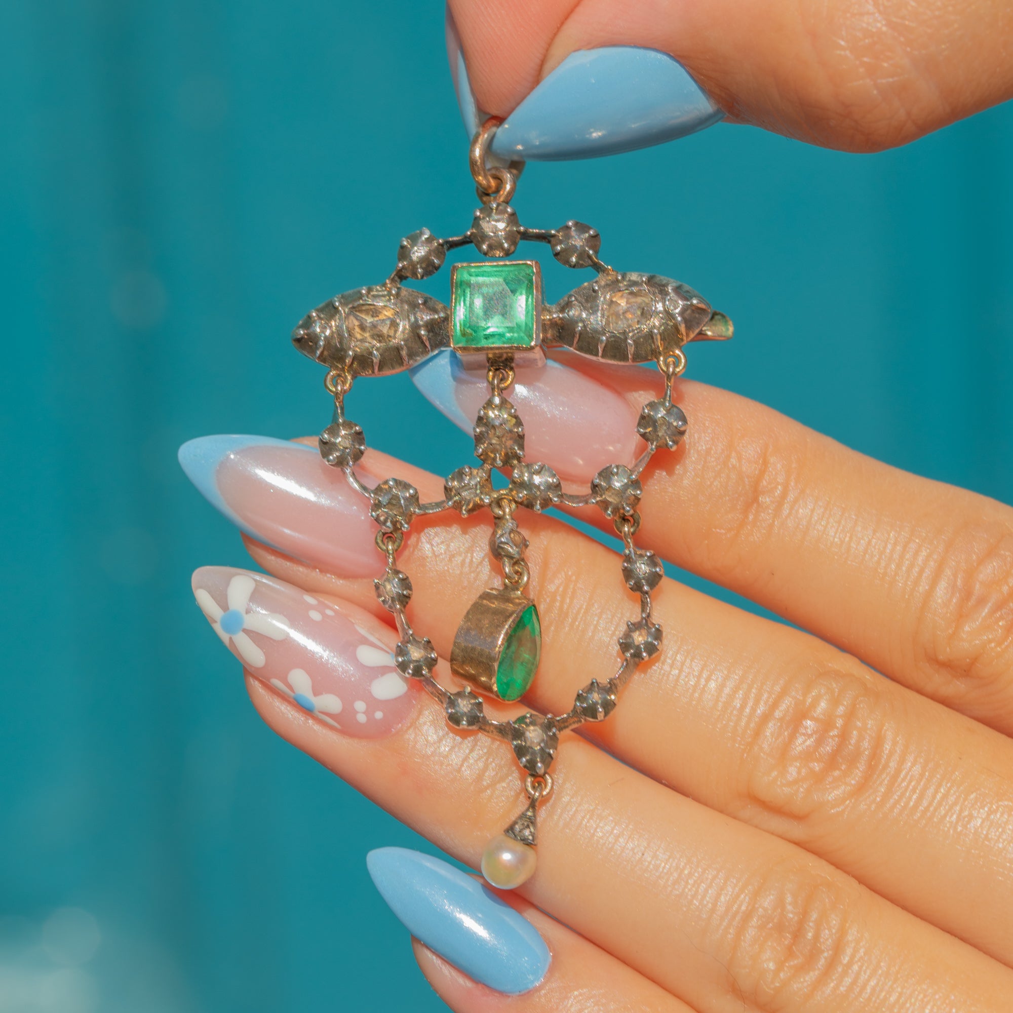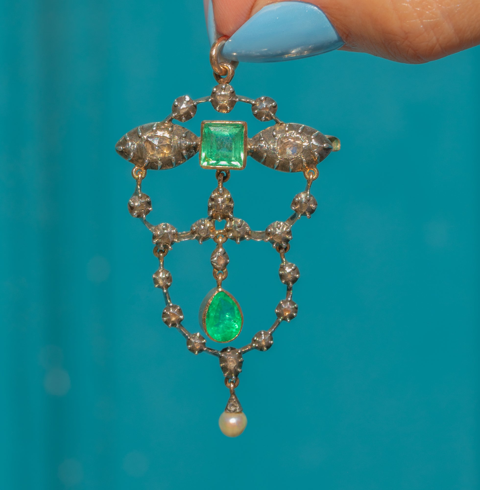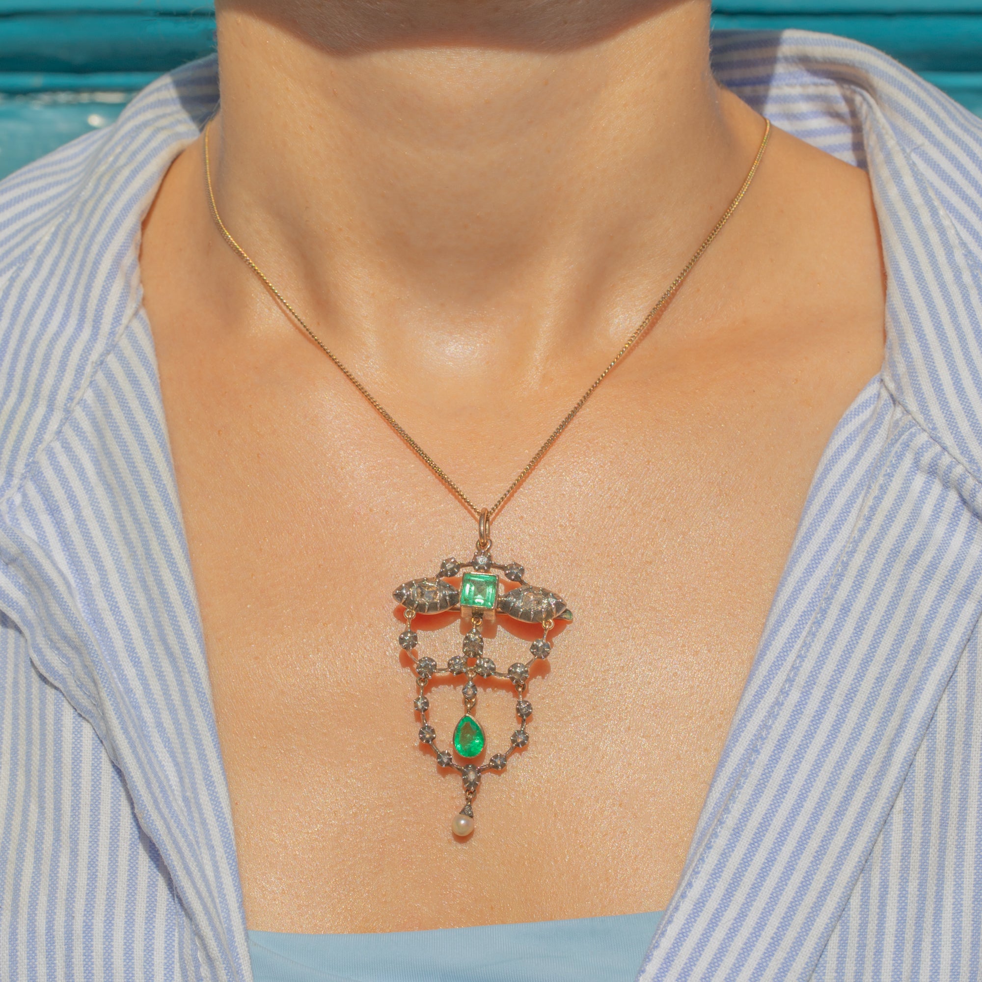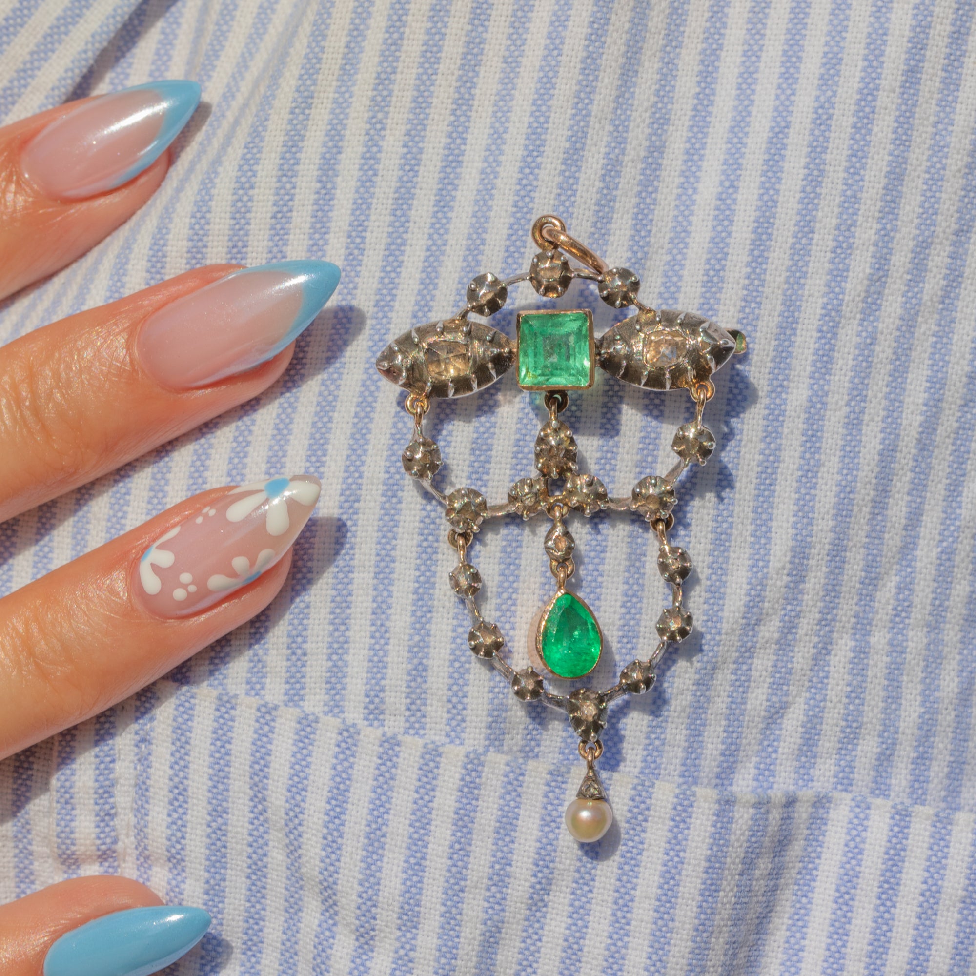 Crafted from 18ct Gold and Silver, as was typical of the Victorian era, this pendant displays 1.45cts of vibrant Emeralds, one with a regal square-cut and the other a delicate pear-cut, and rose-cut Diamonds in traditional piecrust settings, with an enchanting Pearl accent at the base of the drop.