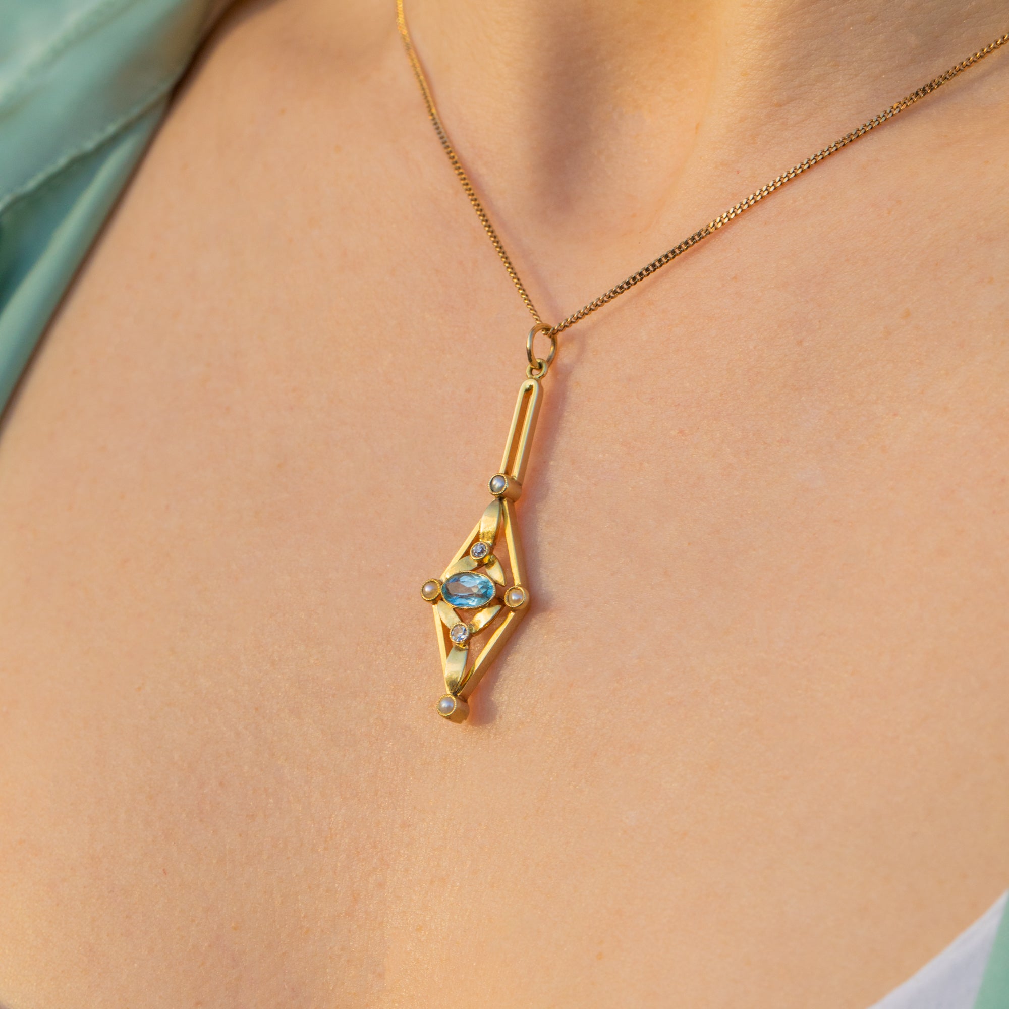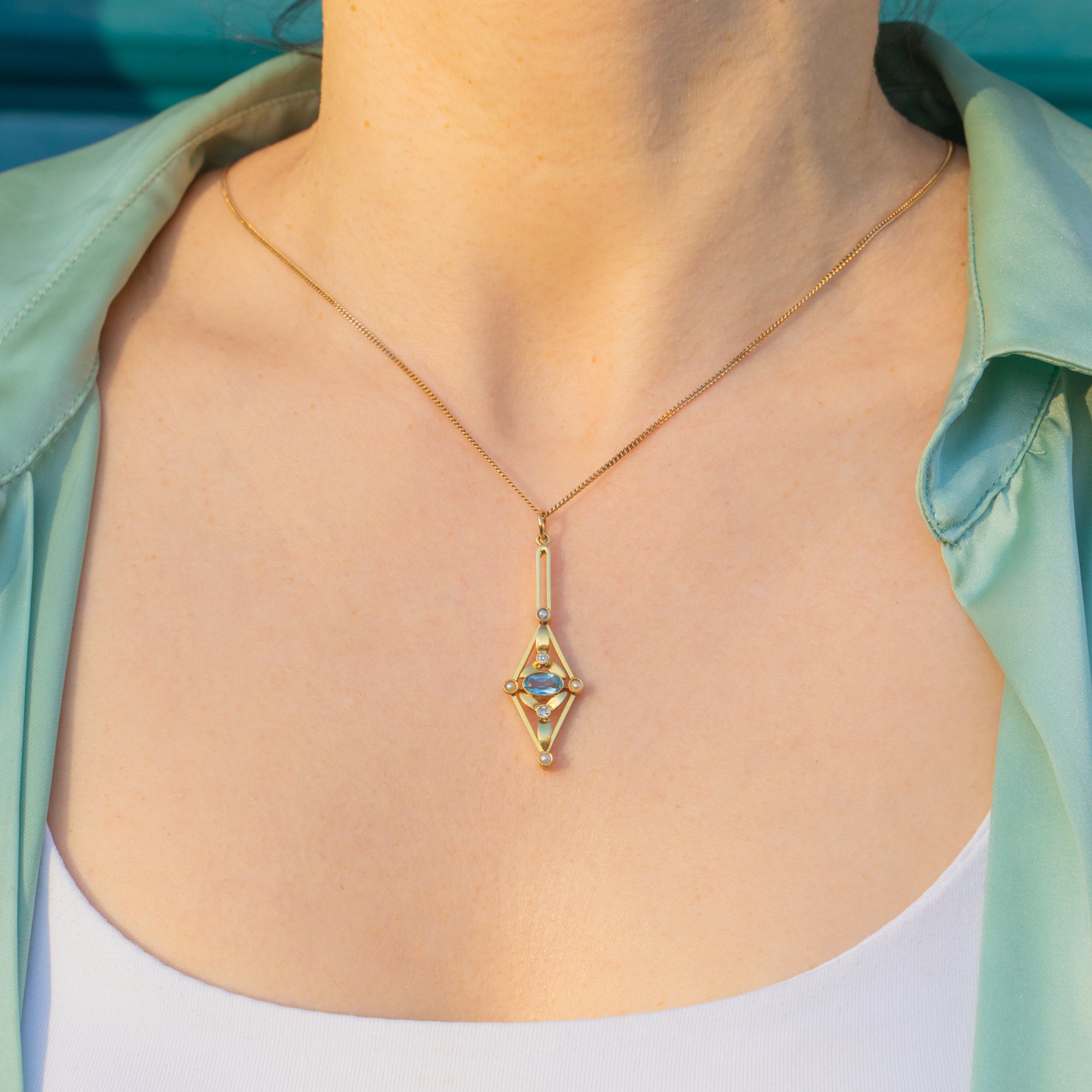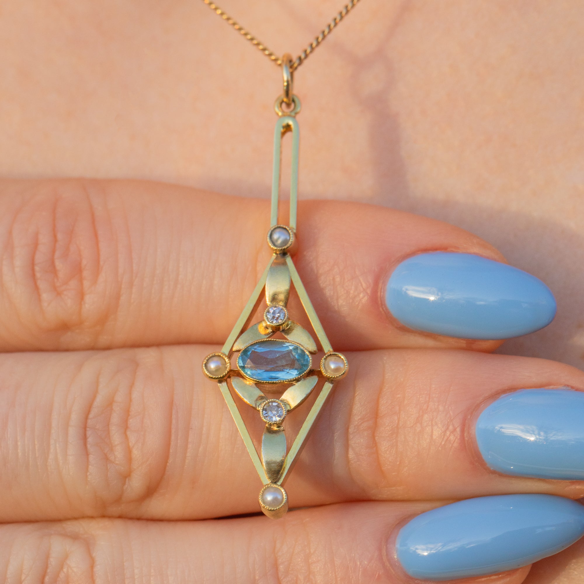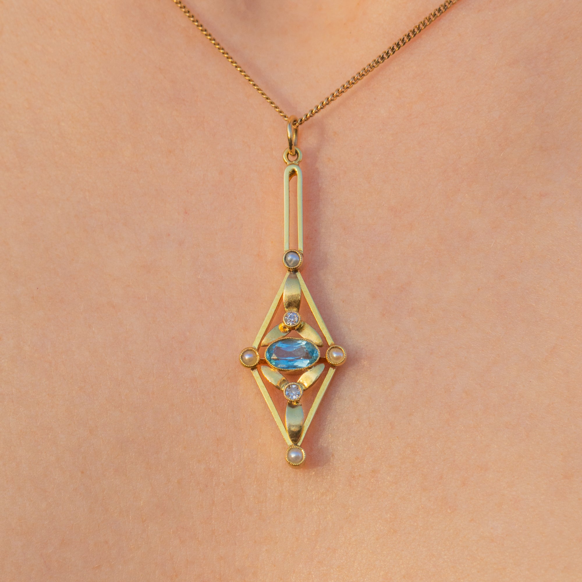 Made from a sumptuous 15ct Gold, this Edwardian pendant has been formed into a distinctive lozenge shape and is set with an icy blue Aquamarine, plump Pearls, and dainty Diamonds creating an eye-catching display under the light!