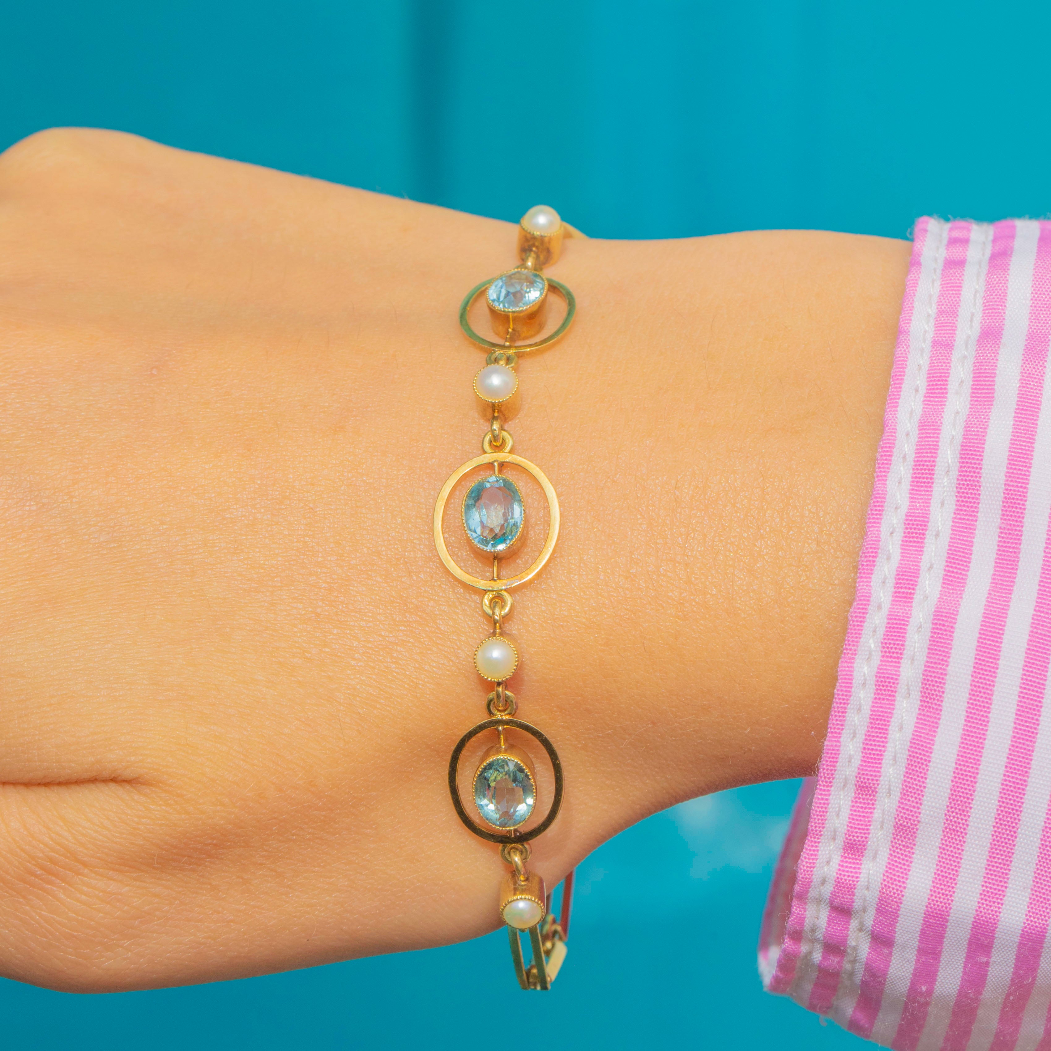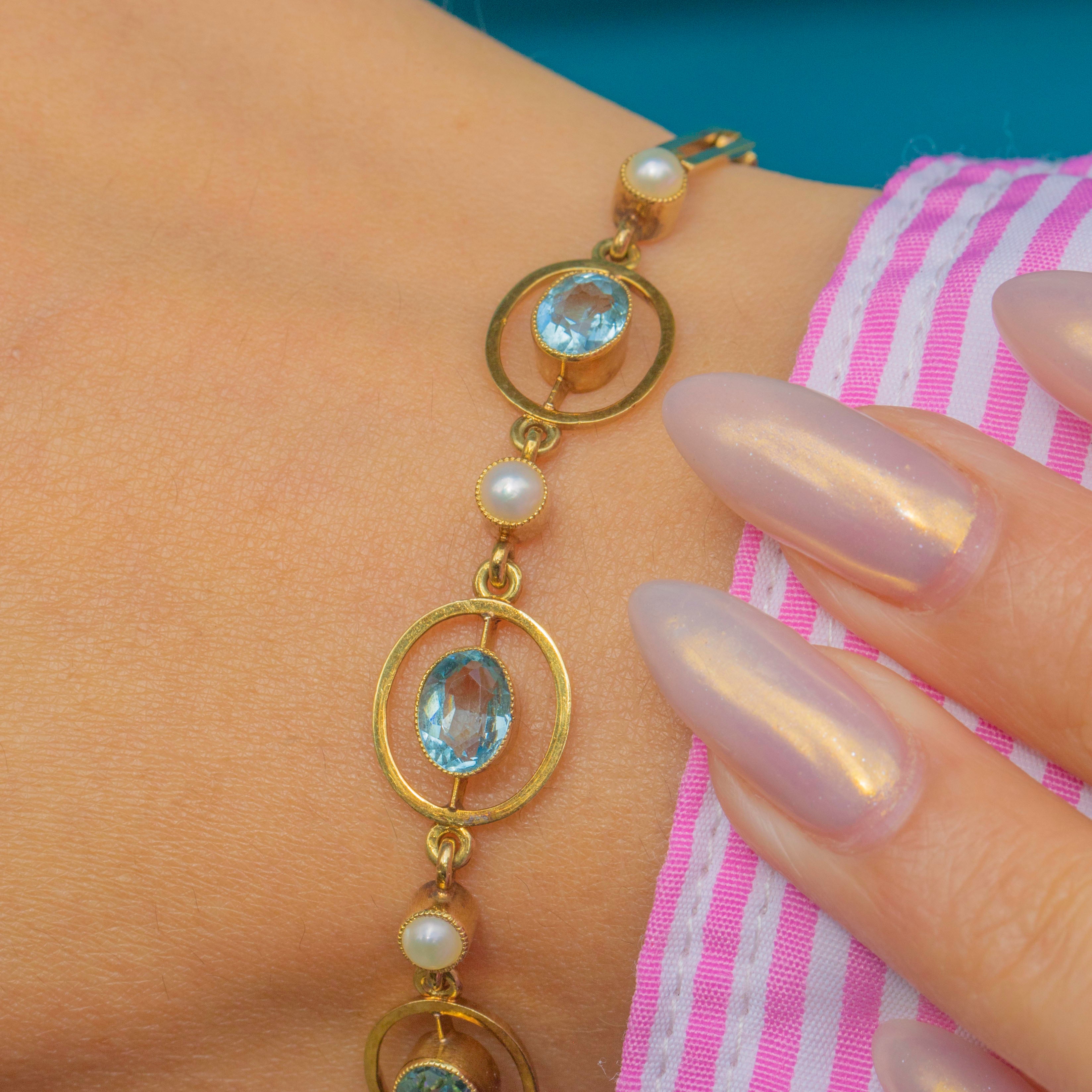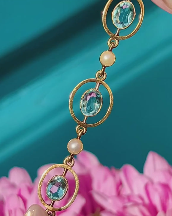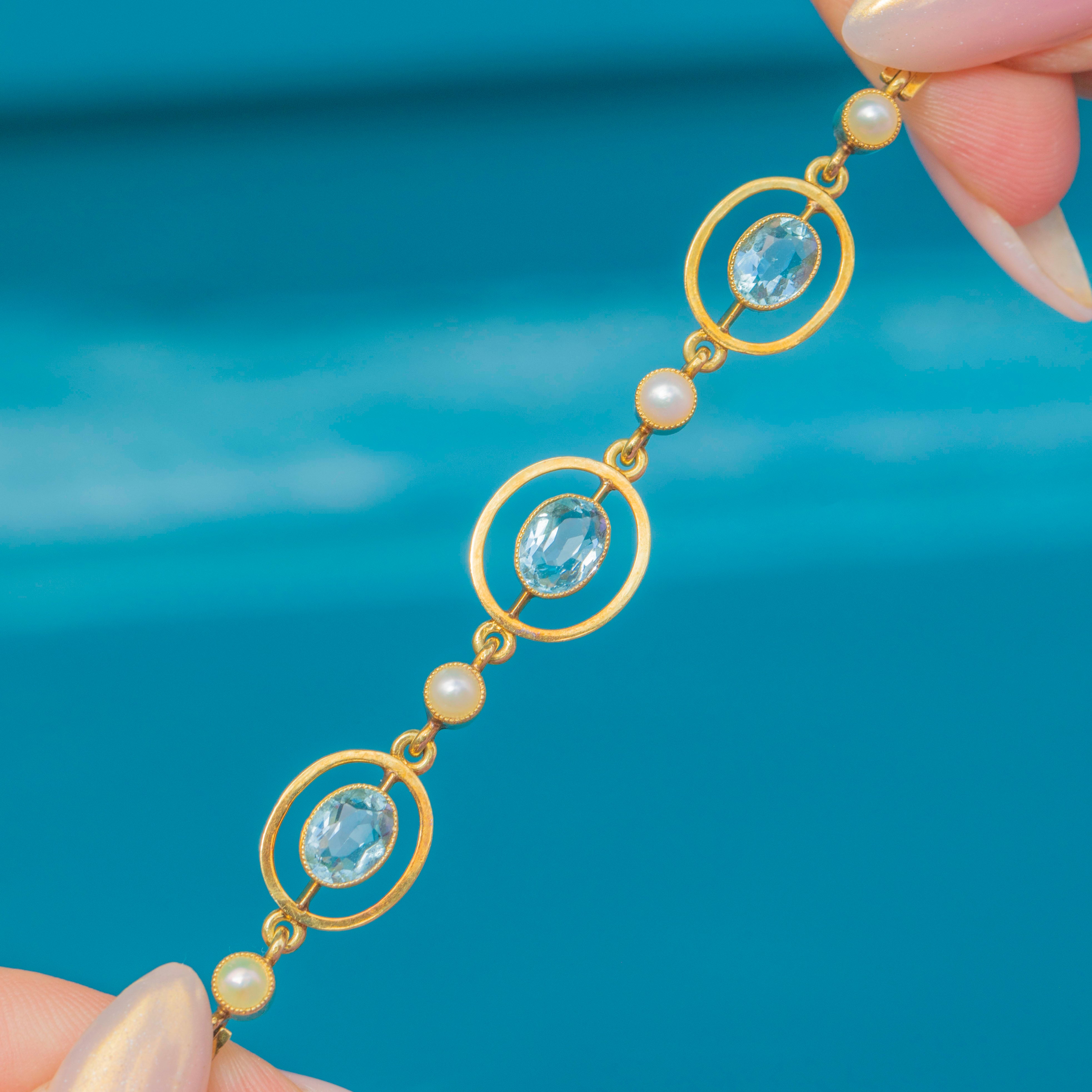 Edwardian 15ct Gold Aquamarine Pearl Bracelet c.1900