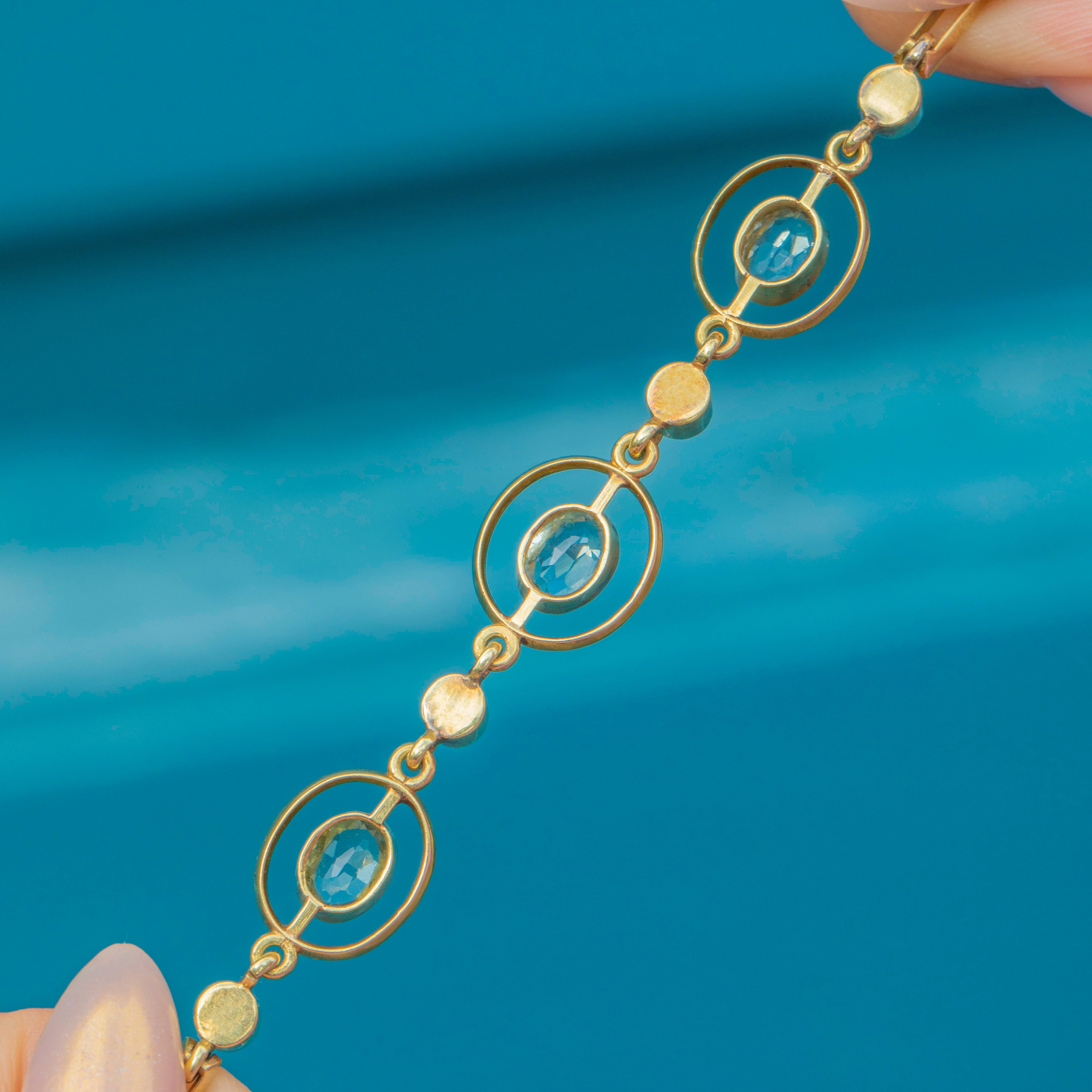 This beautiful Edwardian bracelet is crafted in rare 15ct Gold and set with a trio of bright oval Aquamarines, each framed in an elegant open oval “target” style. Between them sit lustrous creamy Pearls, creating a delicate rhythm of colour and texture across the wrist. The design is refined yet distinctive, combining soft blue with glowing Gold in a way that feels timelessly graceful.