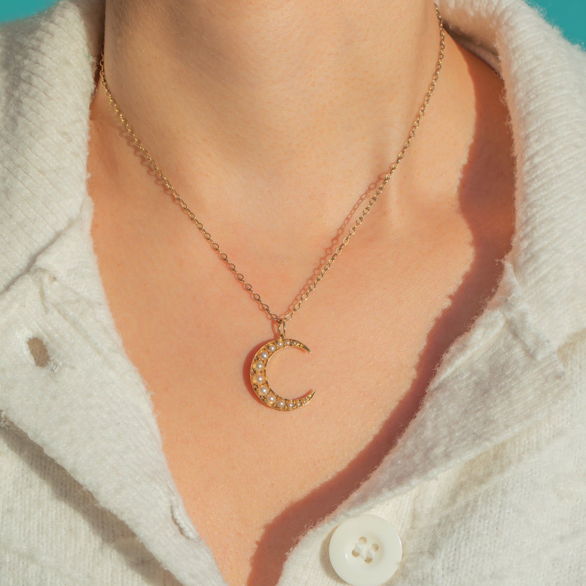 Beautifully crafted and wonderfully wearable, the crescent is fitted with an 18ct Gold jump ring so it’s ready to suspend from your favourite chain. A lovely detail for antique lovers: the reverse shows subtle evidence that this piece once began life as a small lace-pin, while the front presents perfectly.