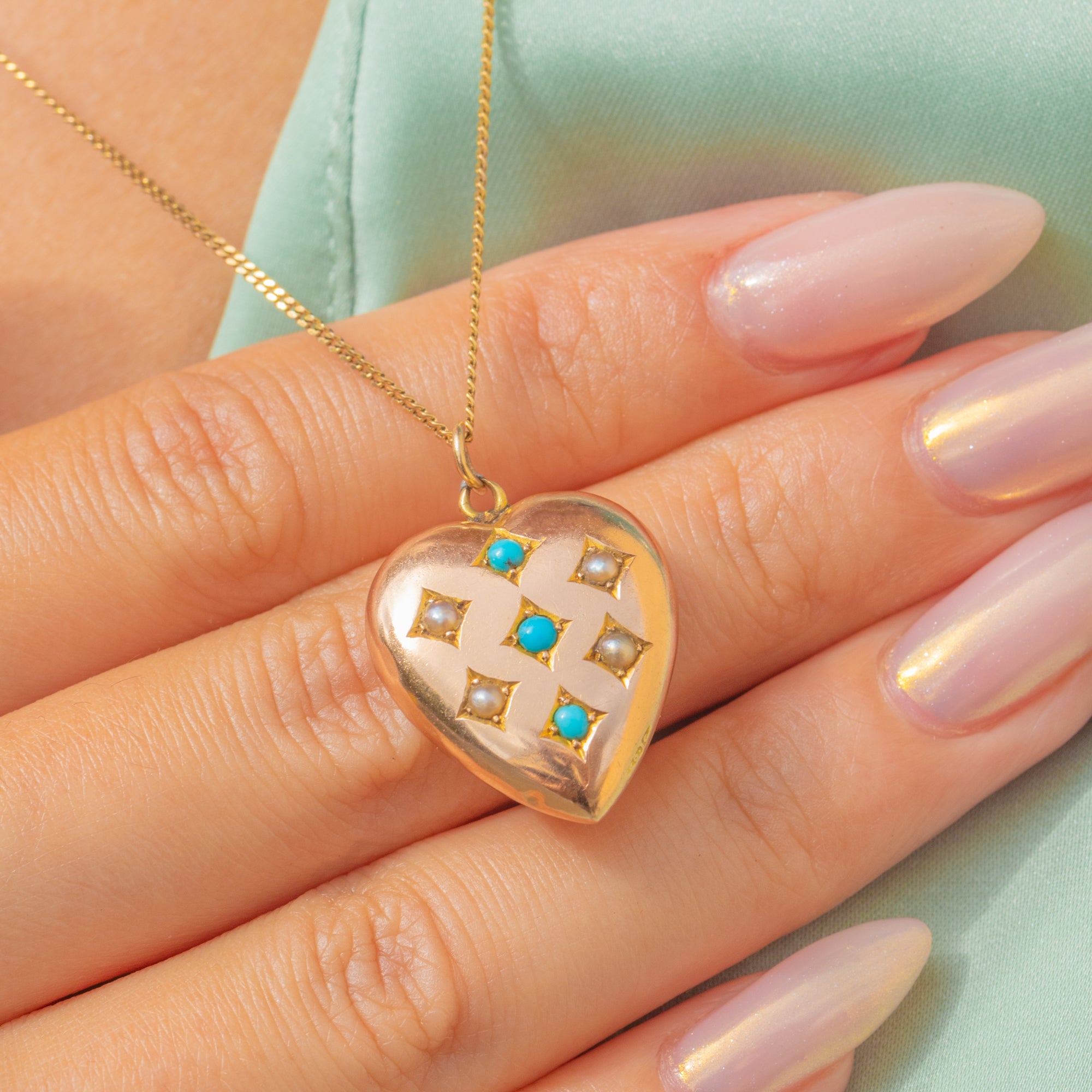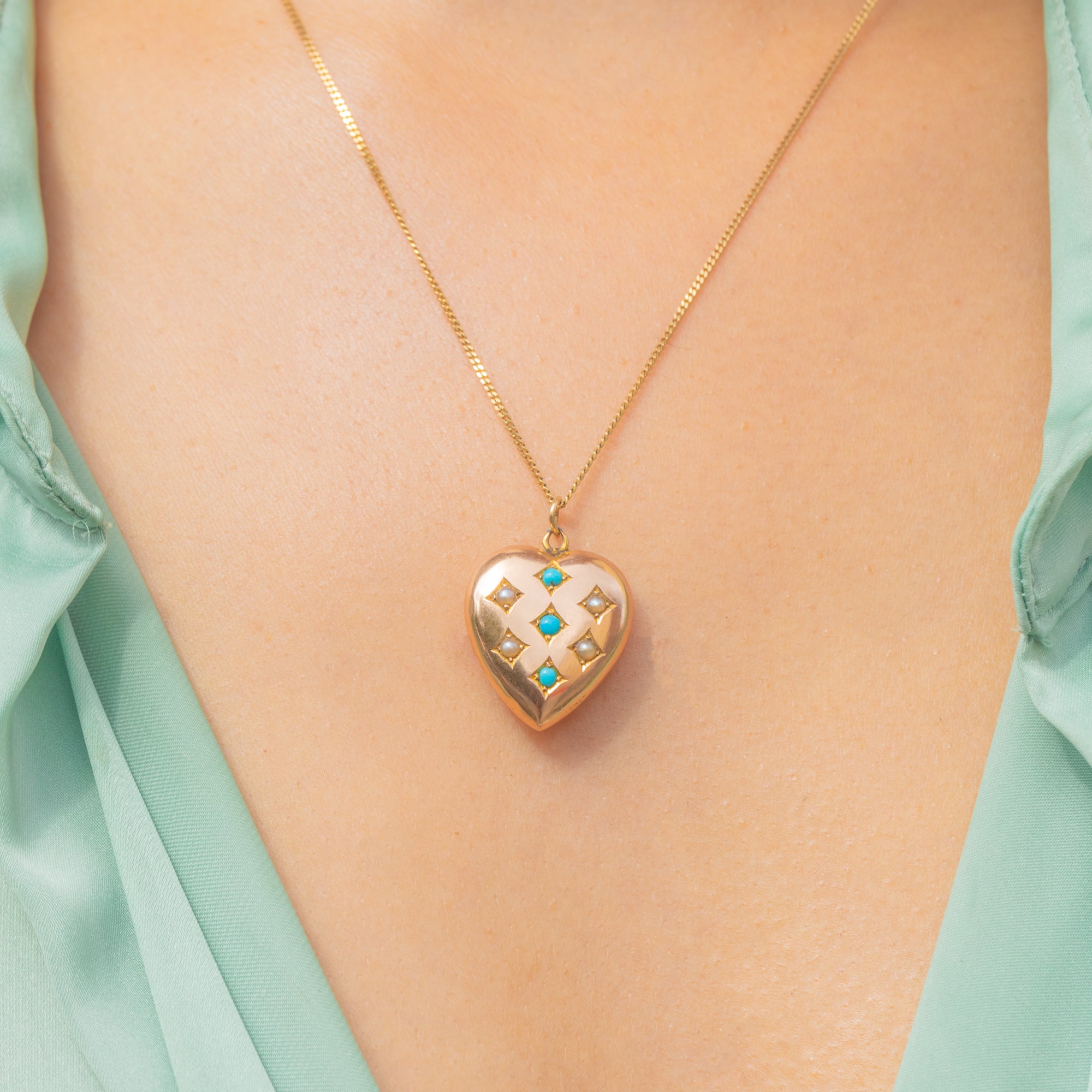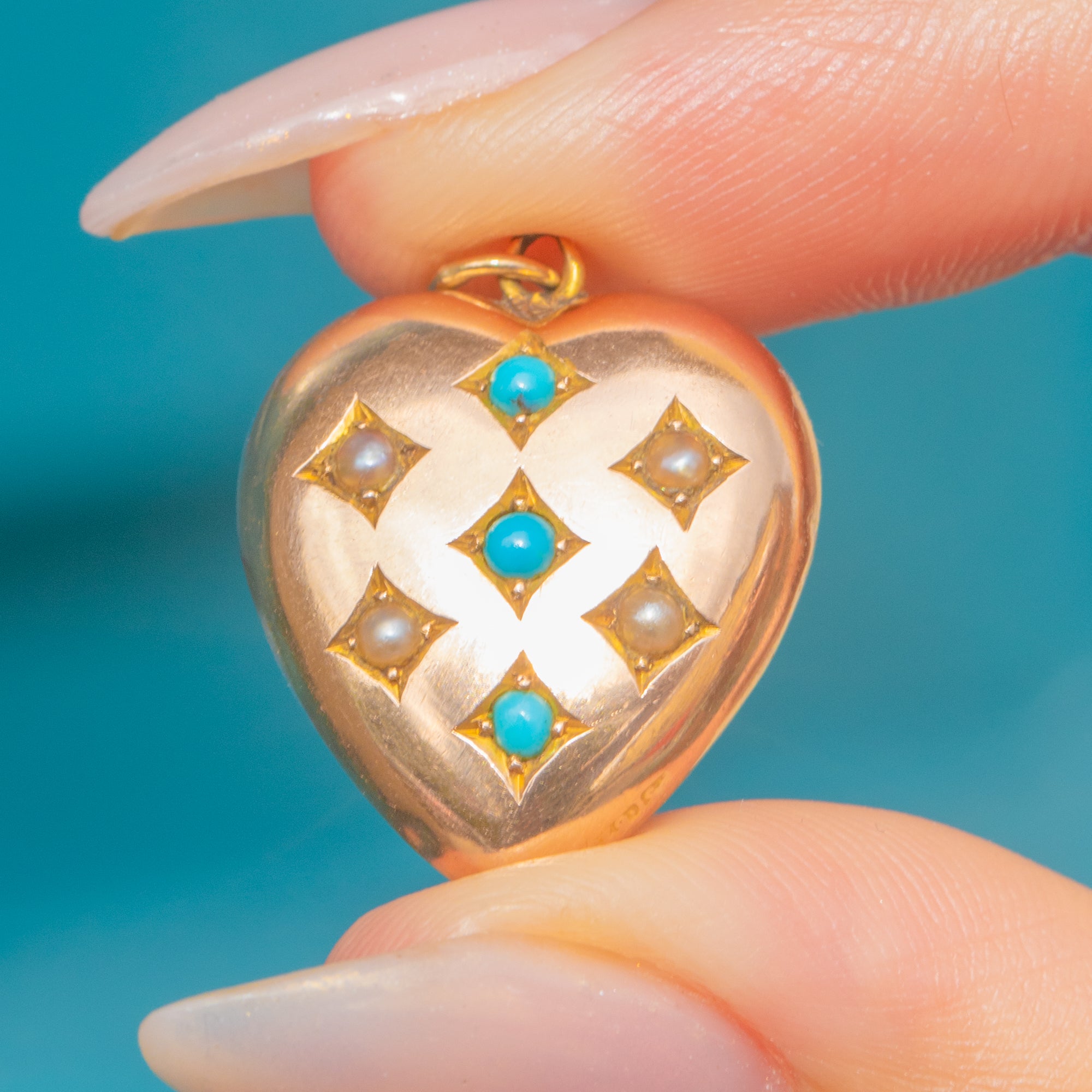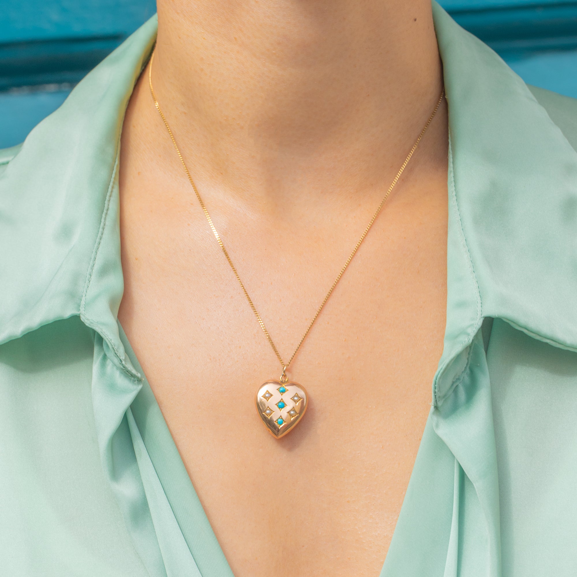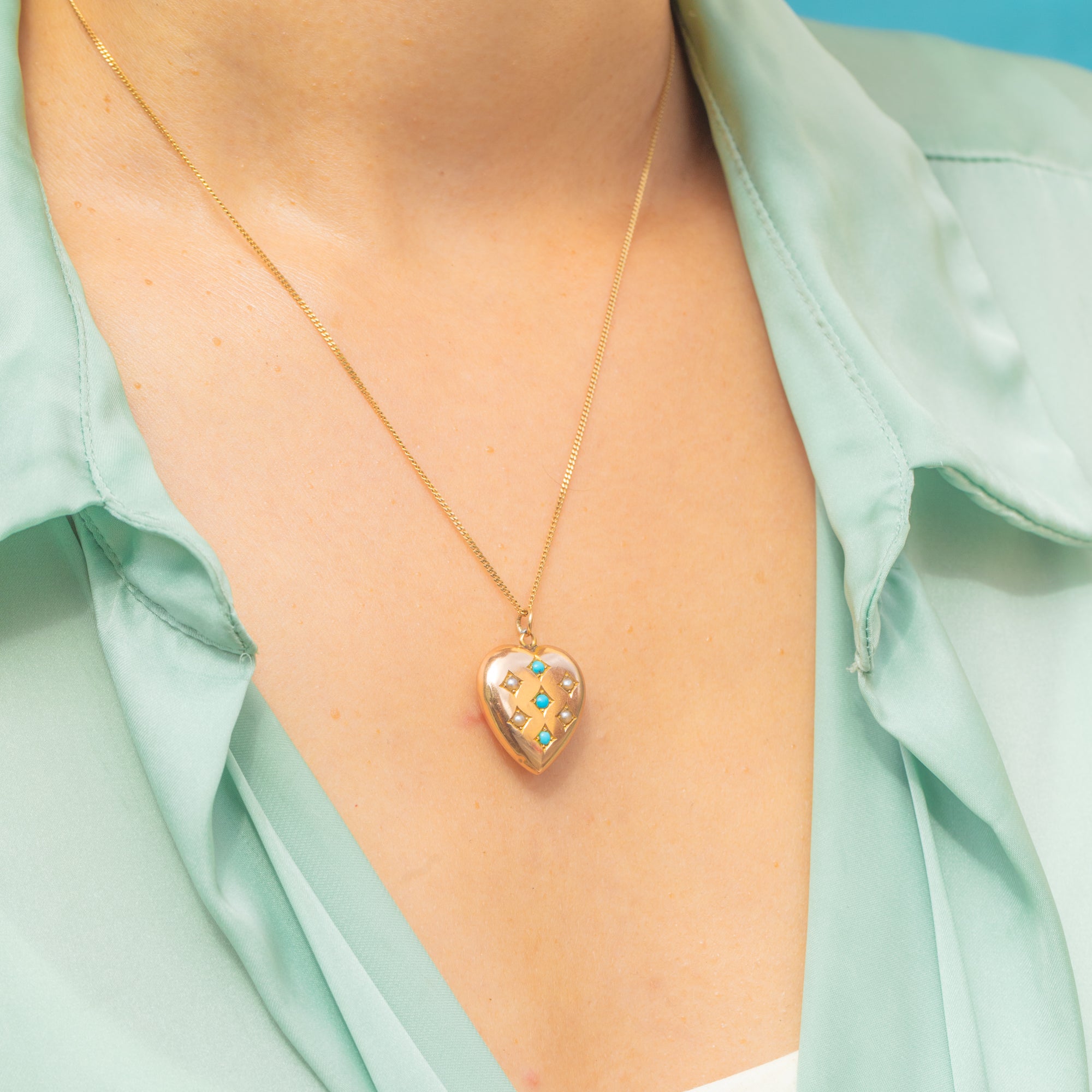 An Edwardian puffy heart pendant in 15ct Gold adorned with Persian Turquoise and Pearls. A classic heart silhouette paired with the period’s favoured gemstones.