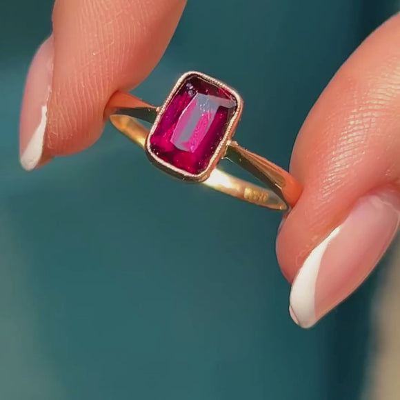Step back in time with this Edwardian 15ct Gold Rhodolite Garnet ring. Crafted from sumptuous 15ct Gold, she is a delectable little treasure that is both eye-catching and elegant, she is a spellbinding sensation!