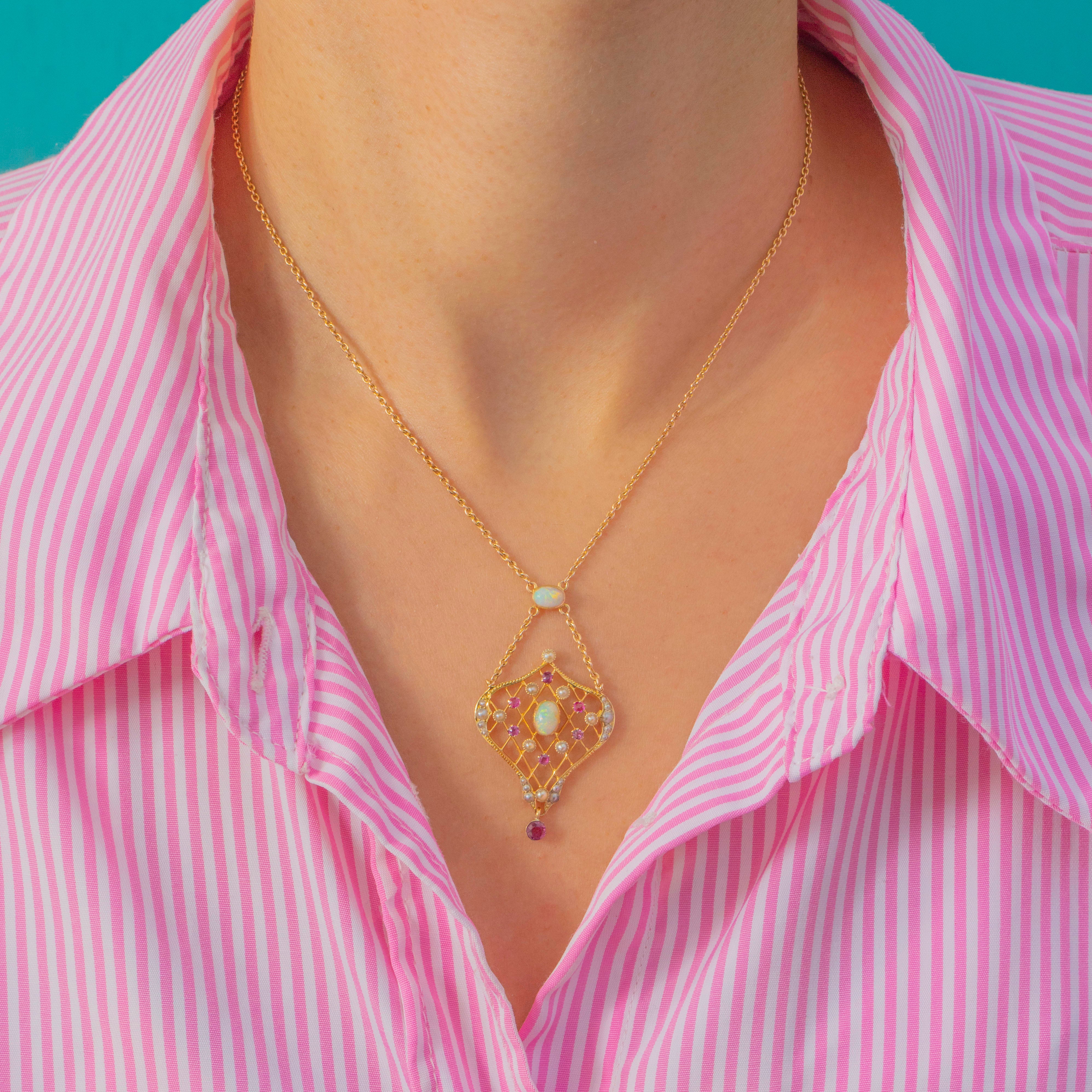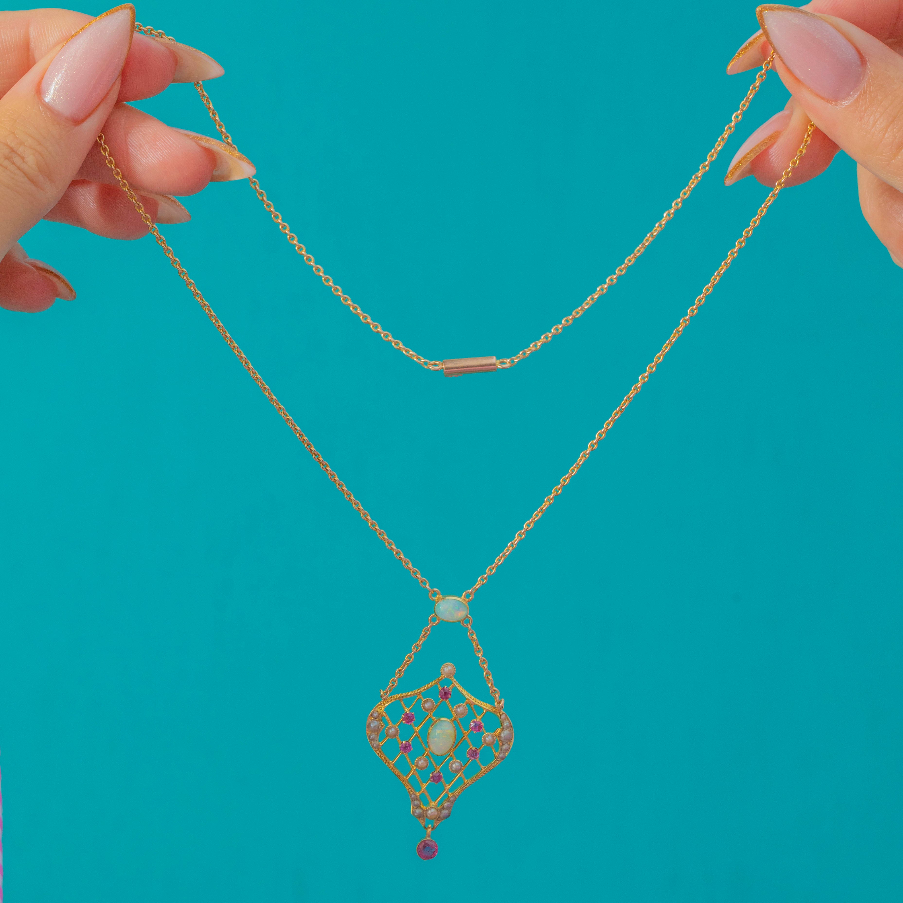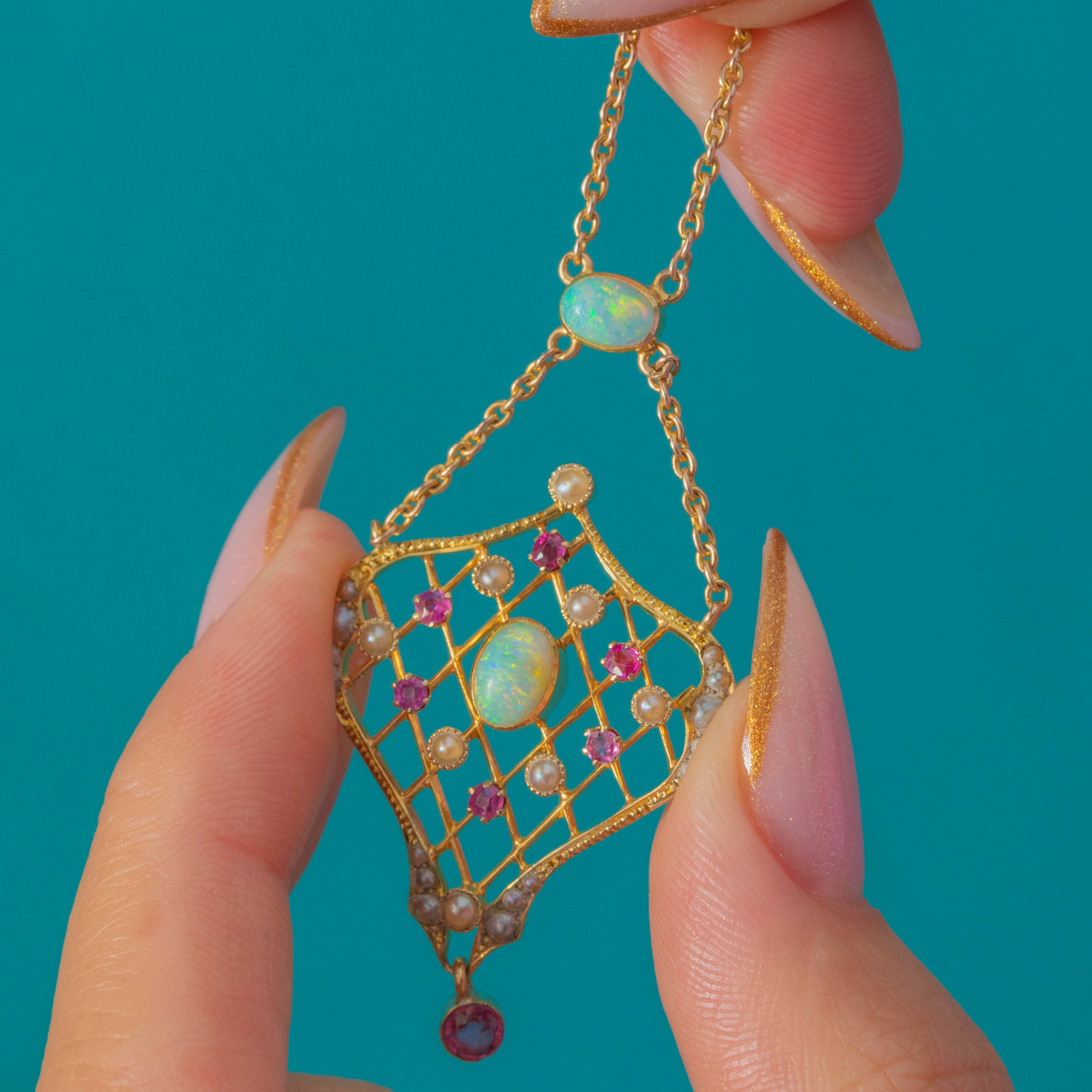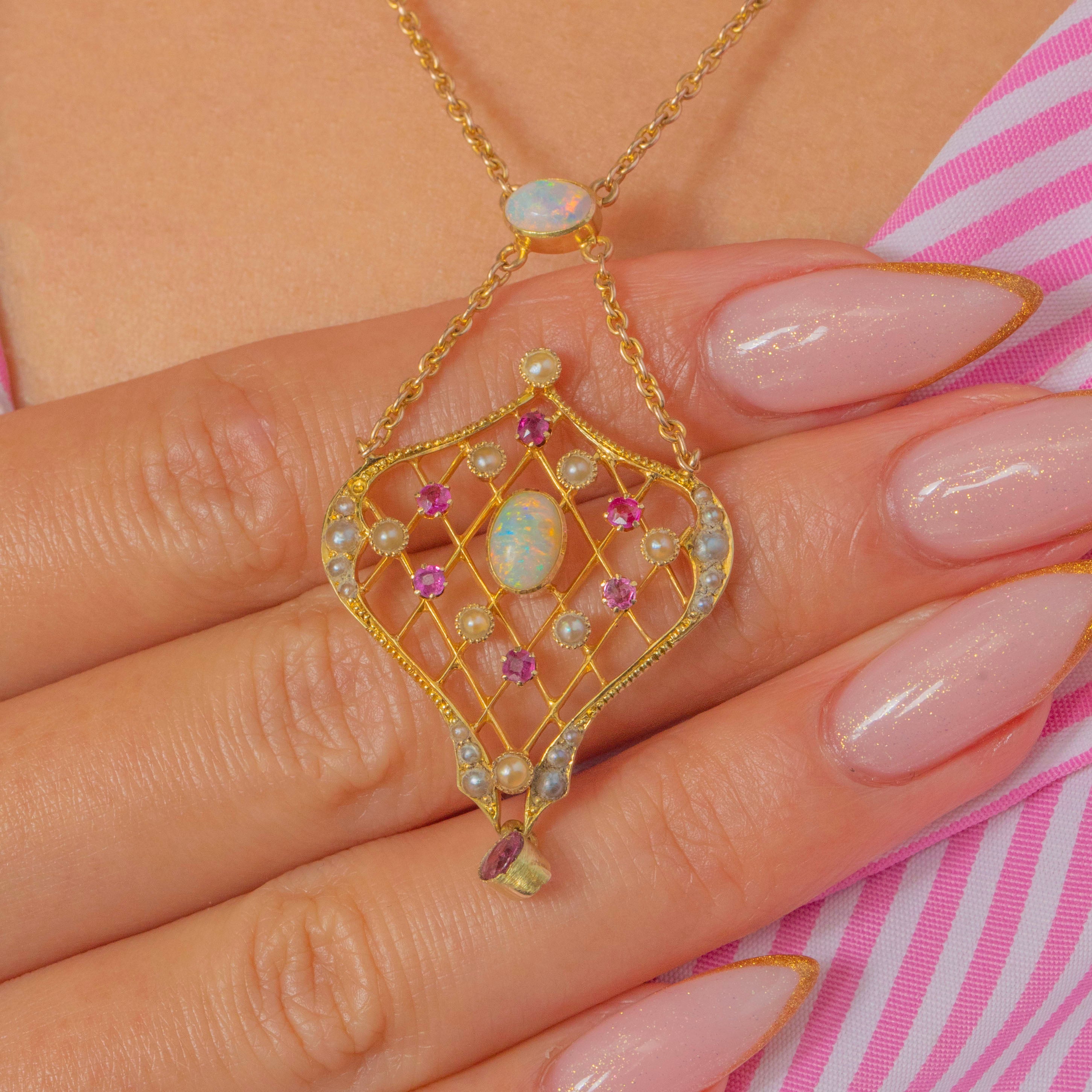 This exquisite Edwardian pendant necklace captures the grace and refinement of early 20th-century design. Crafted in rich 15ct Gold, the pendant features a delicate lattice pattern set with glowing Opals, romantic Rubies, and dainty Seed Pearls.