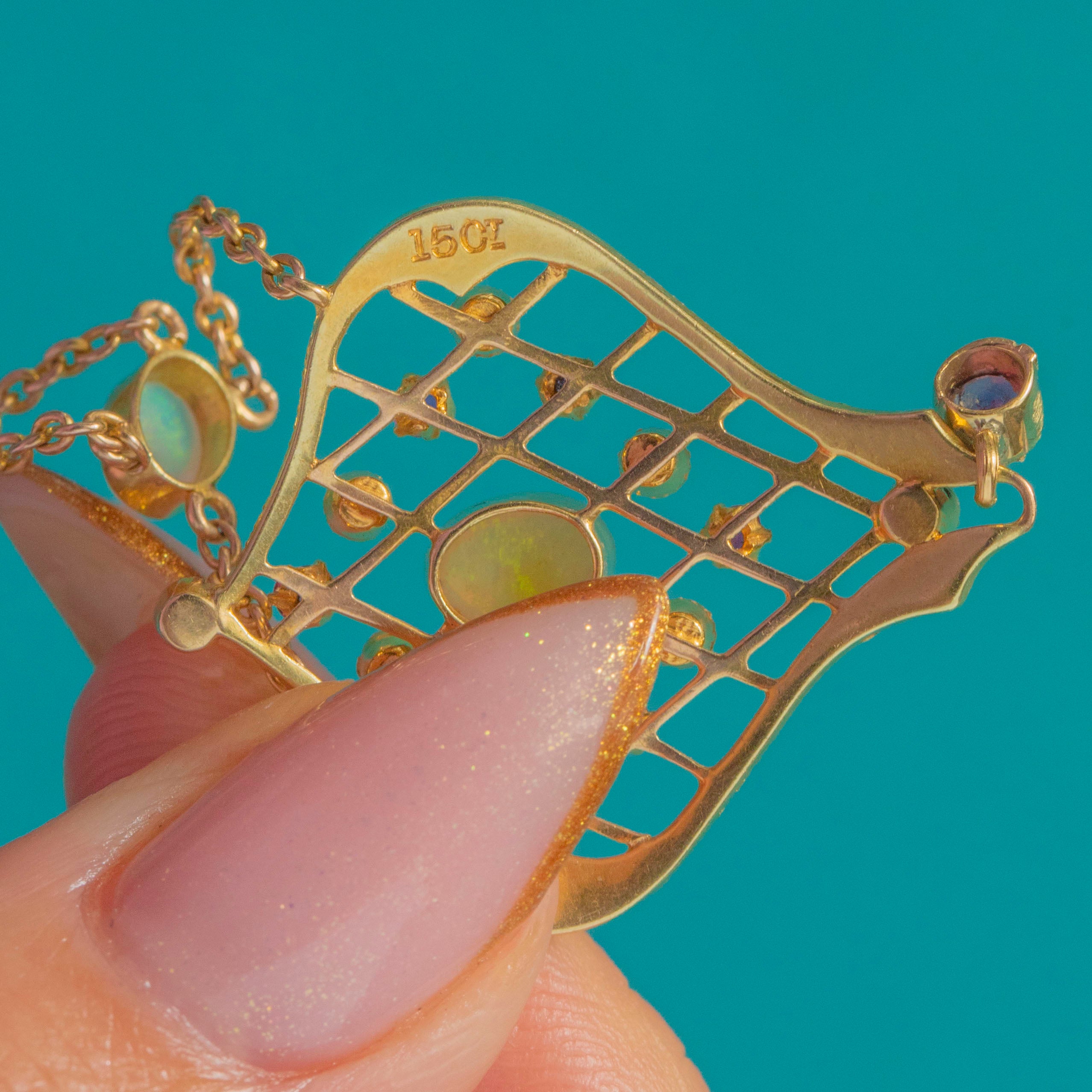 EXCELLENT: This Edwardian necklace is in superb condition with all gemstones original and securely set. The Gold retains its lovely antique hue, and the chain and clasp are strong and secure. The Opals display bright play-of-colour, the Rubies rich tone, and the Pearls excellent lustre. A wonderful and wearable example of Edwardian elegance.