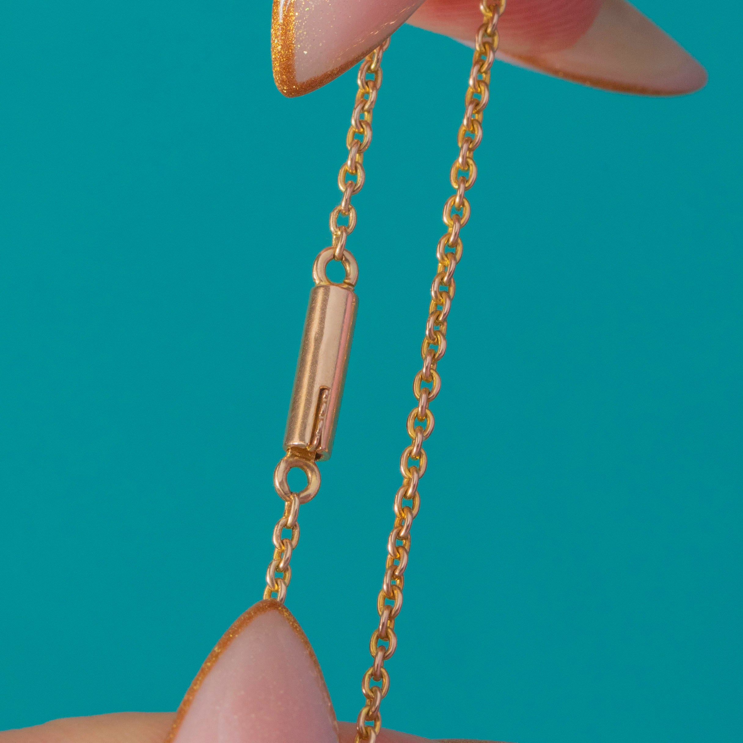 The intricate openwork and gentle drop give it a beautiful sense of movement and light. Suspended from an integral 16" Gold chain, this piece is as wearable today as it was over a century ago, a truly elegant antique treasure.