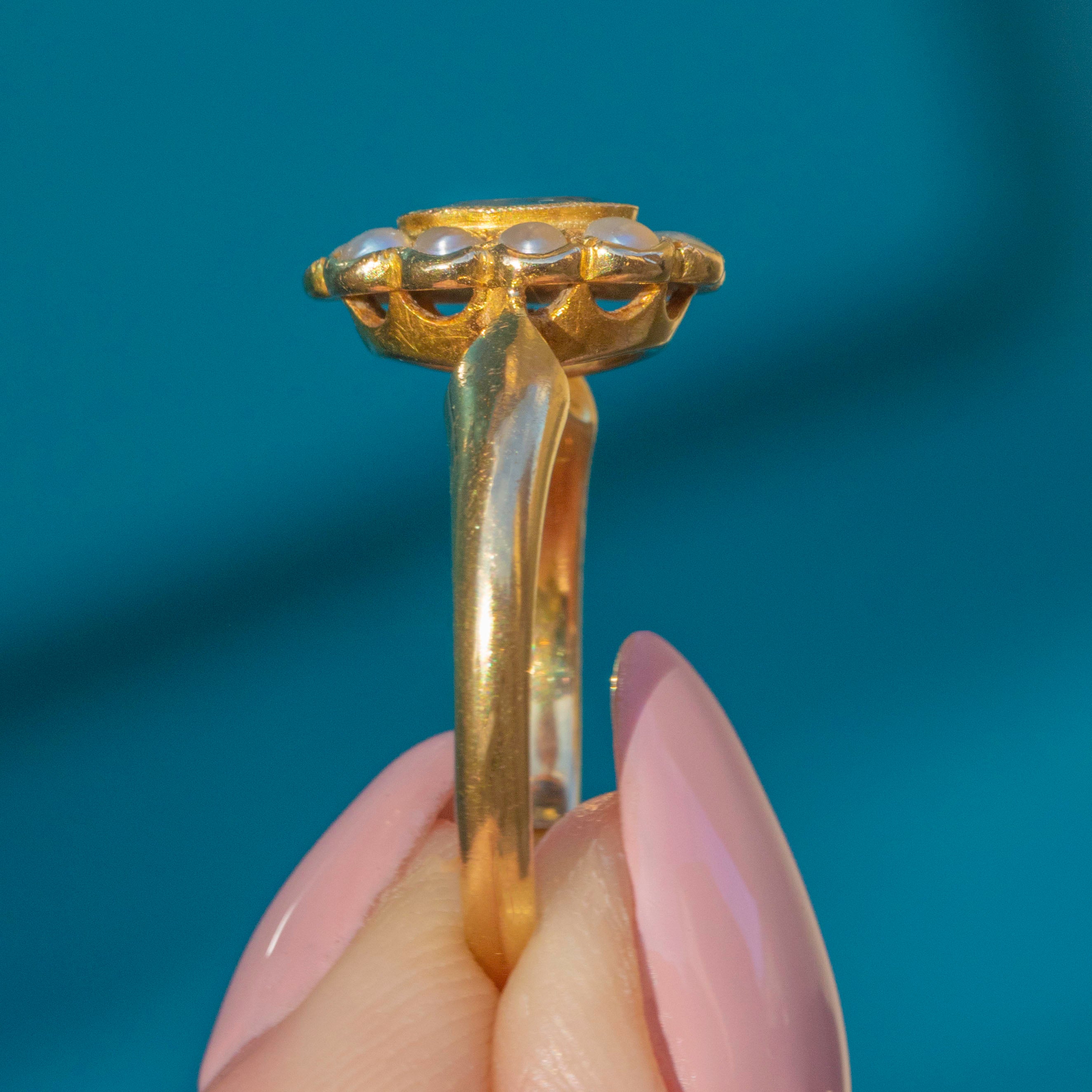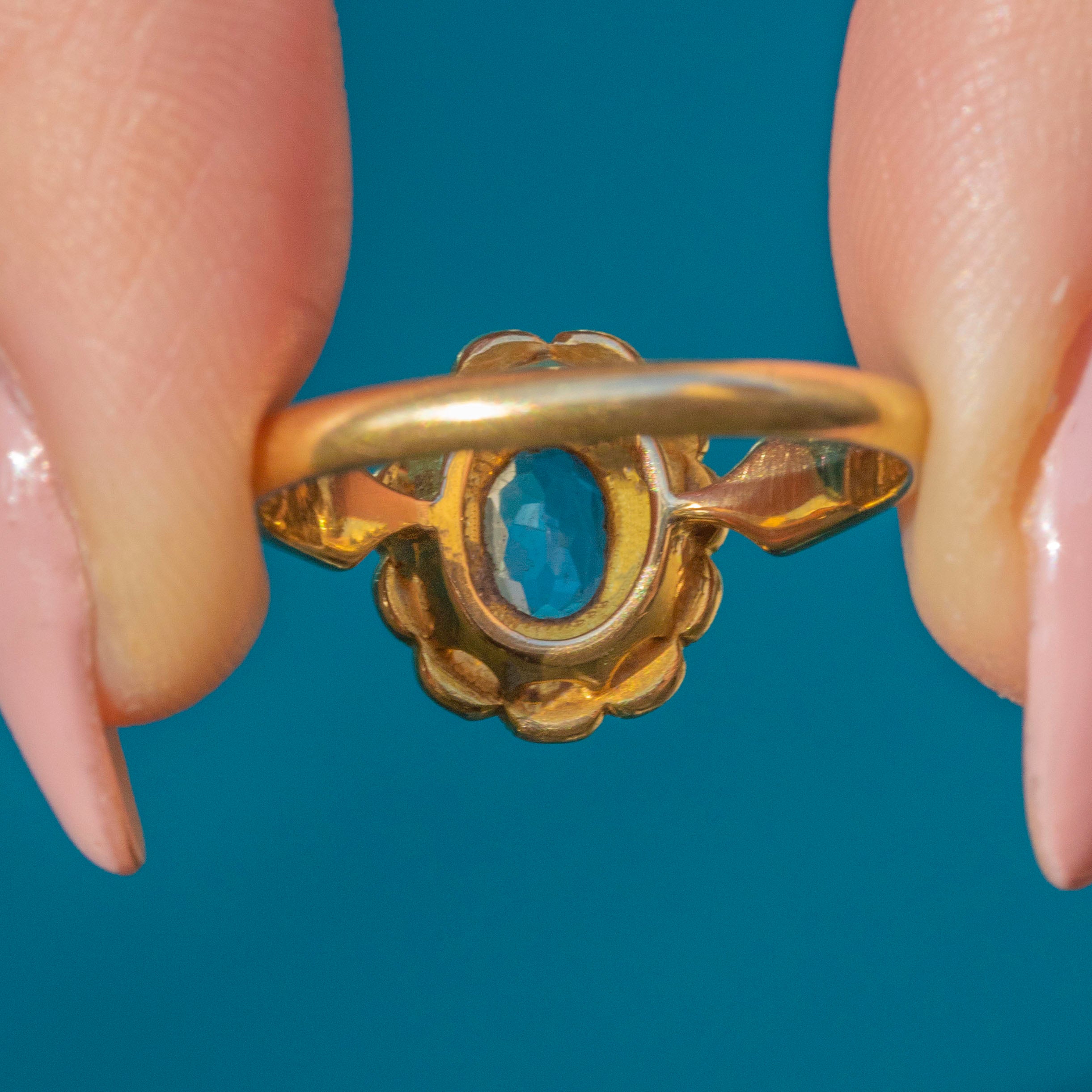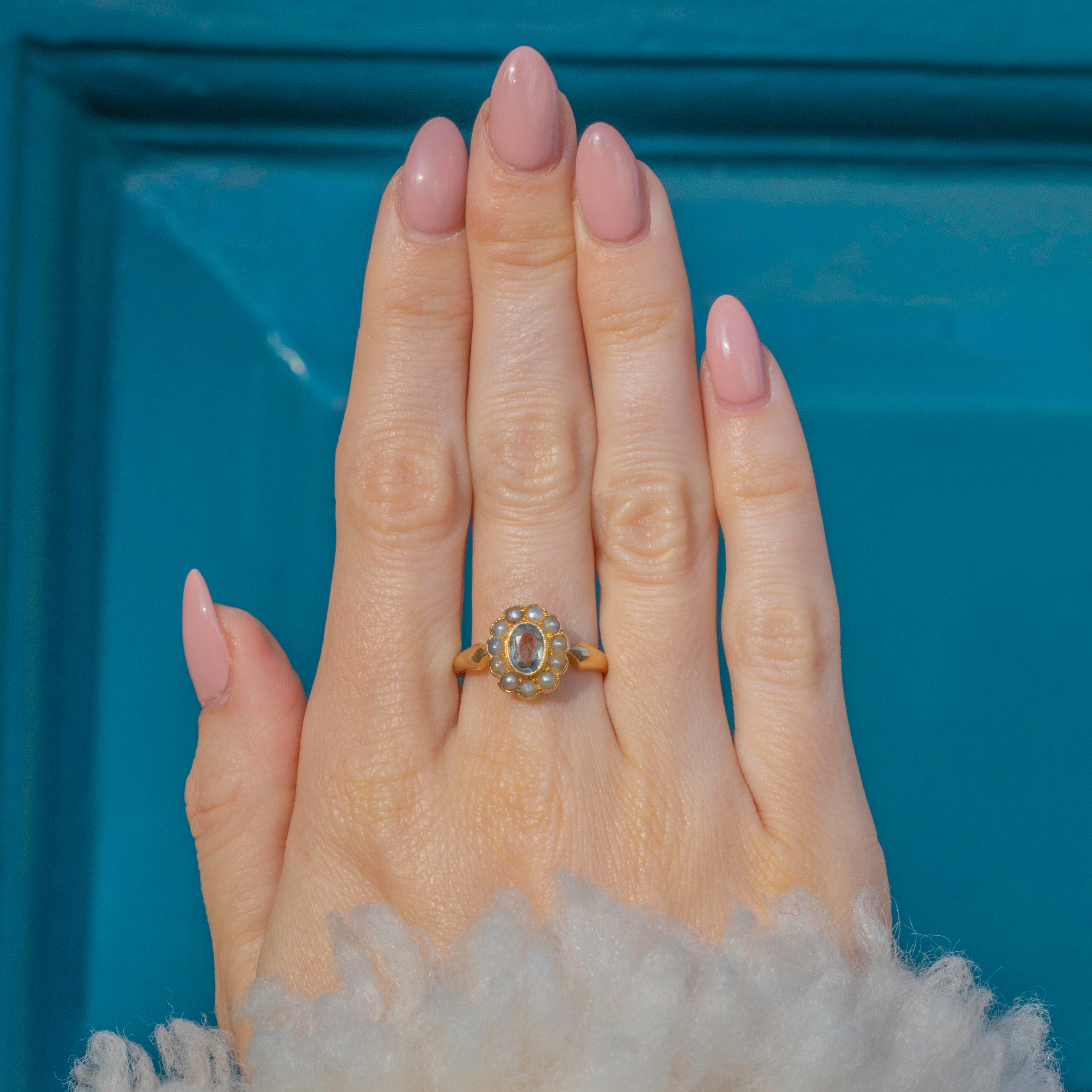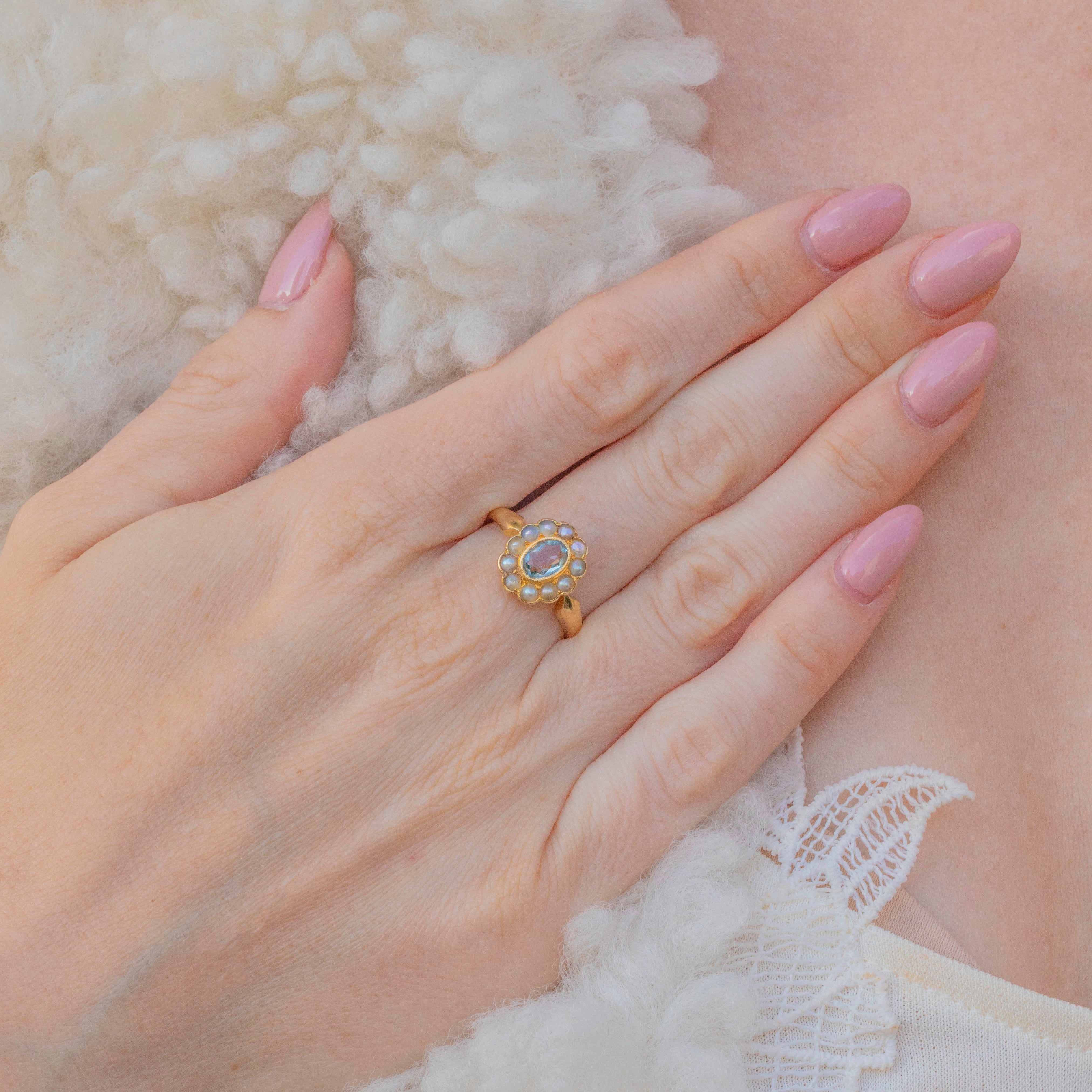 How pretty is this Edwardian 18ct Gold Aquamarine Pearl cluster ring?! Possessing plenty of grace and elegance, the Aquamarine and Pearls are arranged into a dainty floral design, making her a gorgeous gift for your partner or loved one!
