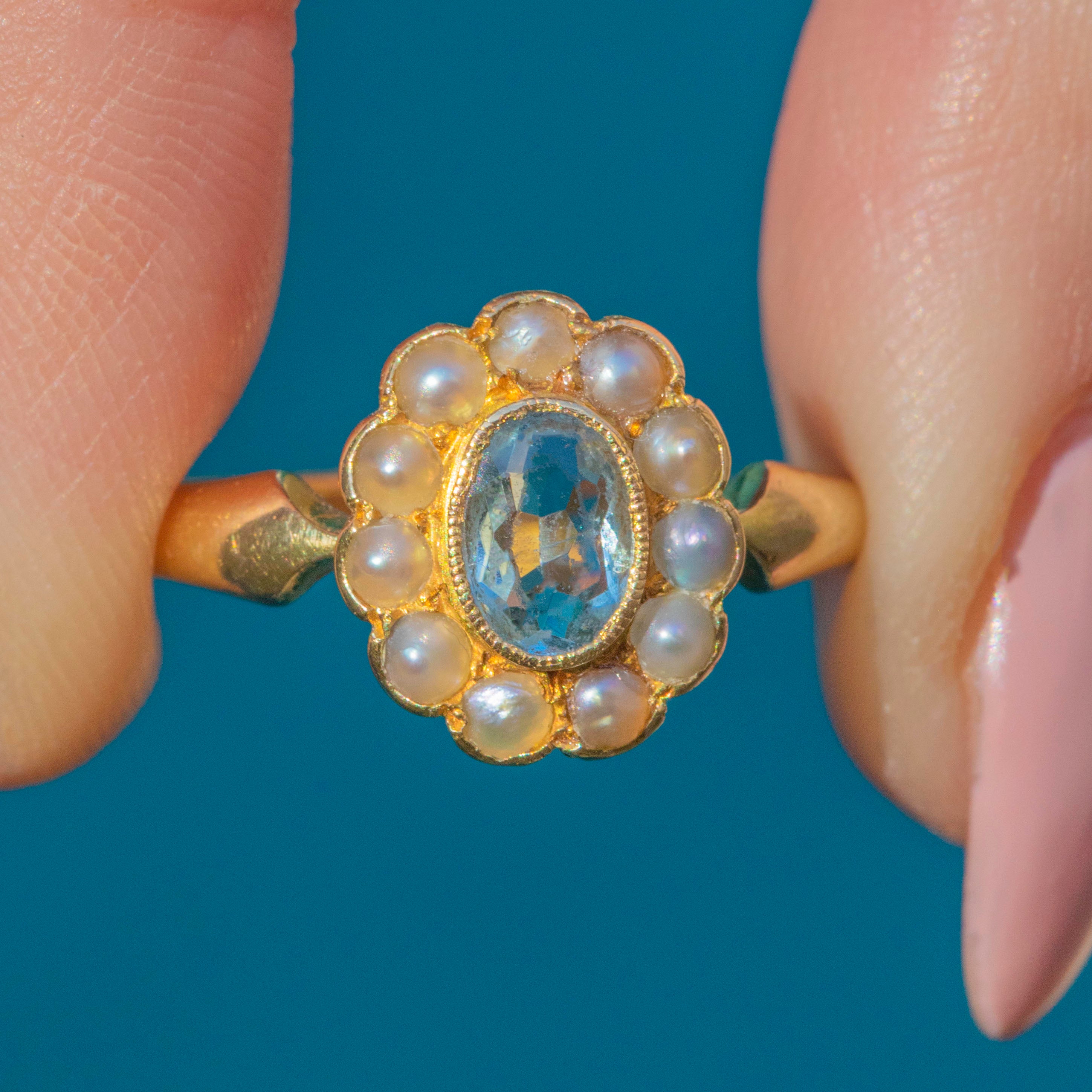 Edwardian 18ct Gold Aquamarine Pearl Cluster Ring, 0.25ct