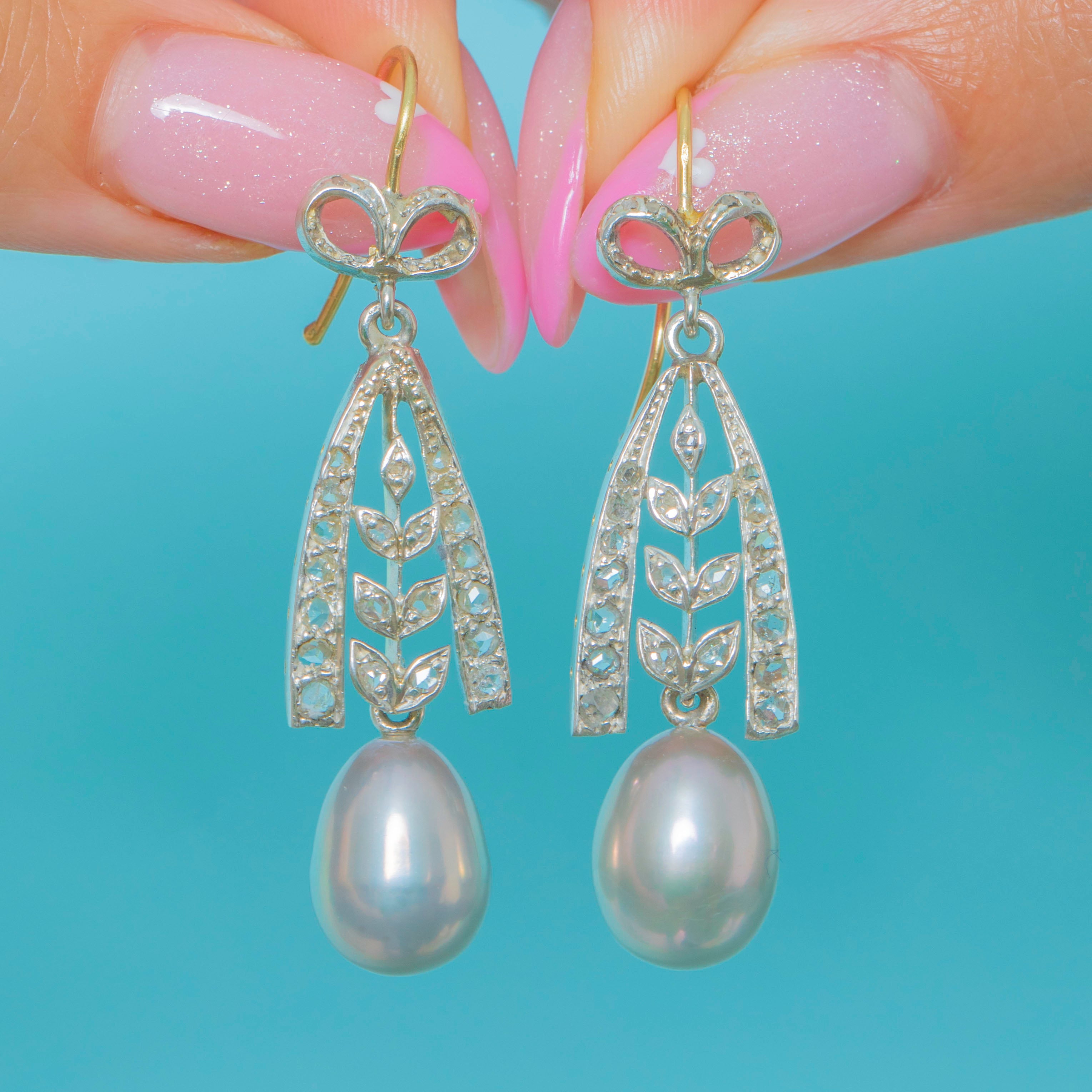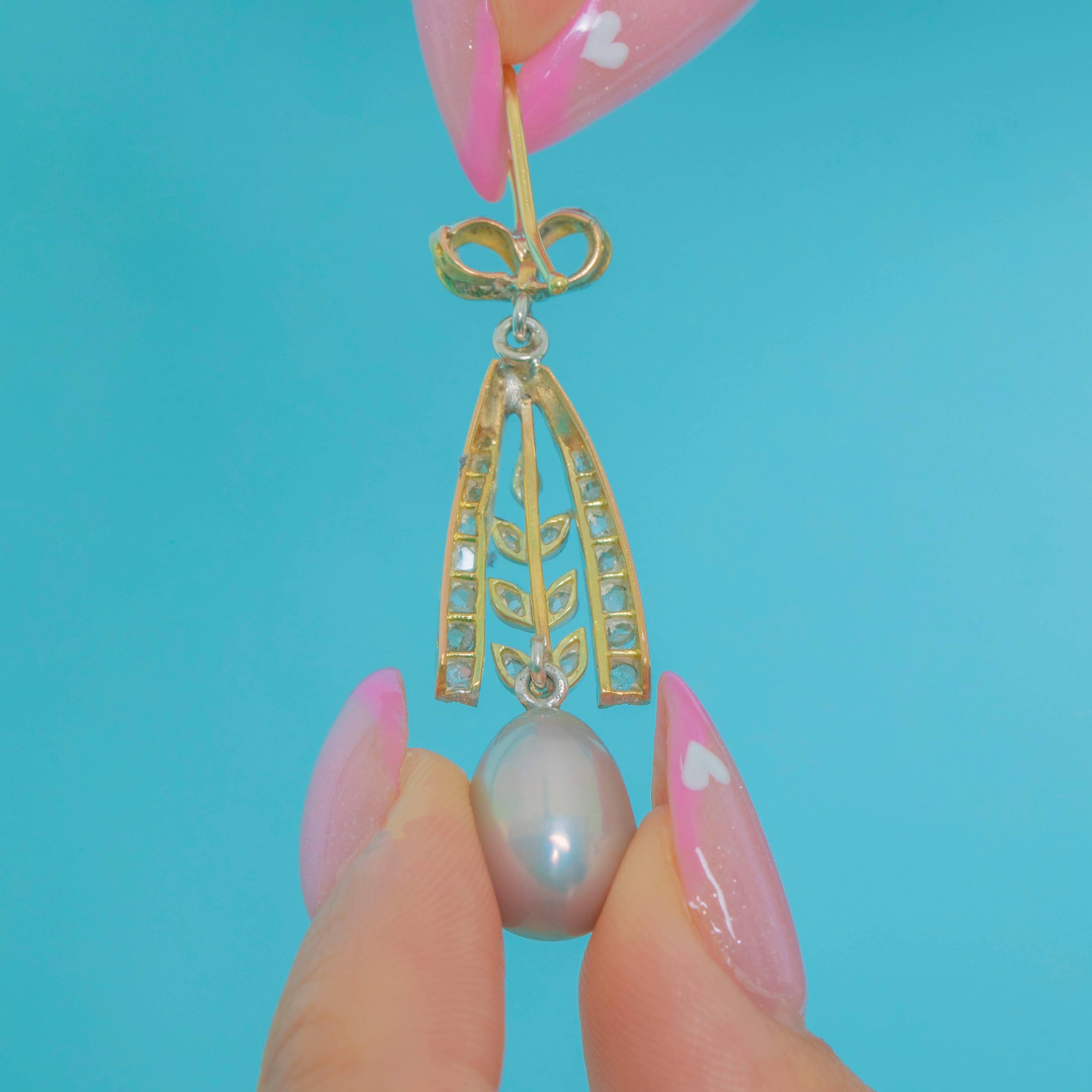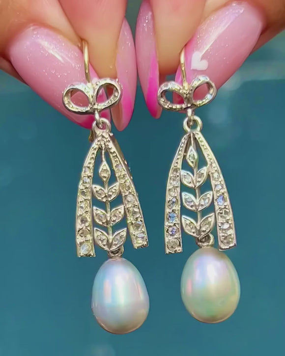 These elegant Edwardian earrings showcase all the refined charm of the early 20th century. Crafted in rich 18ct Gold, each earring features a graceful bow motif set with twinkling Diamonds, suspending a luminous natural Pearl below.