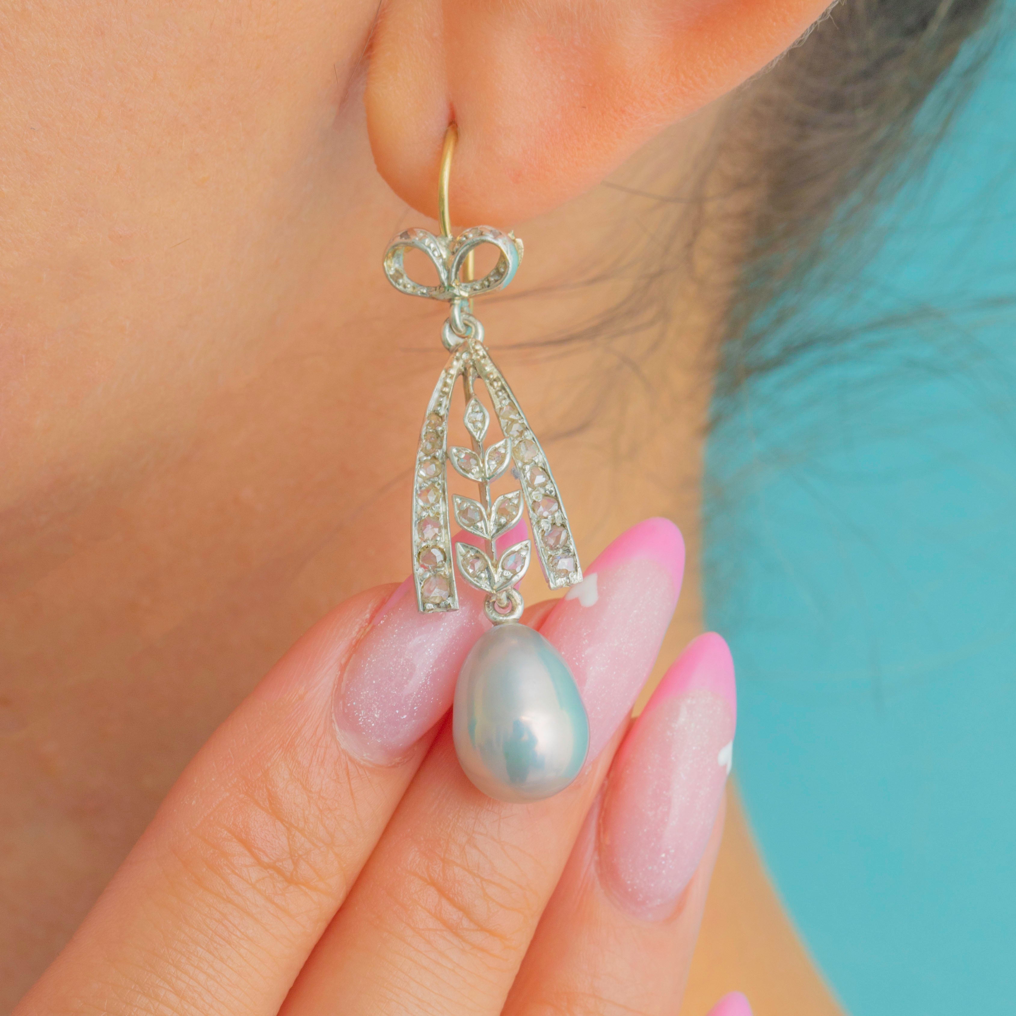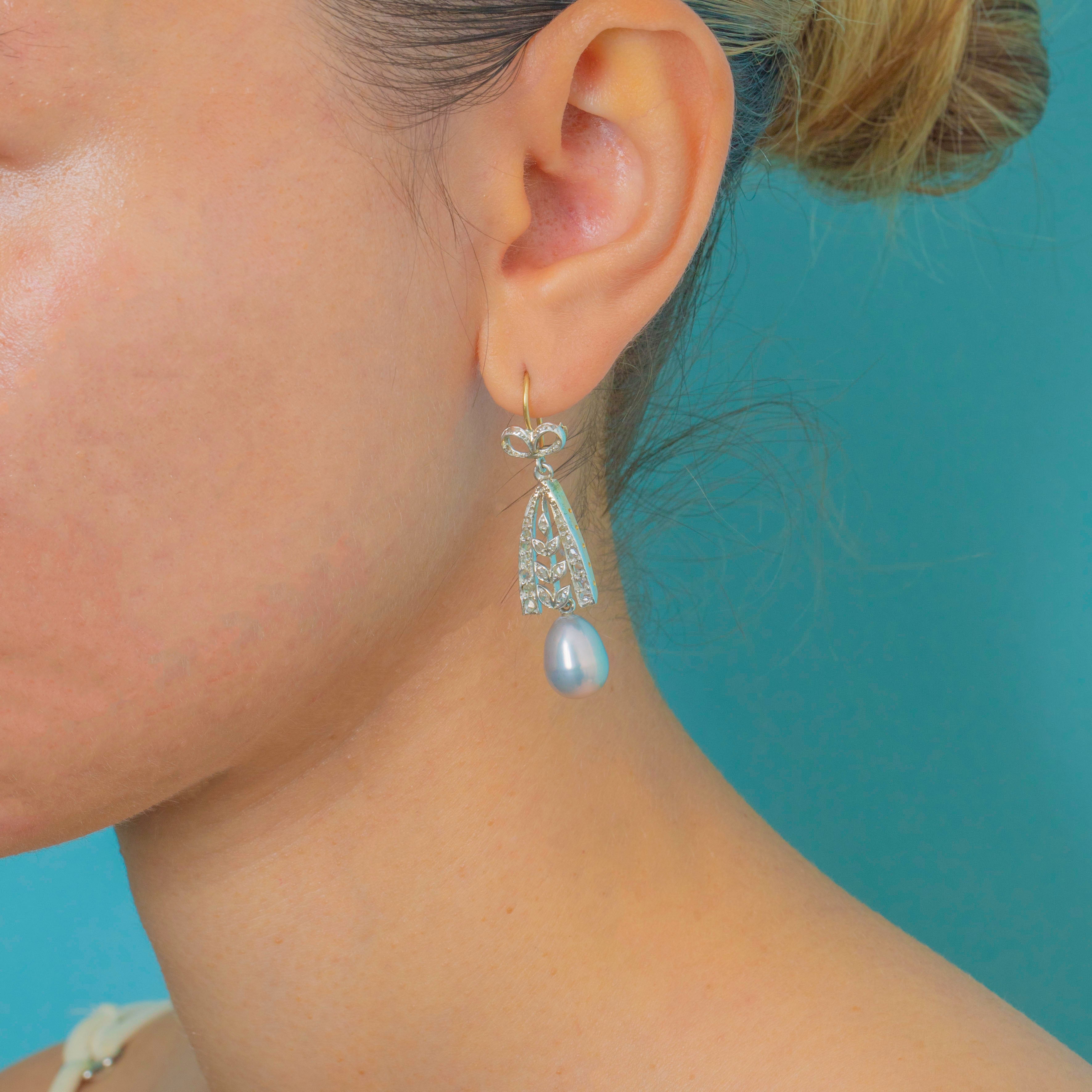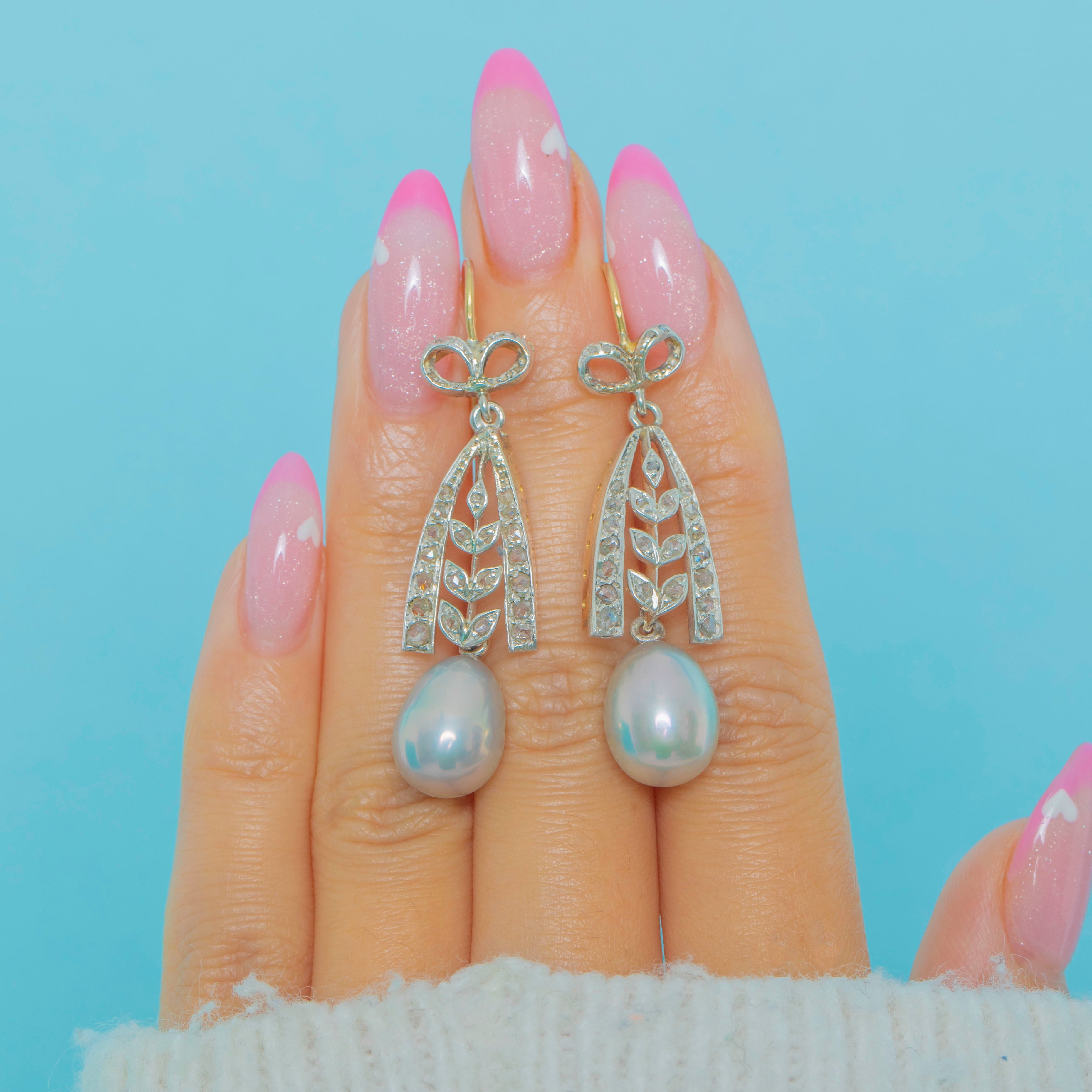 These elegant Edwardian earrings showcase all the refined charm of the early 20th century. Crafted in rich 18ct Gold, each earring features a graceful bow motif set with twinkling Diamonds, suspending a luminous natural Pearl below.