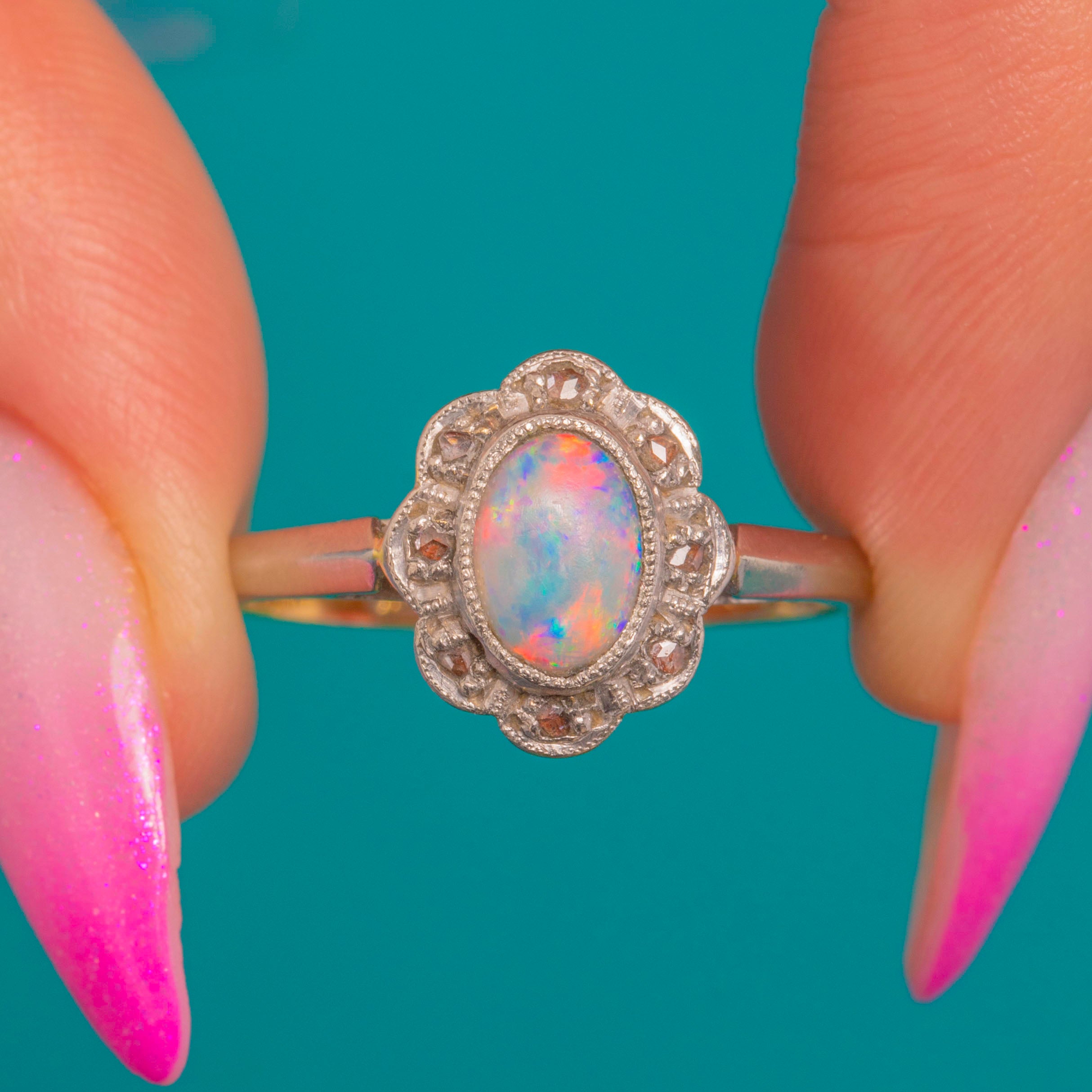 EXCELLENT: The Opal is bright with strong play-of-colour and no obvious chips or abrasions visible; the rose-cut Diamonds are lively and well-matched. The settings are secure with crisp milgrain, and the shank shows only light surface wear consistent with age with subtle patina in recessed areas. No visible repairs or resizing.