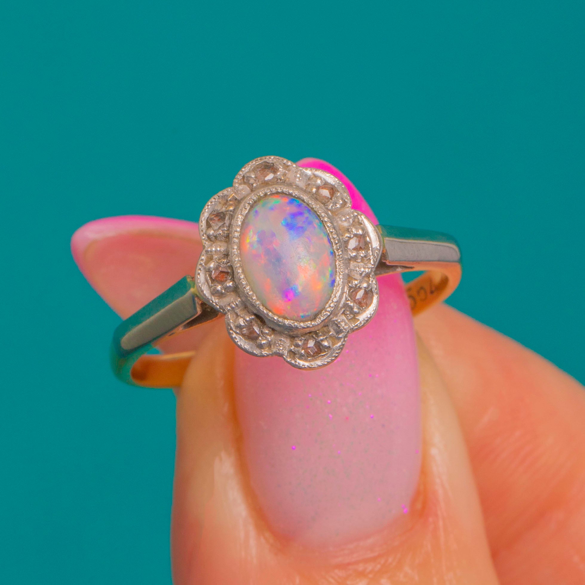 A dreamy Edwardian flower cluster ring that pairs the luminous magic of Opal with the sparkle of rose-cut Diamonds. The oval Opal cabochon (approximately 0.45ct) shimmers with vivid play-of-colour, encircled by a delicate scalloped halo of bright rose-cuts for a romantic, petal-like silhouette. Fine milgrain accents and the low, dainty profile enhance its refined elegance.