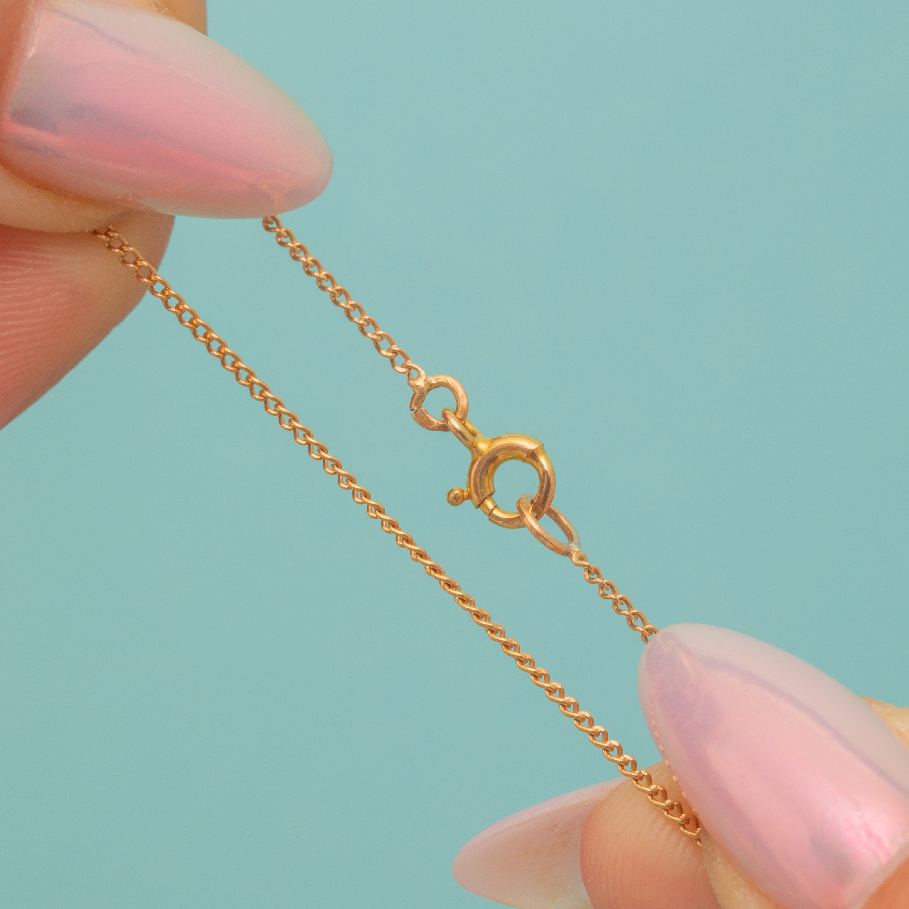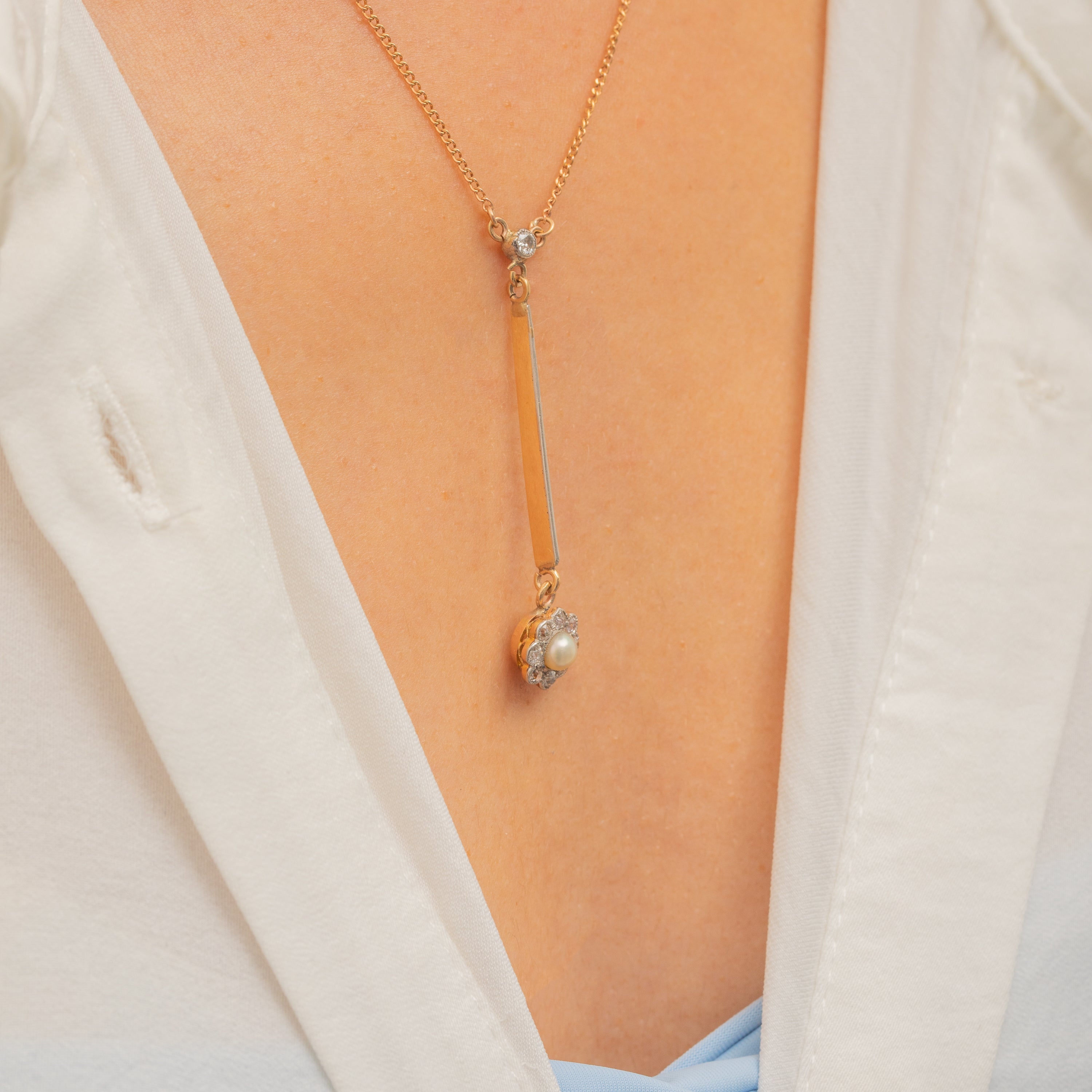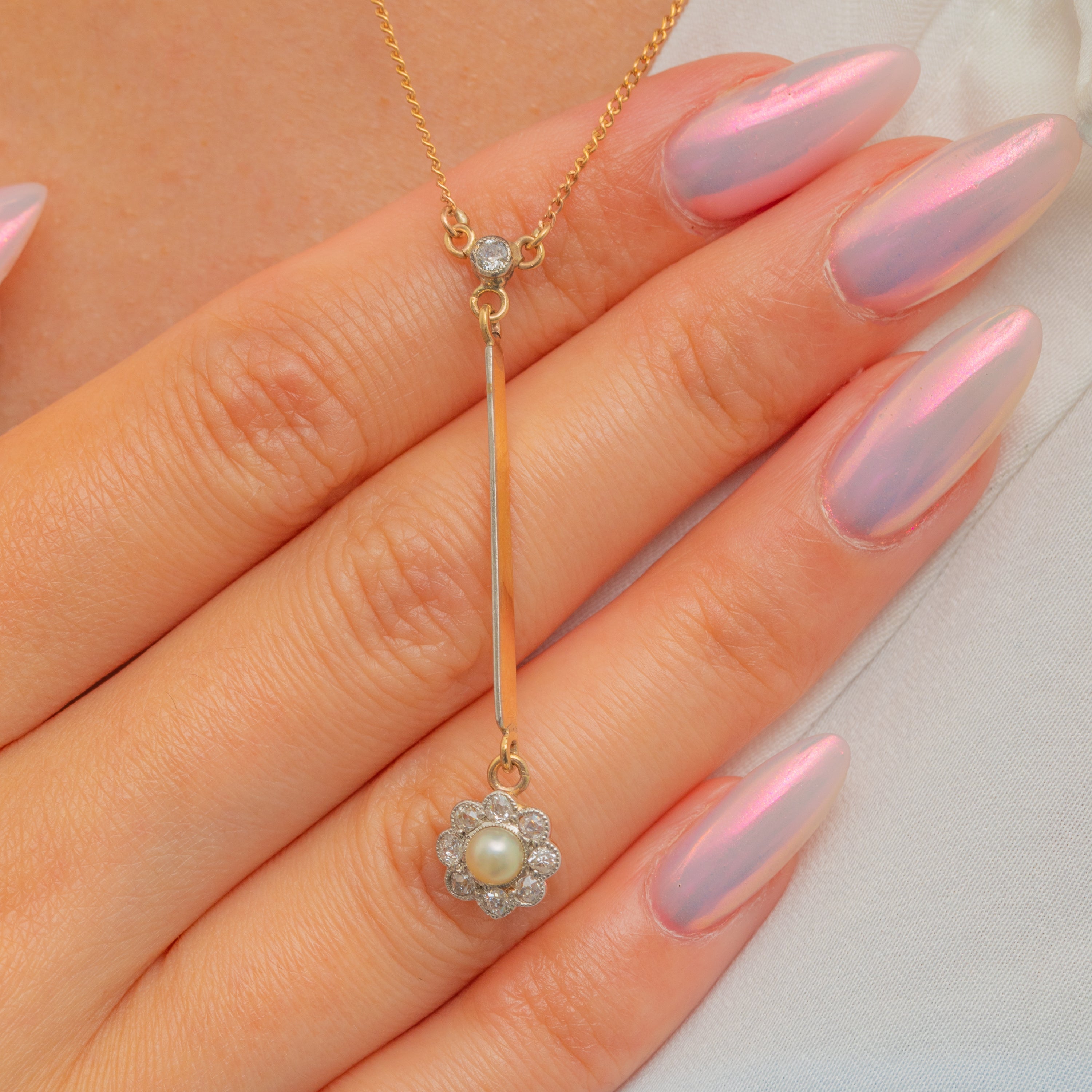 EXCELLENT: The Diamonds are all securely set and the Pearl is plump and has retained a beautiful nacre. The dainty curb chain has a subtle rosy tint and secures well with its bolt-ring.