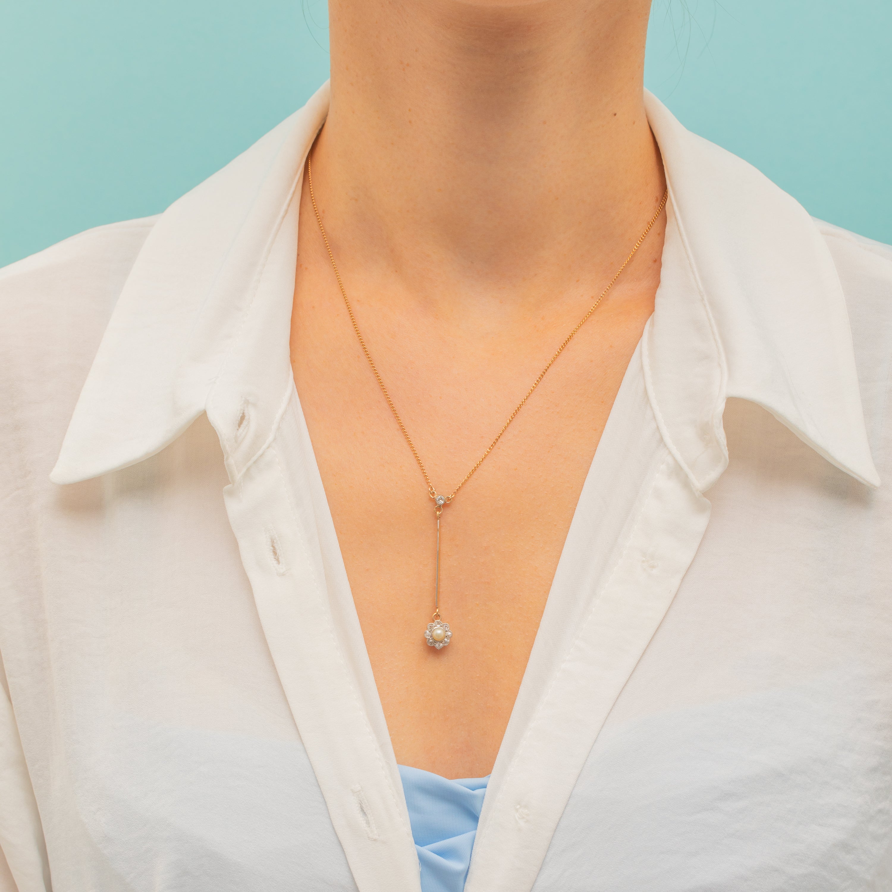 This Edwardian 18ct Gold Pearl Diamond daisy drop necklace radiates timeless elegance!