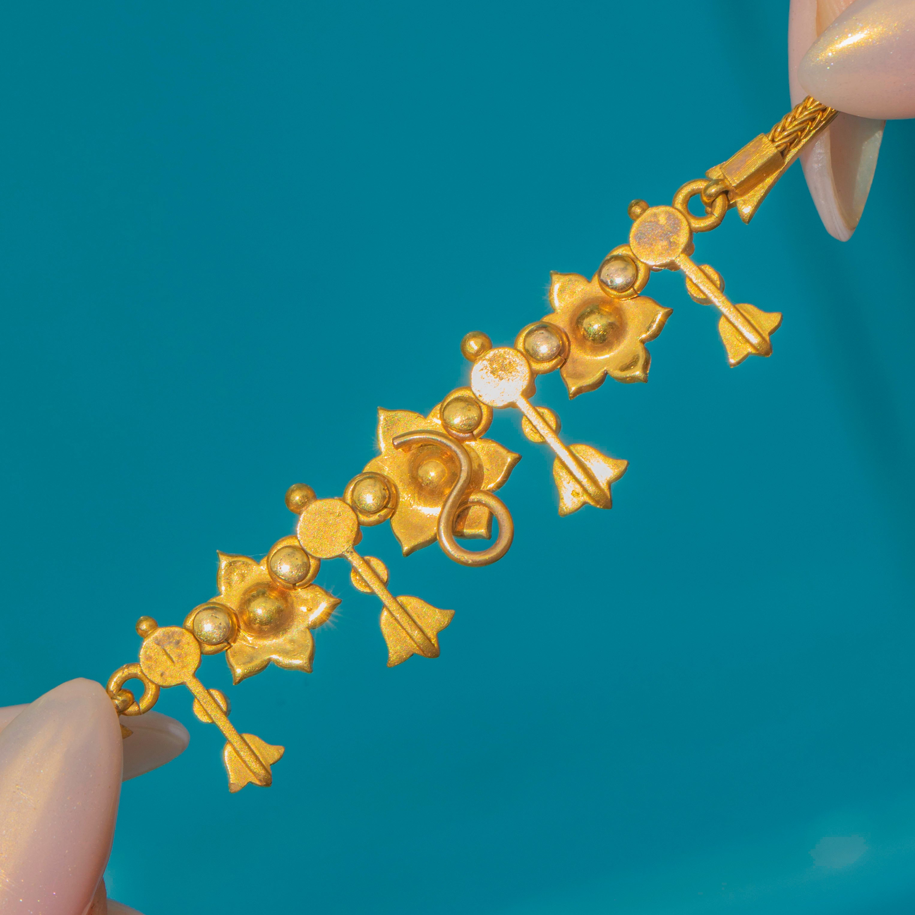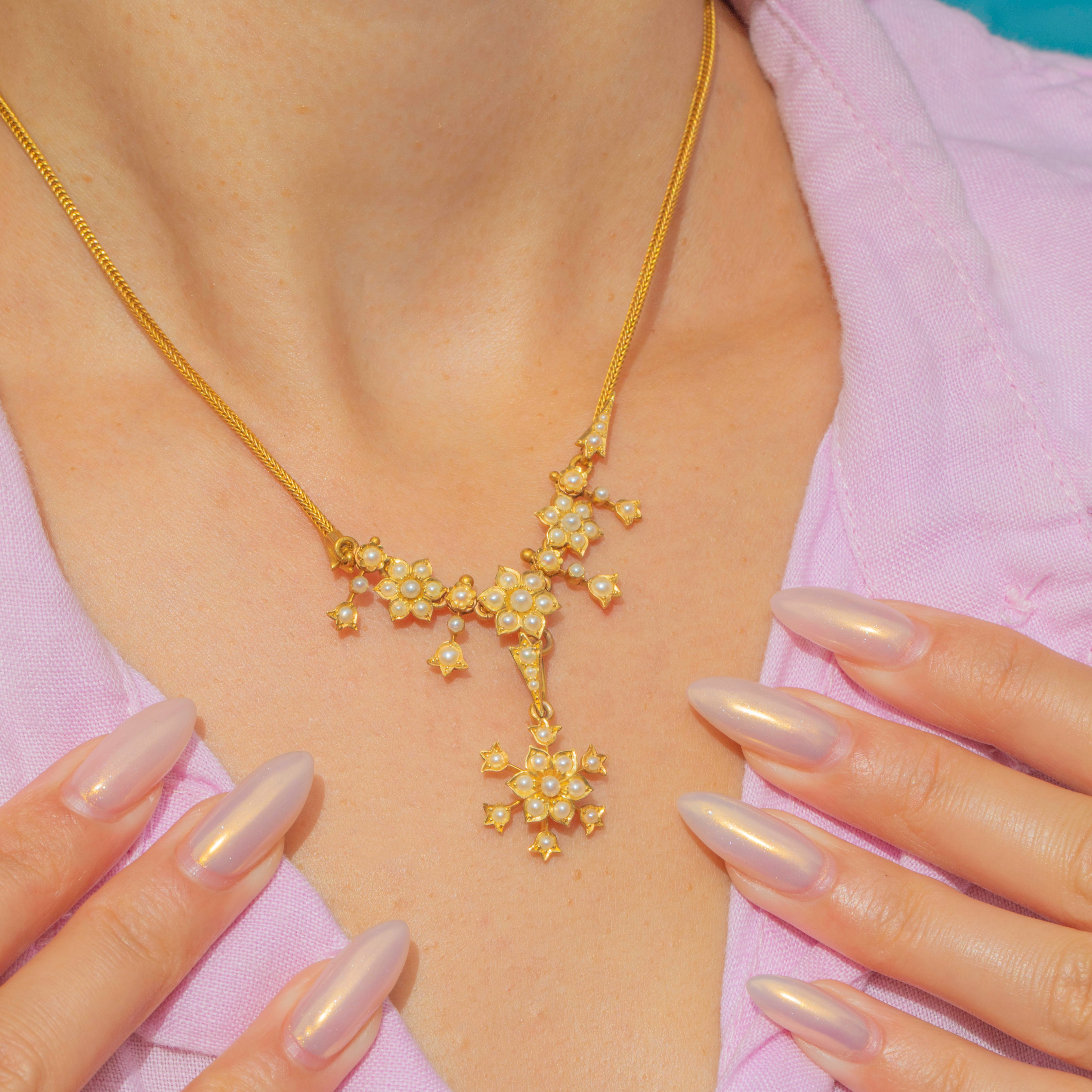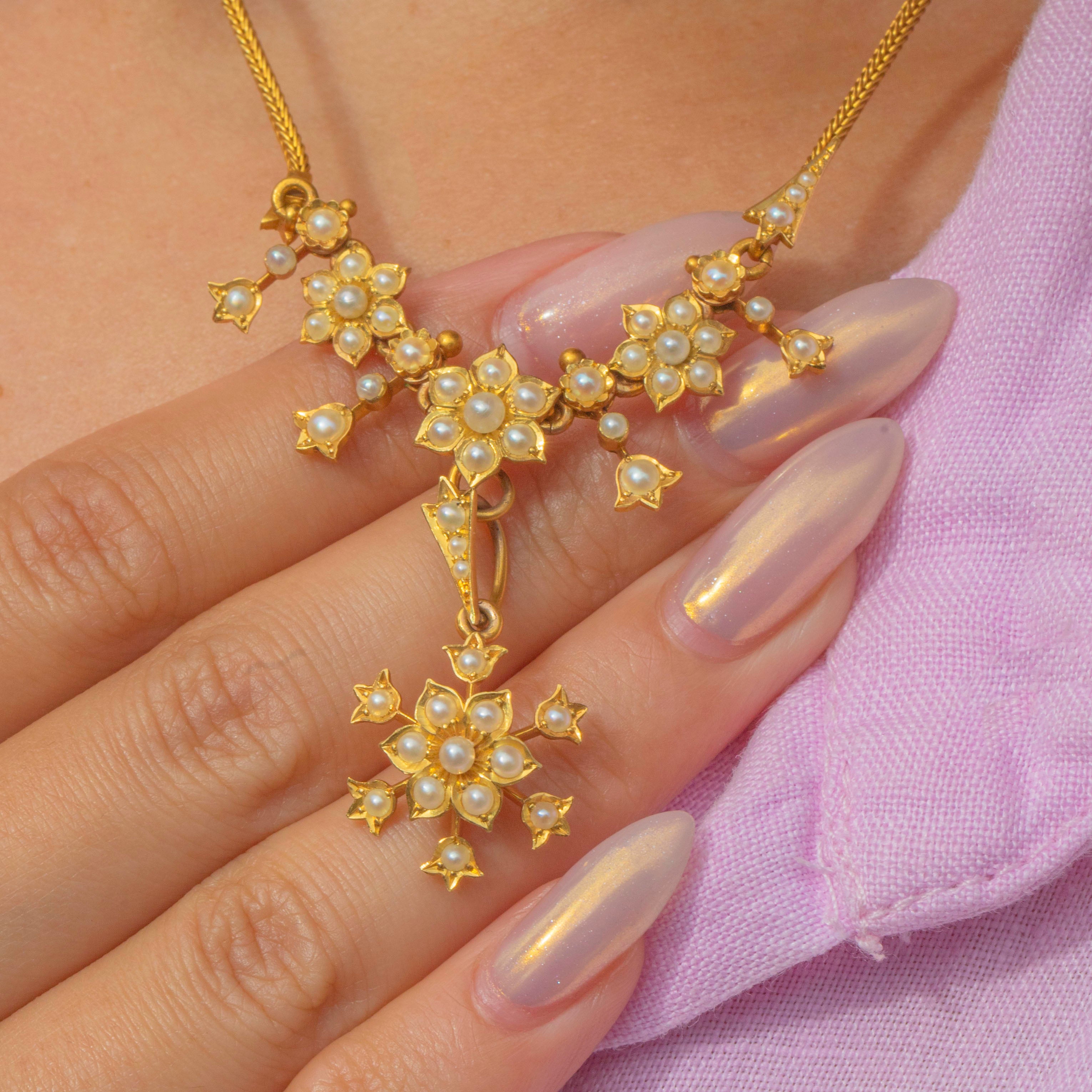 This exquisite Edwardian necklace is crafted in solid 18ct Gold and set with lustrous natural Pearls arranged in delicate floral motifs. The centrepiece features a detachable flower-shaped pendant that can be worn on or off the chain, adding versatility to the design. Each tiny Pearl is set with precision, creating a soft shimmer that captures the refined beauty of early 20th-century jewellery.