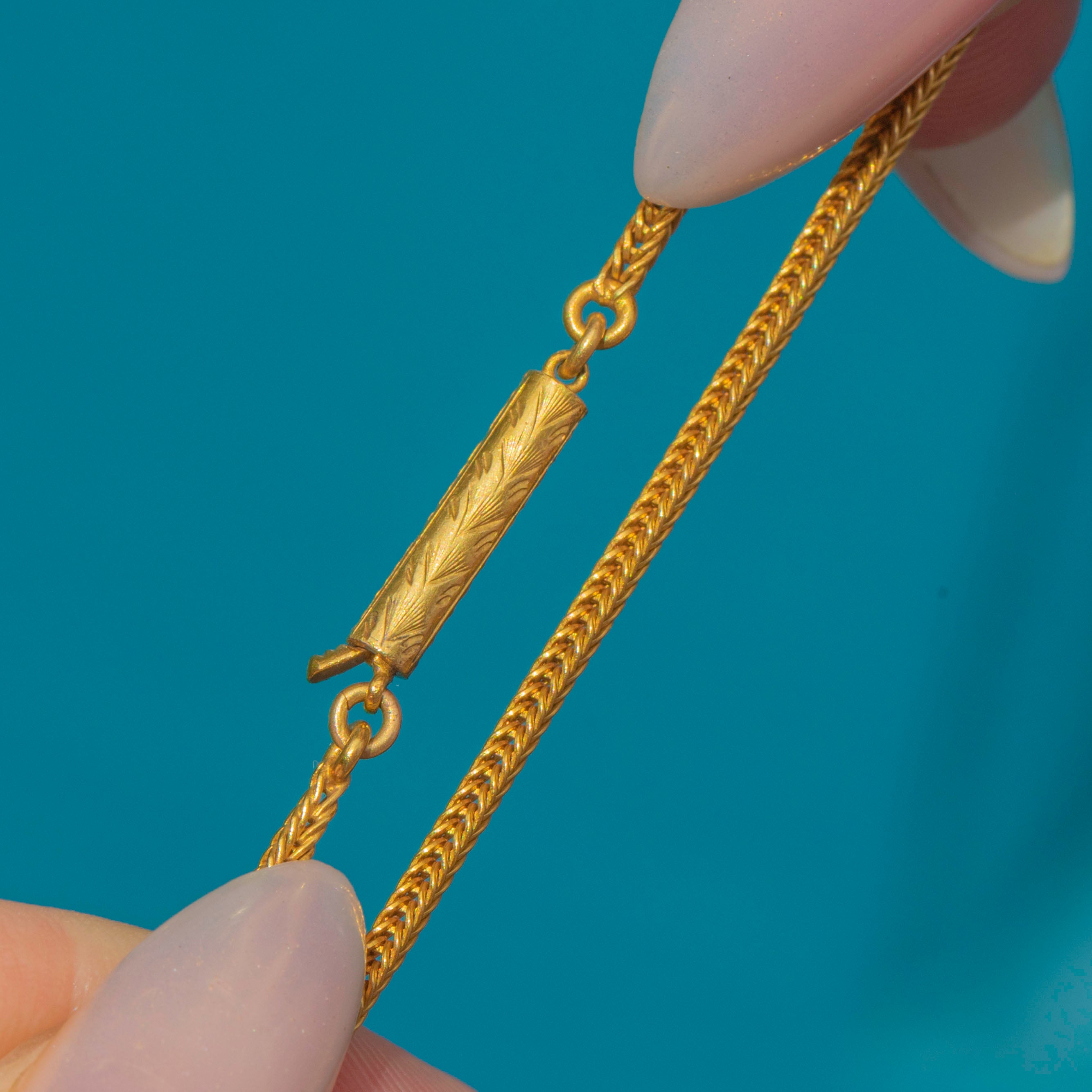 Complete with an engraved barrel clasp and measuring 14.5” long, this piece is elegant, feminine, and exceptionally well-preserved — a true collector’s jewel and wearable work of art.