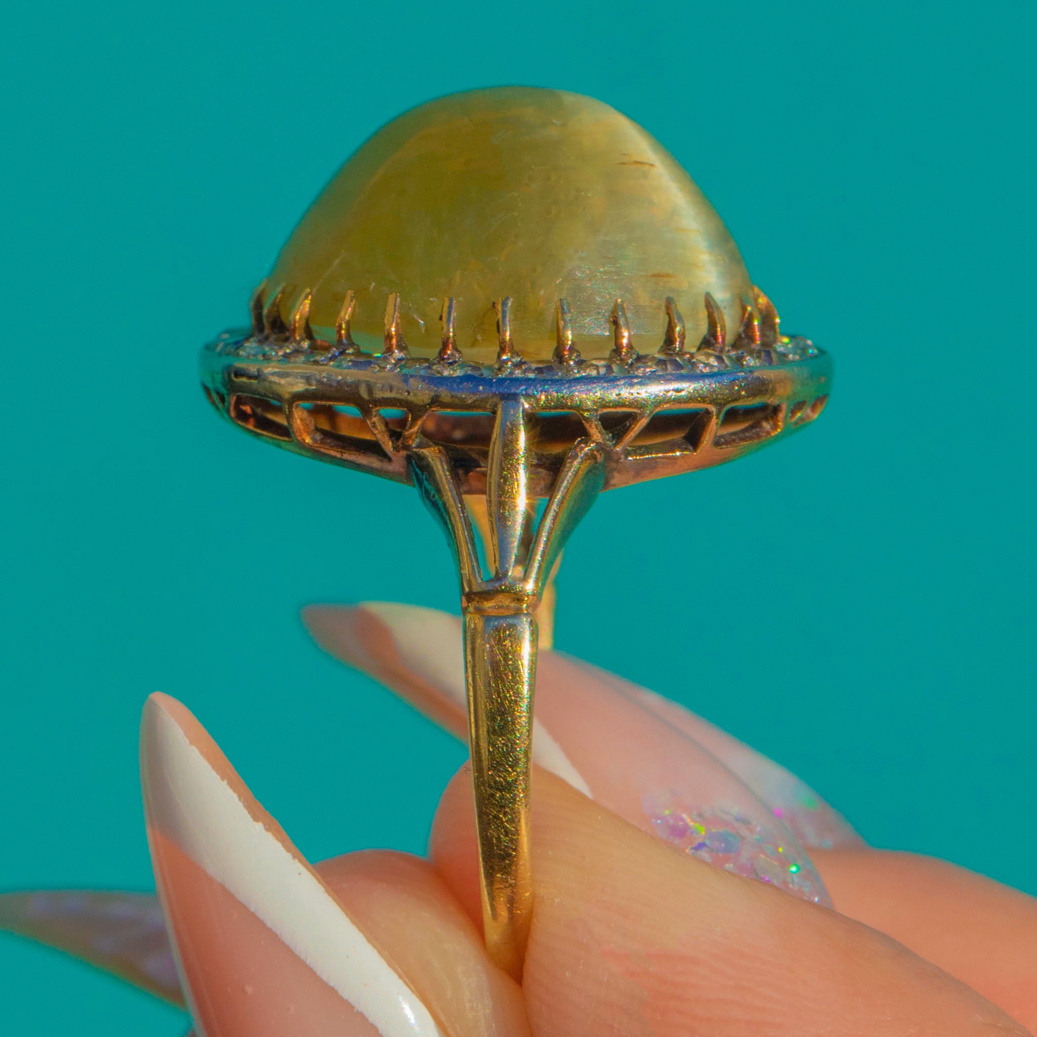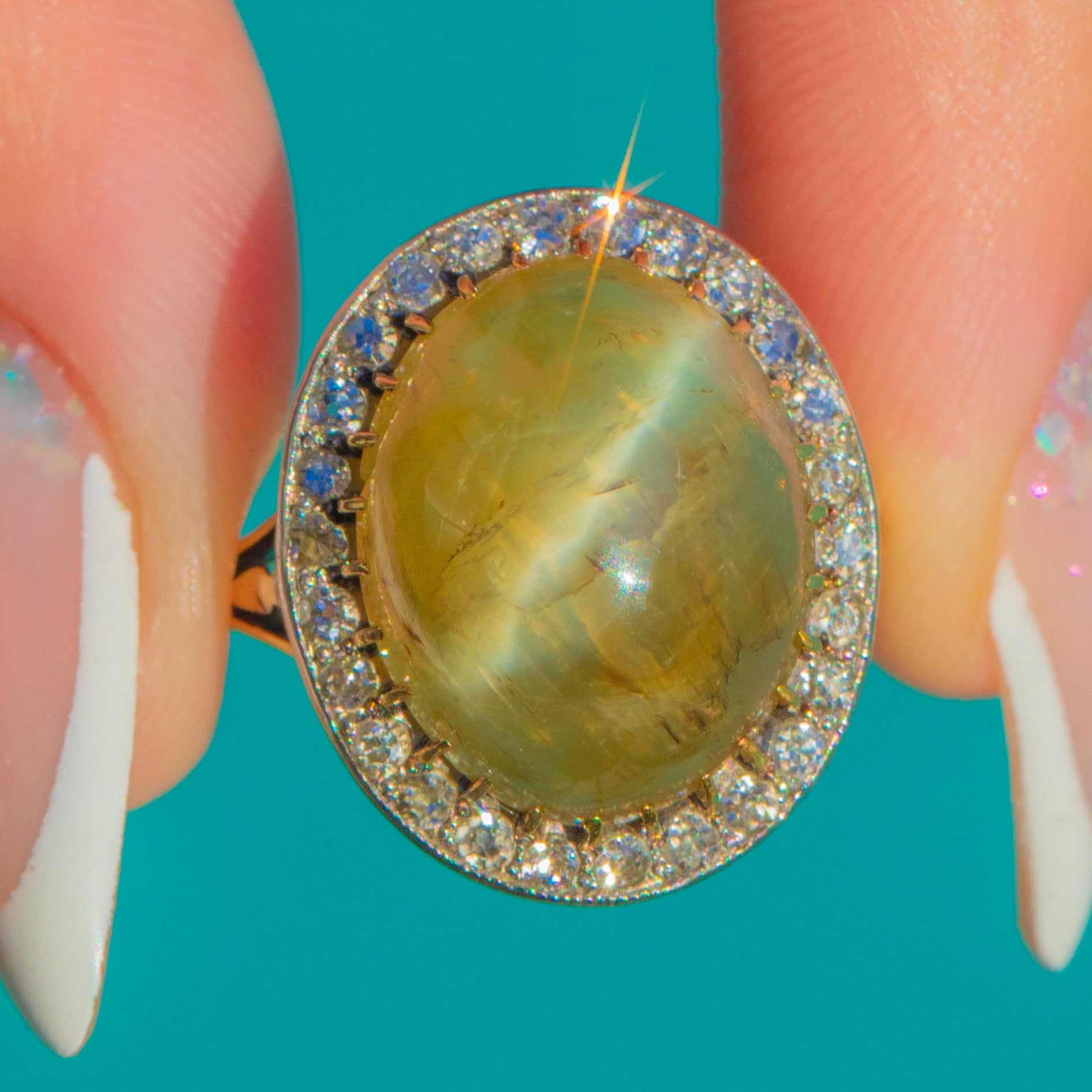 A luminous Victorian treasure, this ring centres a high-domed sugarloaf Chrysoberyl with a distinct cat’s‑eye line, its yellow‑green glow framed by a sparkling halo of Diamonds. The two‑tone construction is quintessentially refined, with a white Platinum head for crisp brilliance, set atop an 18ct Gold shank with elegant split shoulders and a pierced gallery for light and lift.