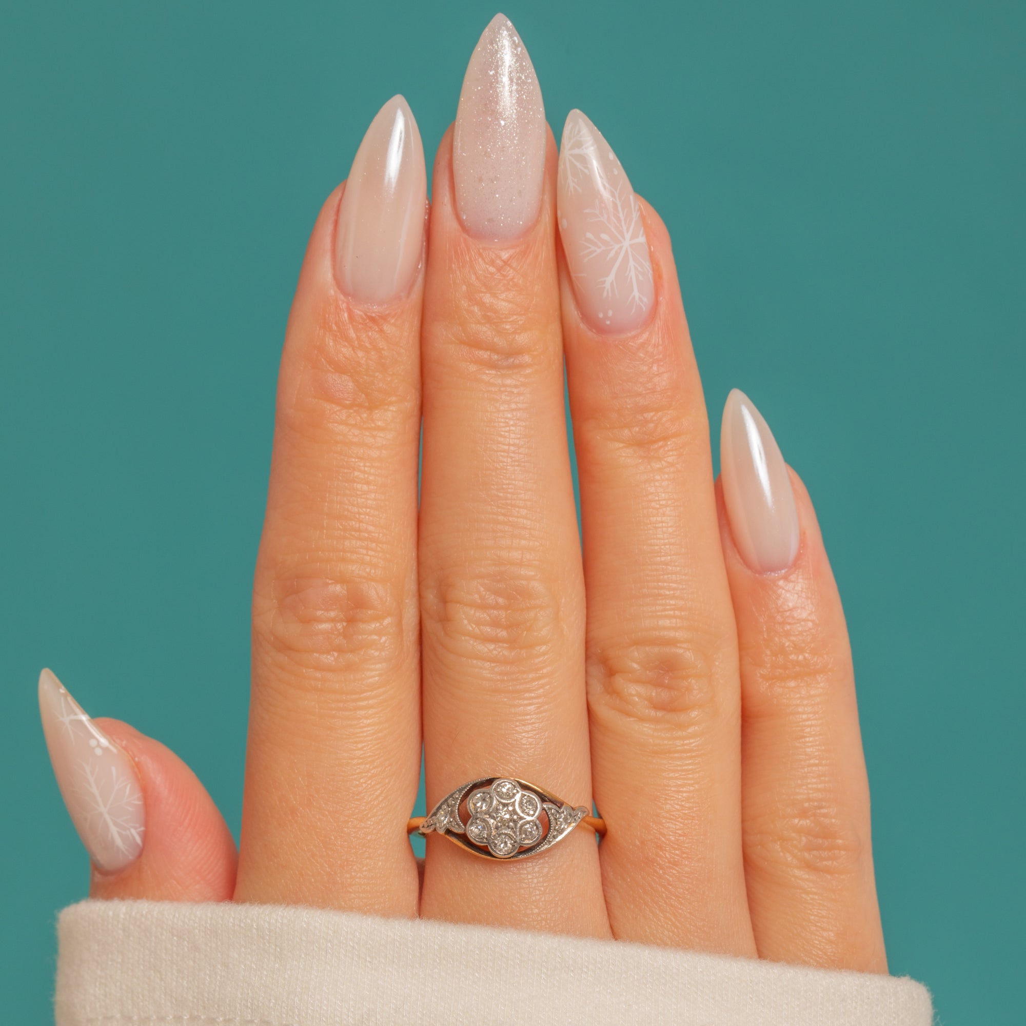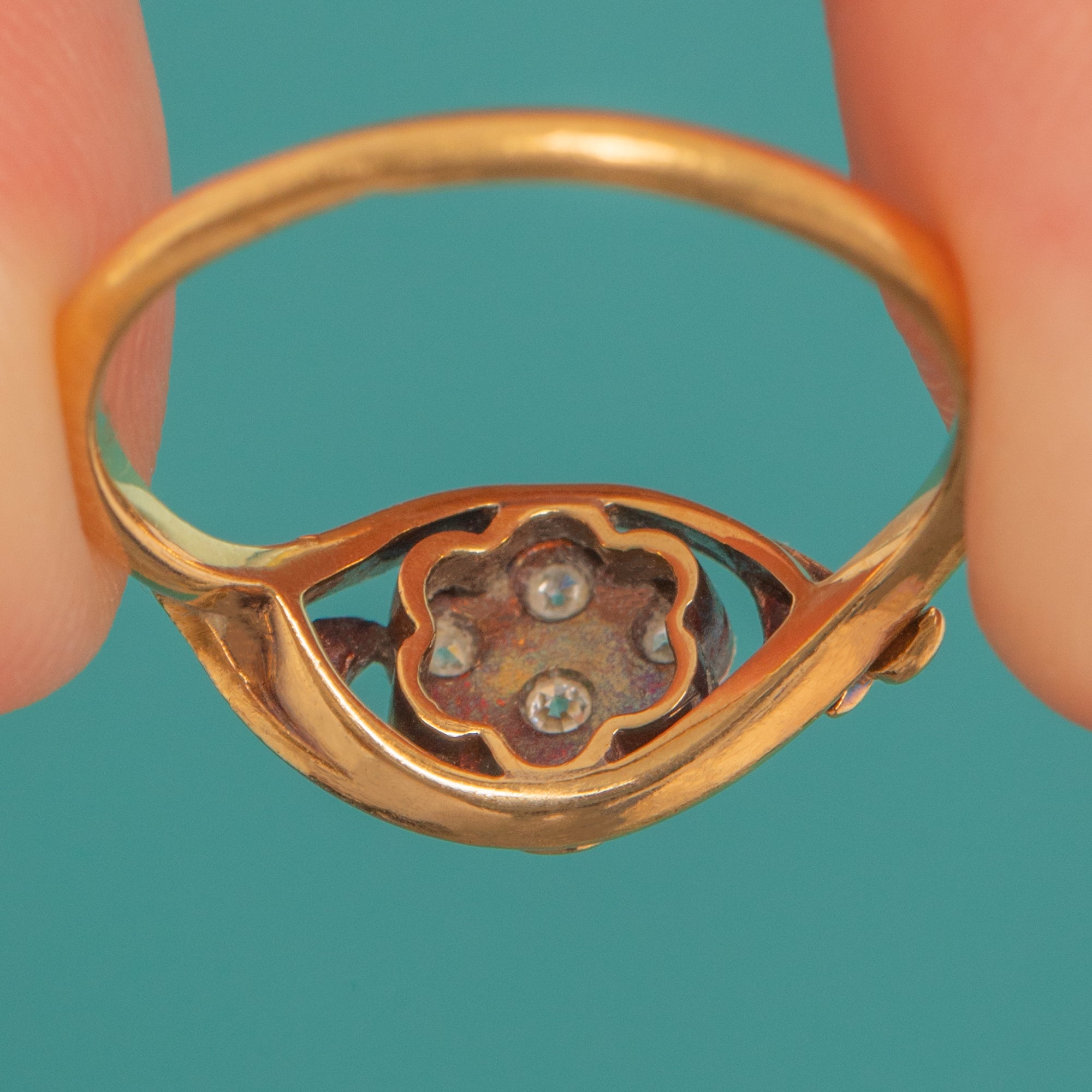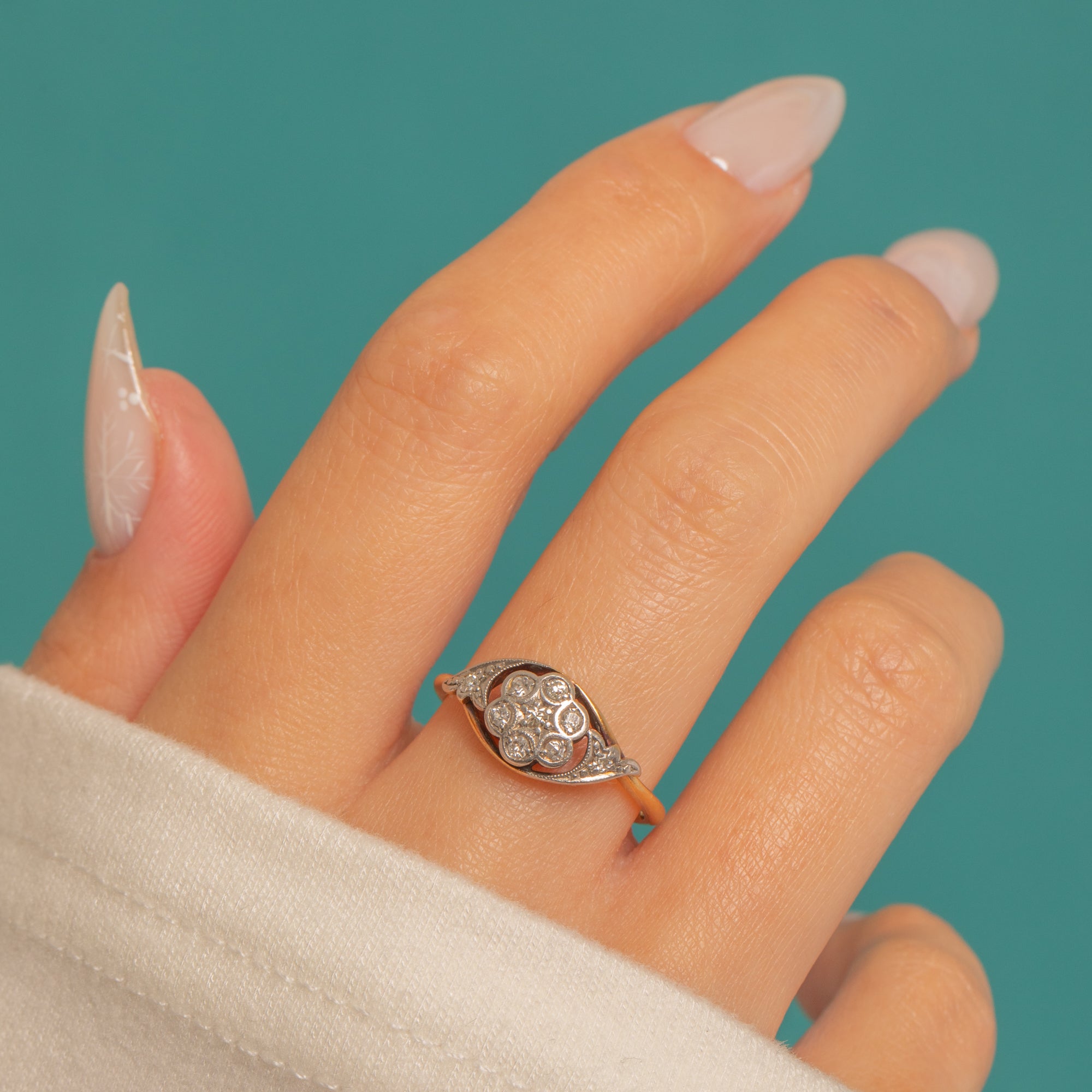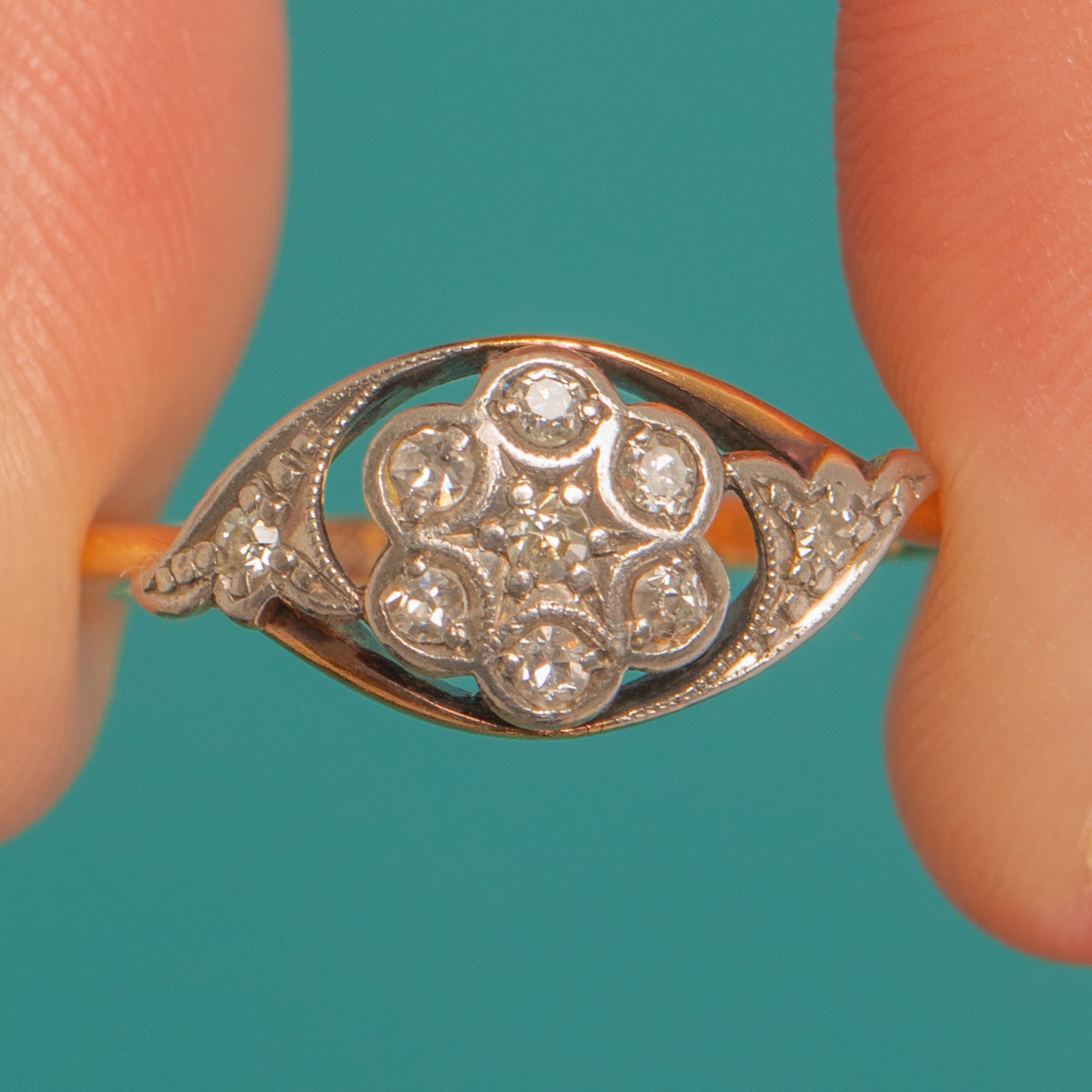 A delicate whisper of Edwardian elegance, this two-tone flower cluster ring pairs Platinum illusion settings with a warm 18ct Gold shank. At its heart sits a charming Diamond rosette framed by fine milgrain, with tiny Diamond accents at the shoulders for a refined glimmer. The low-profile and subtle open backs showcase that crisp, early 20th-century craftsmanship, with a touch of darkened contrast within the setting that makes the Diamonds pop.
