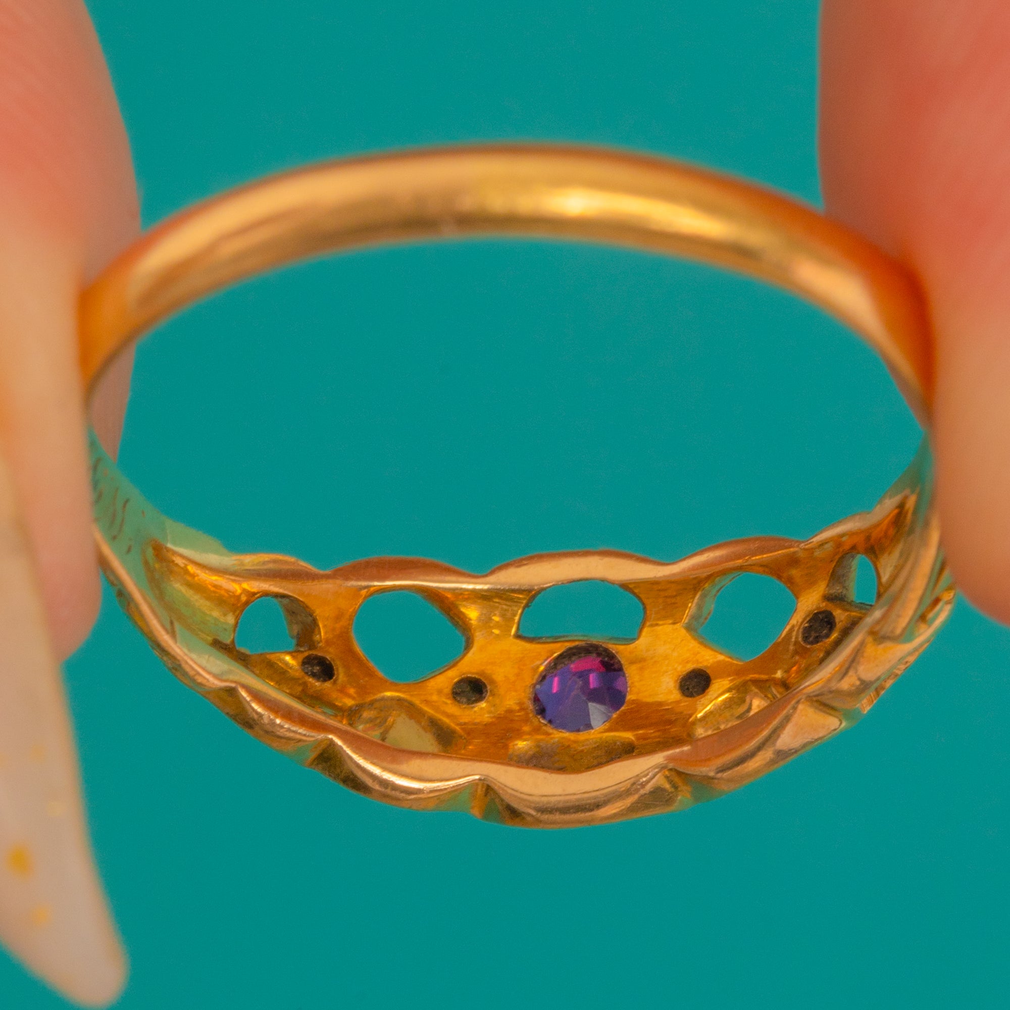 Crafted in warm 18ct Gold, the band tapers elegantly for a comfortable fit and refined silhouette. Dating to the height of the Edwardian era, this piece embodies the period’s love of delicate yet luxurious gemstone combinations.