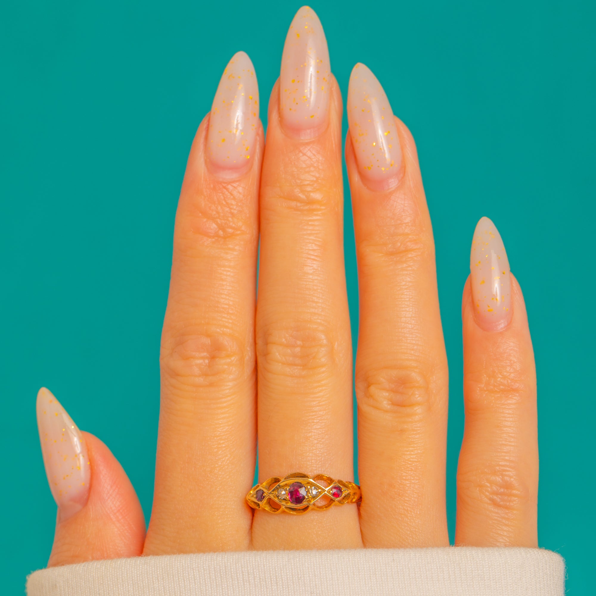 A beautifully balanced Edwardian five-stone ring, set with a lively row of Rubies and Diamonds that create a rich contrast of colour and sparkle. The Rubies gently graduate in size, adding a pleasing sense of rhythm across the finger, while the bright Diamonds bring crisp flashes of light.