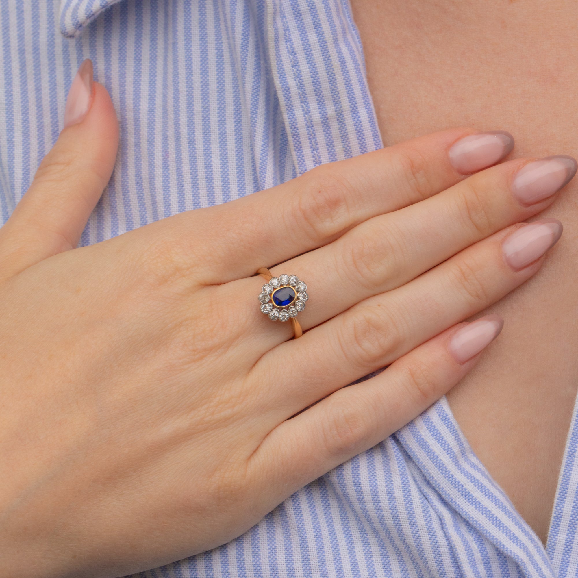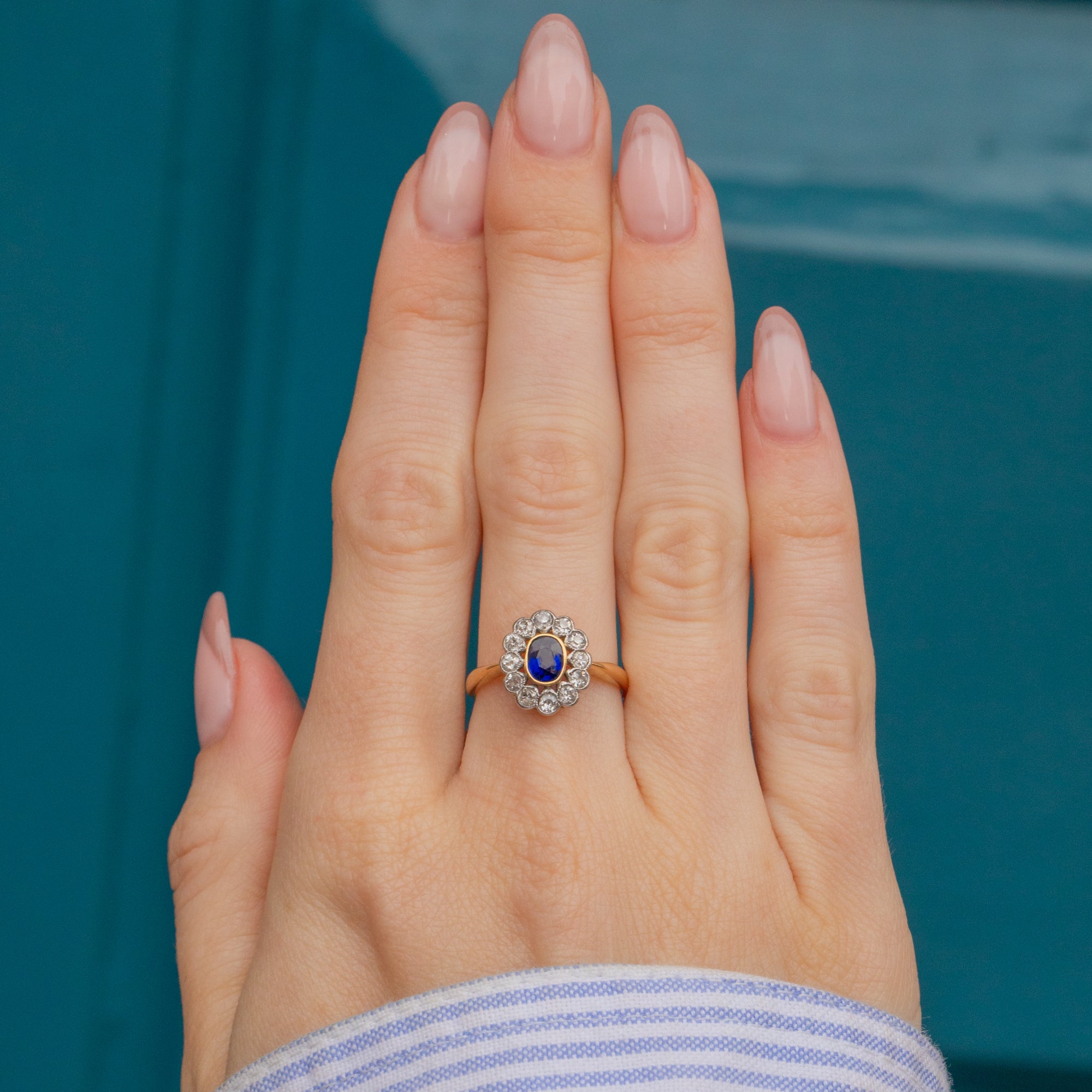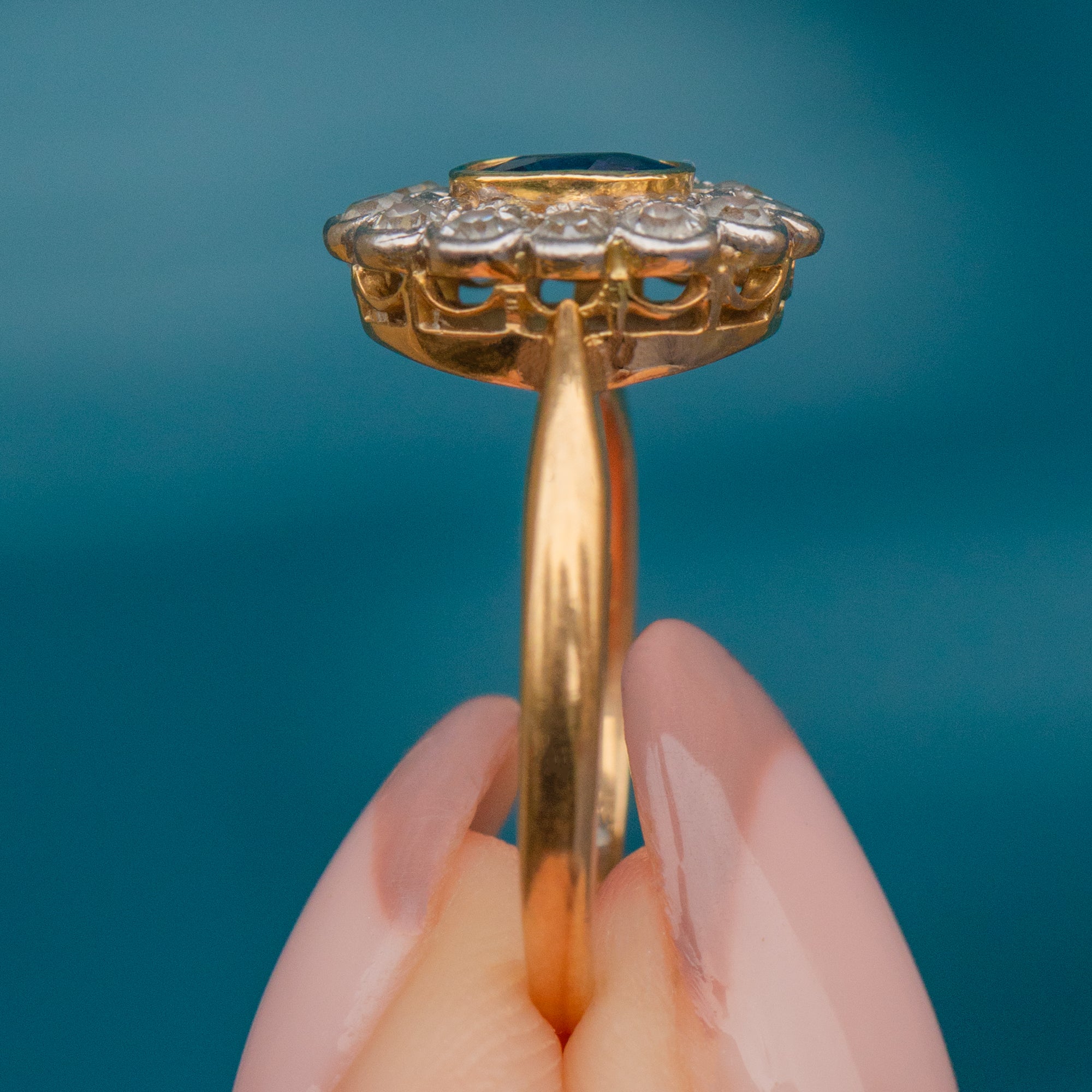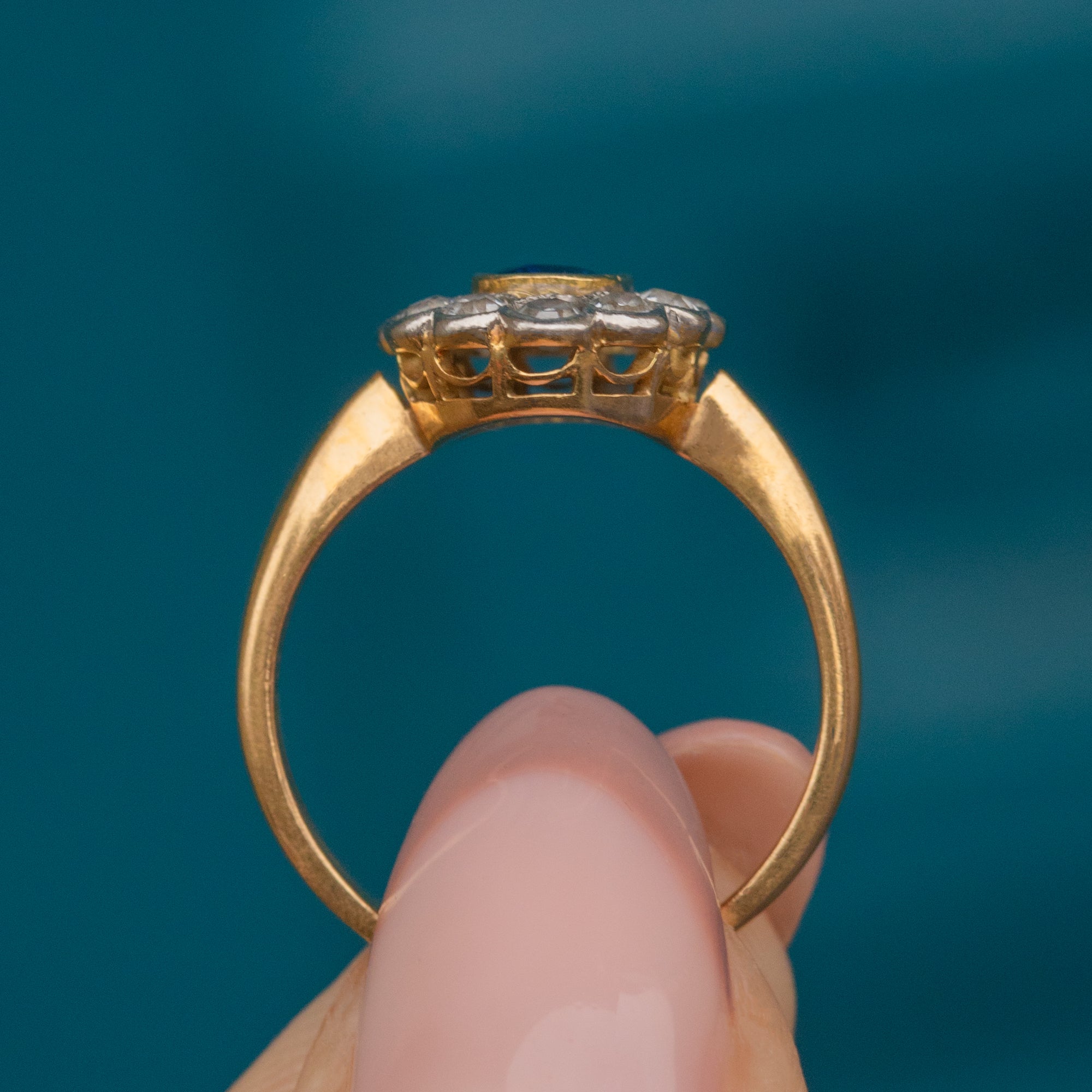 Full of old-world elegance and character, this Edwardian 18ct Gold Sapphire Diamond flower cluster ringring is crafted from buttery 18ct Gold and features a delicate flower cluster design.