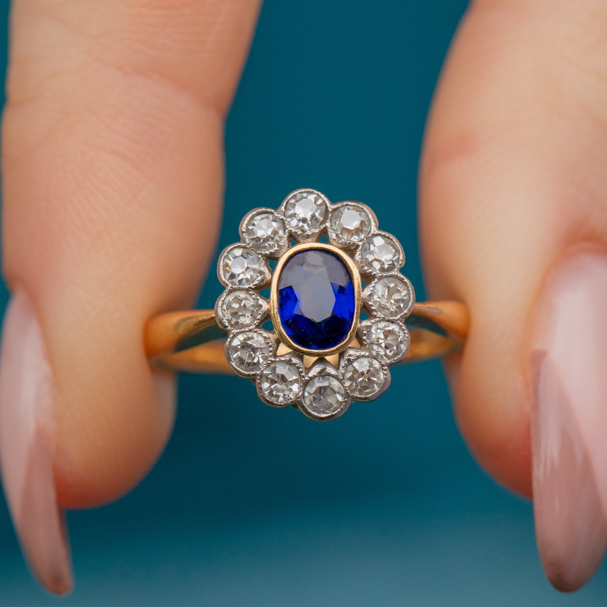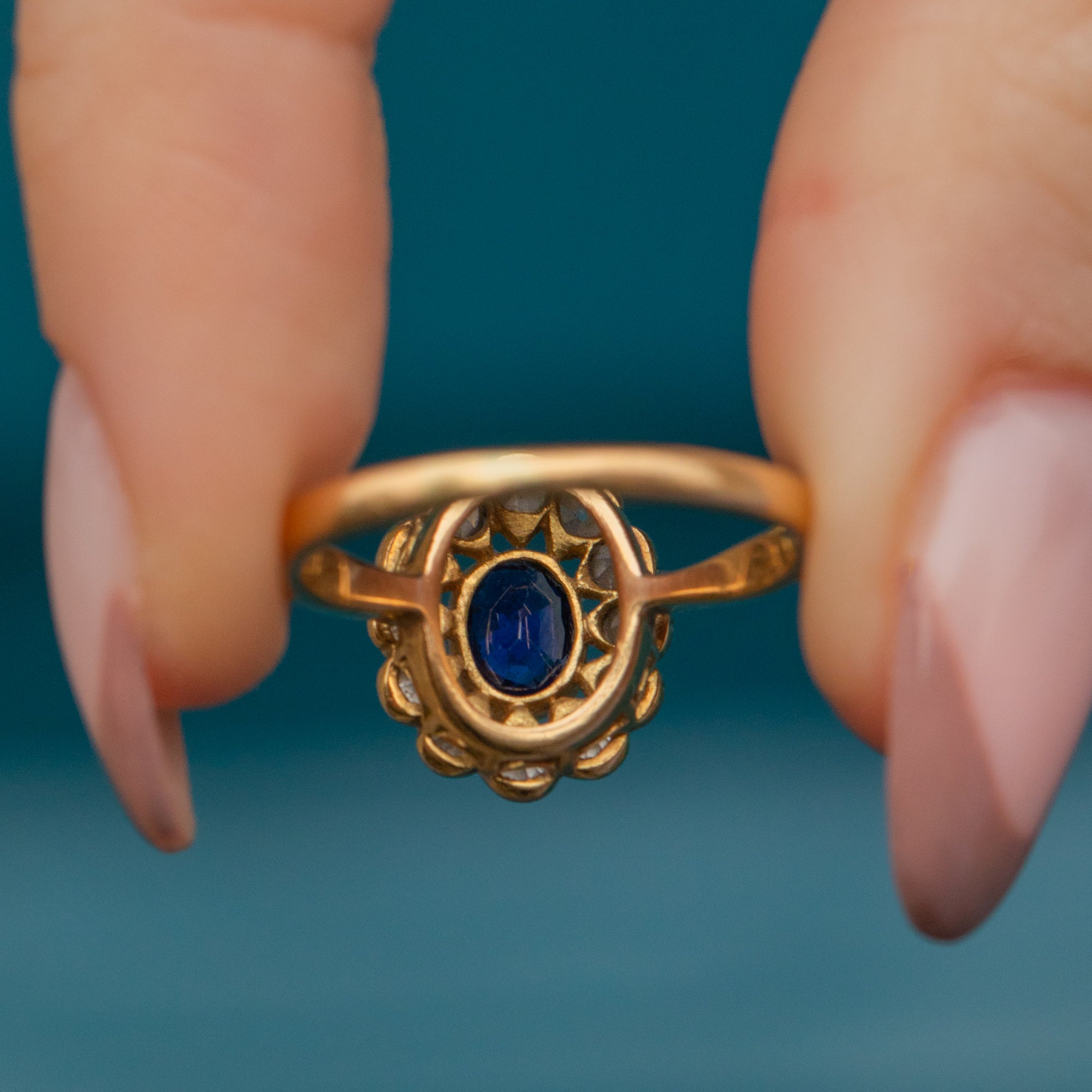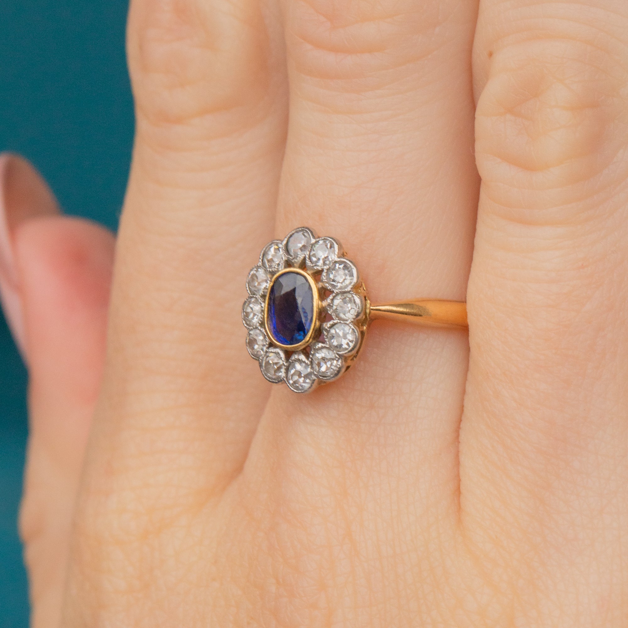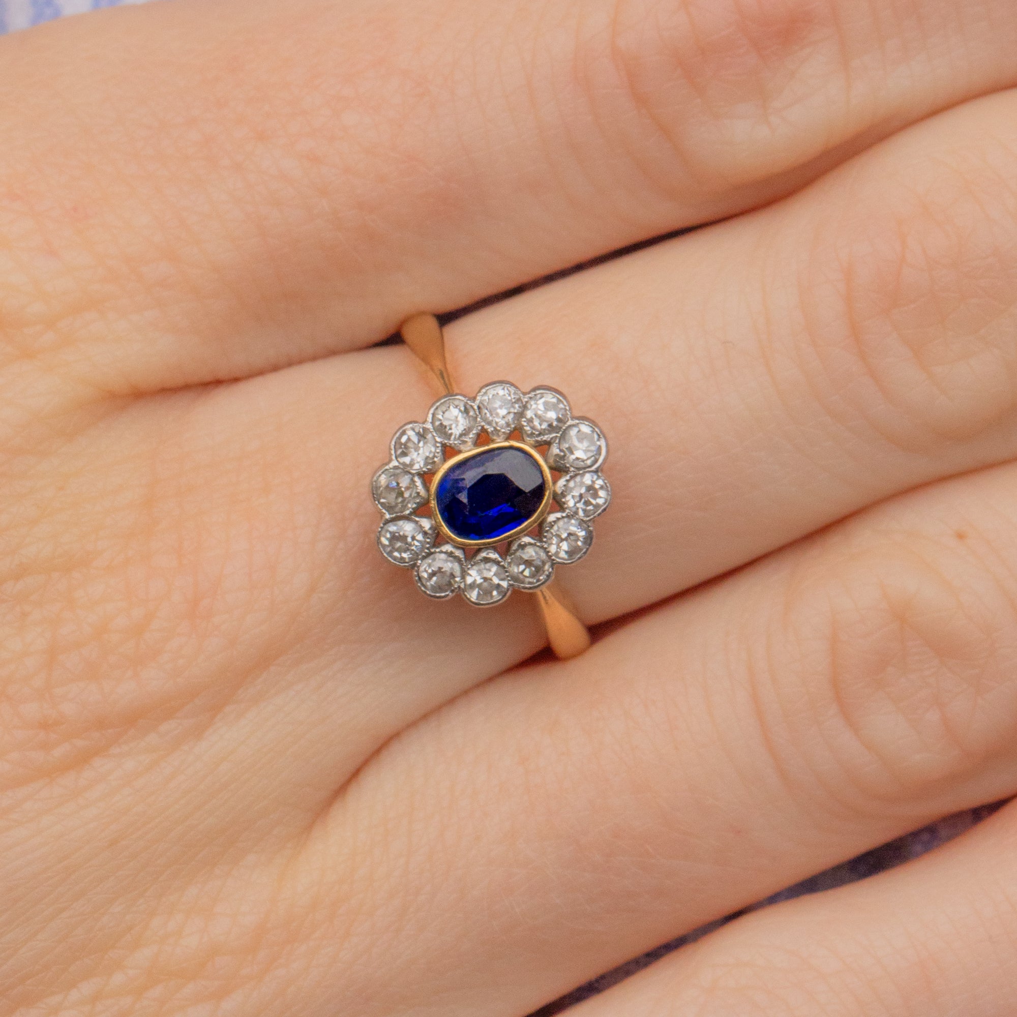 Full of old-world elegance and character, this Edwardian 18ct Gold Sapphire Diamond flower cluster ringring is crafted from buttery 18ct Gold and features a delicate flower cluster design.