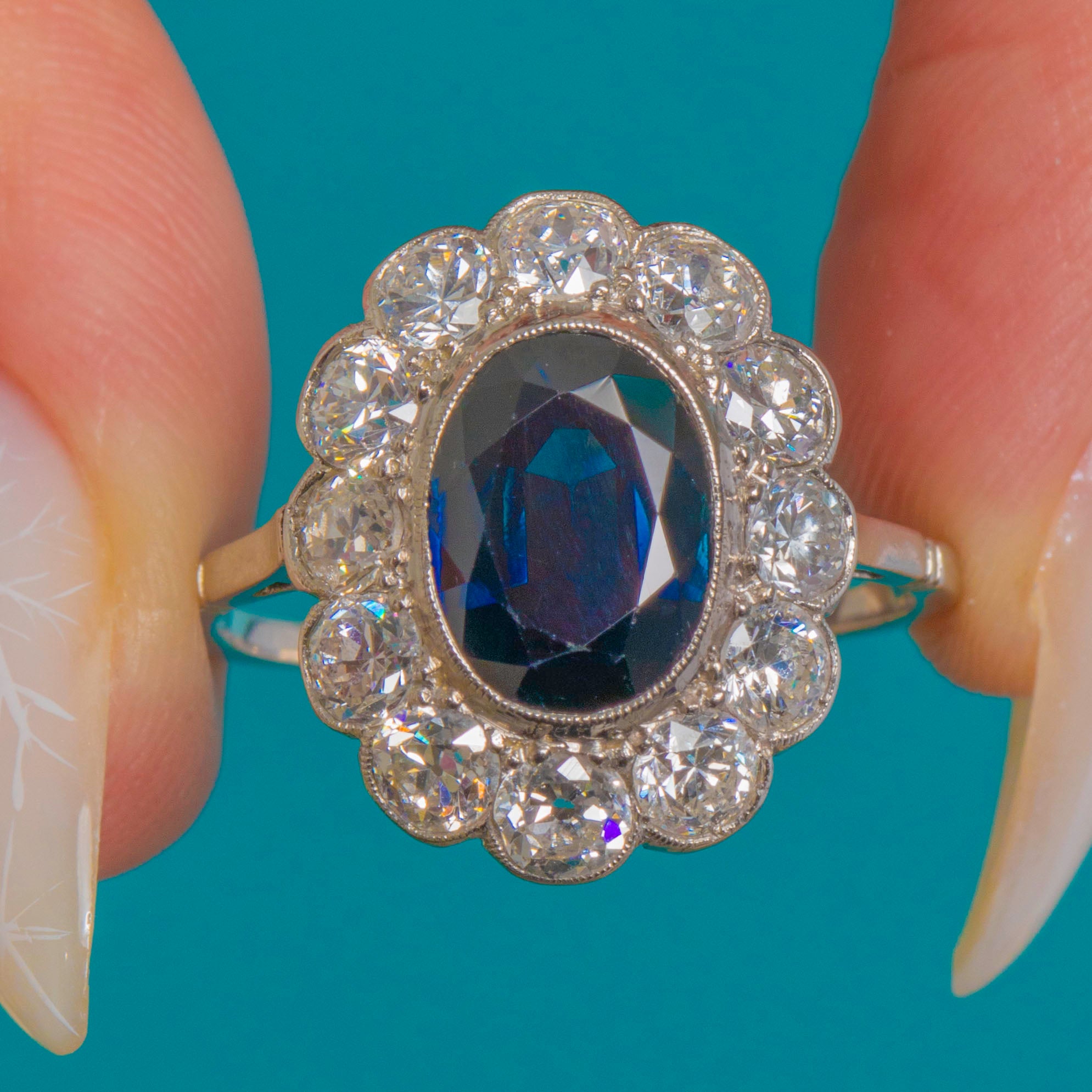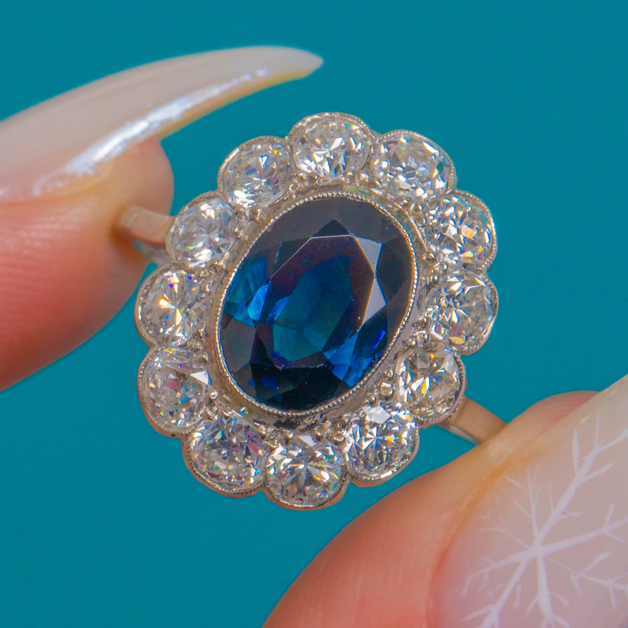 Edwardian 18ct White Gold 2.30ct Natural Sapphire & Diamond Cluster Ring