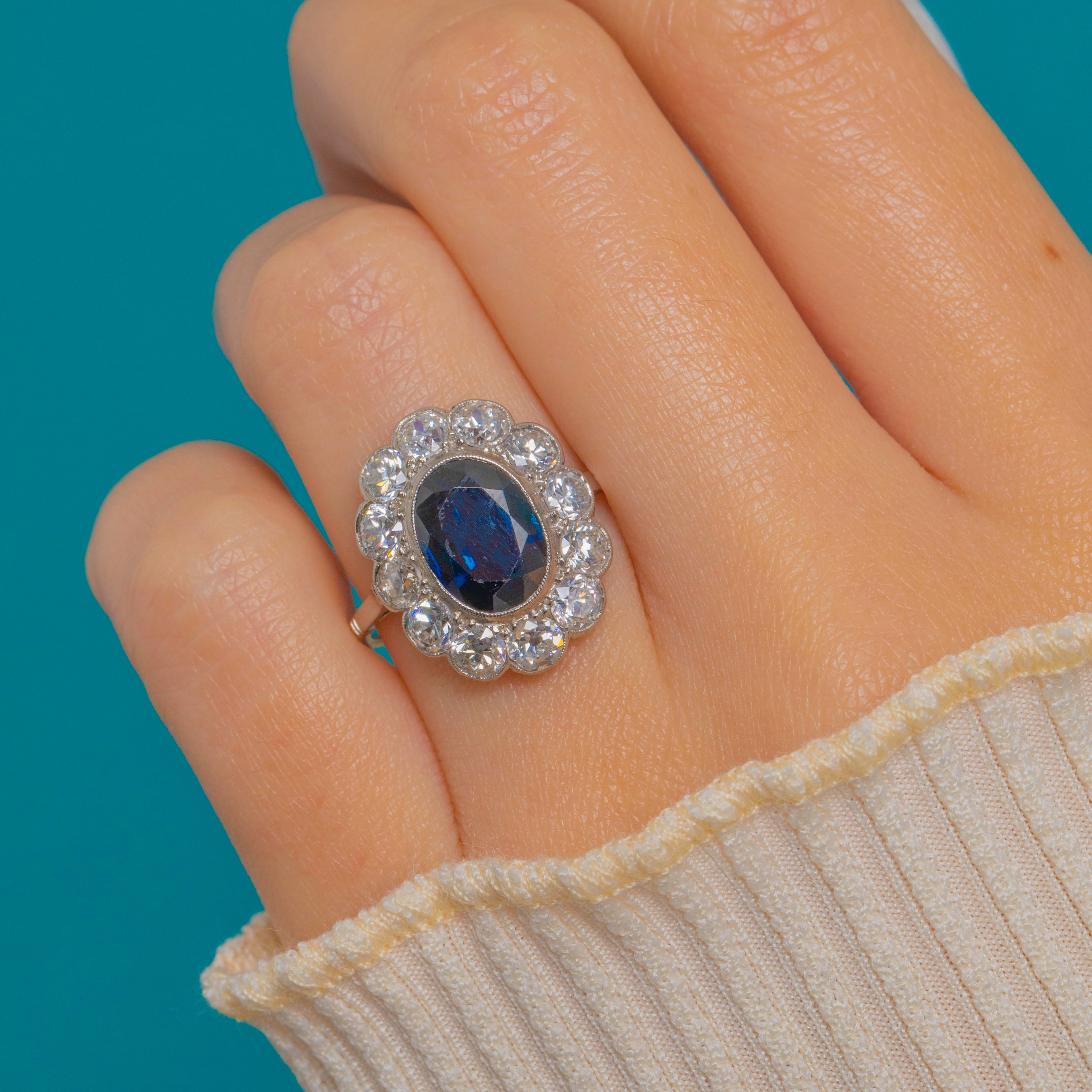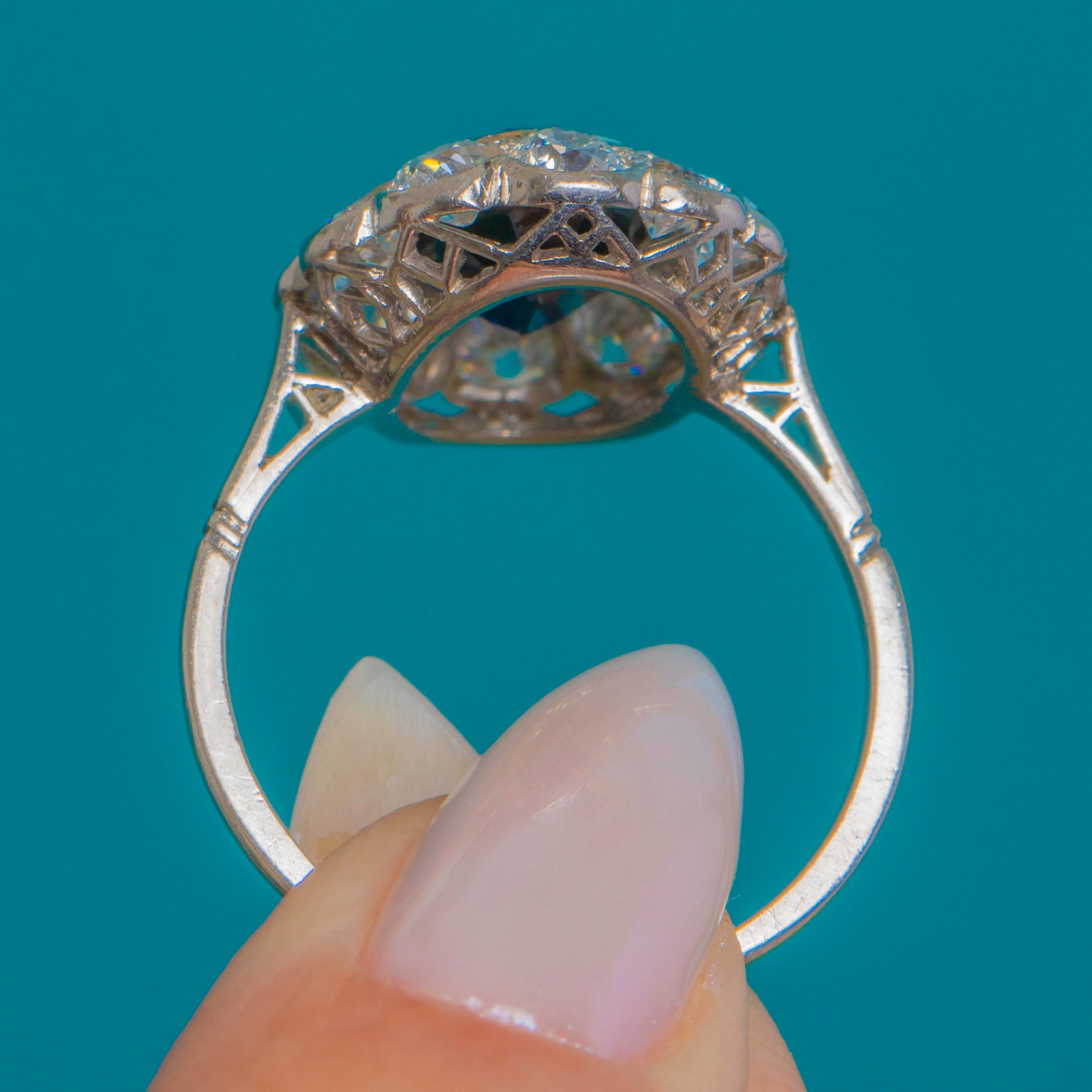The chunky, romantic facets of the Old European Cuts sparkle beautifully against the cool White Gold, amplifying the deep blue of the centre stone with a luminous corona of fire. Elegant and refined yet impressively impactful, this is a timeless rosette design crafted with the finesse and poise of the Edwardian era.