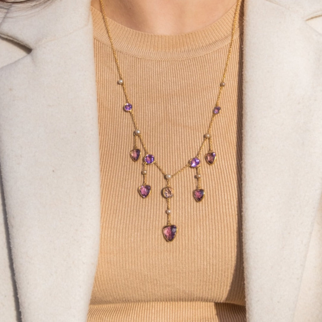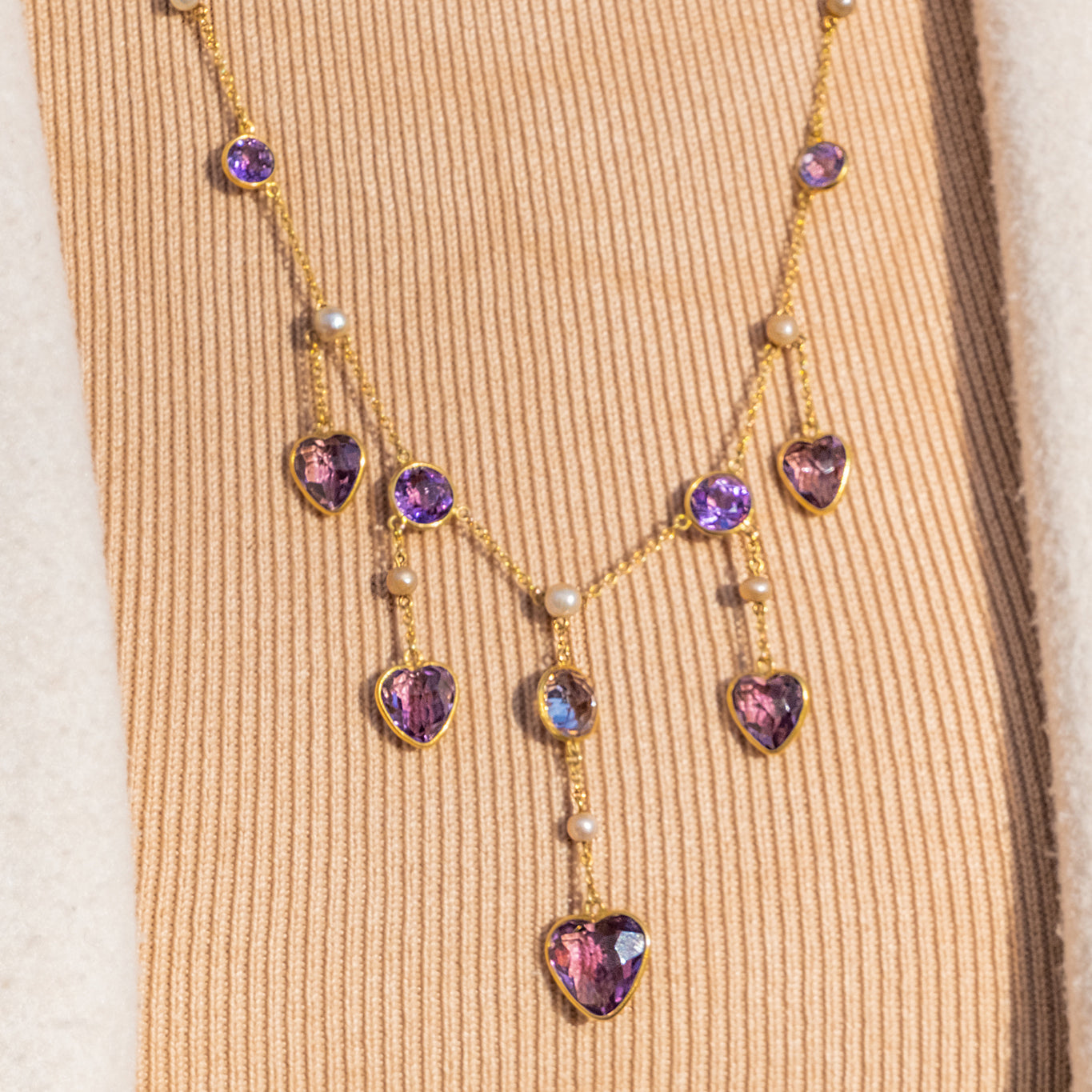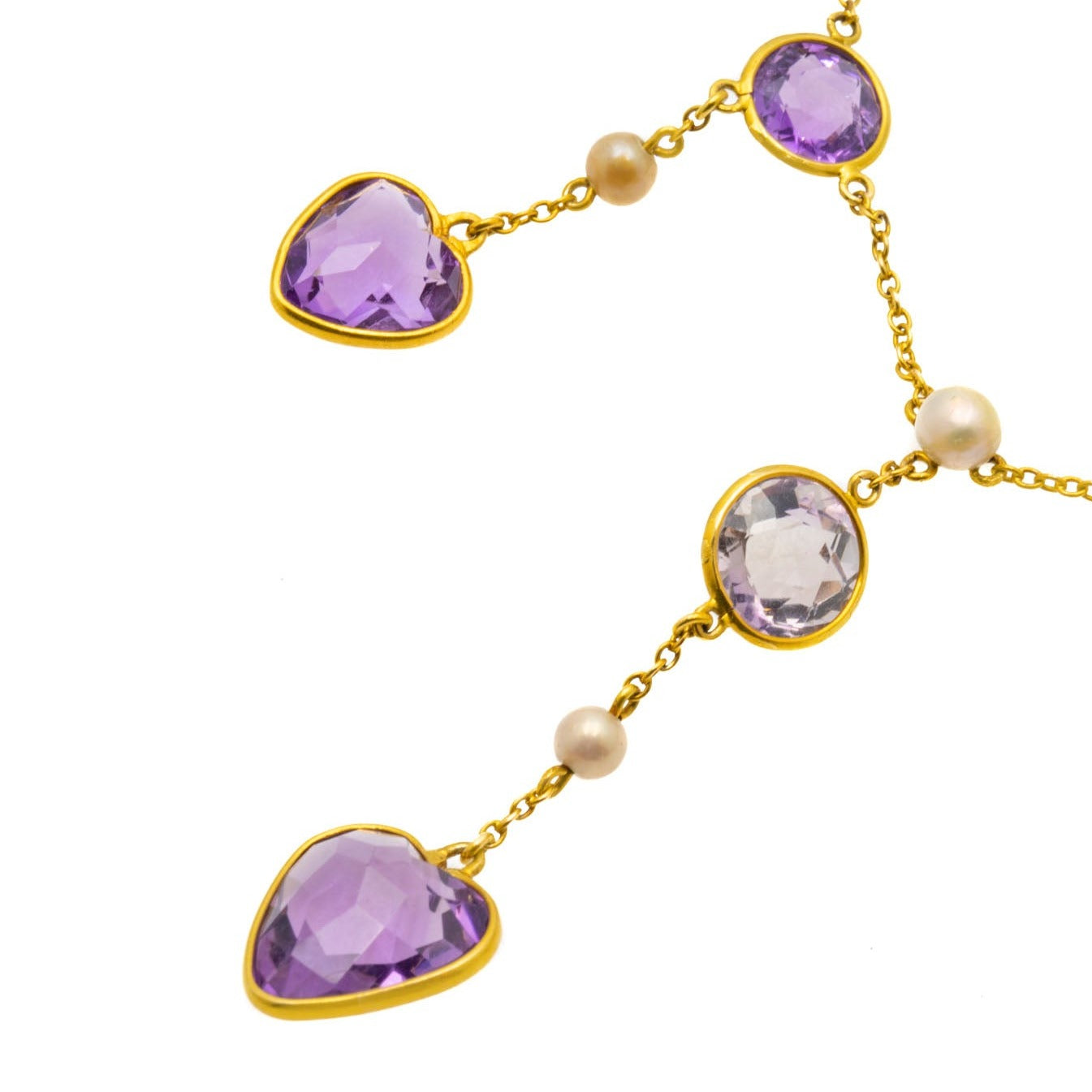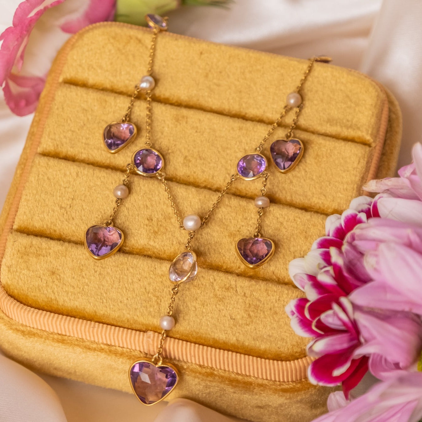 22" Edwardian 9ct Gold Amethyst Pearl Heart Fringe Necklace