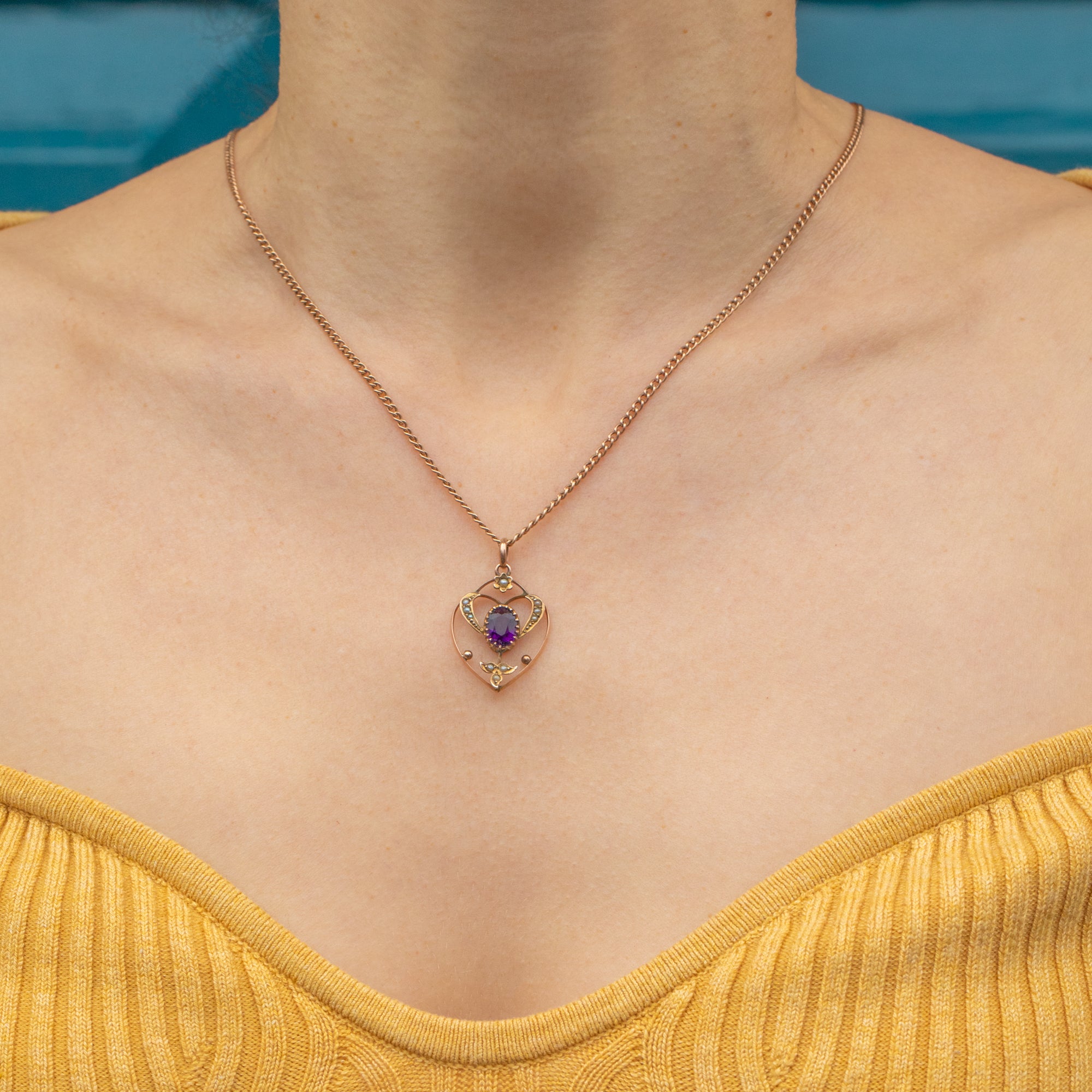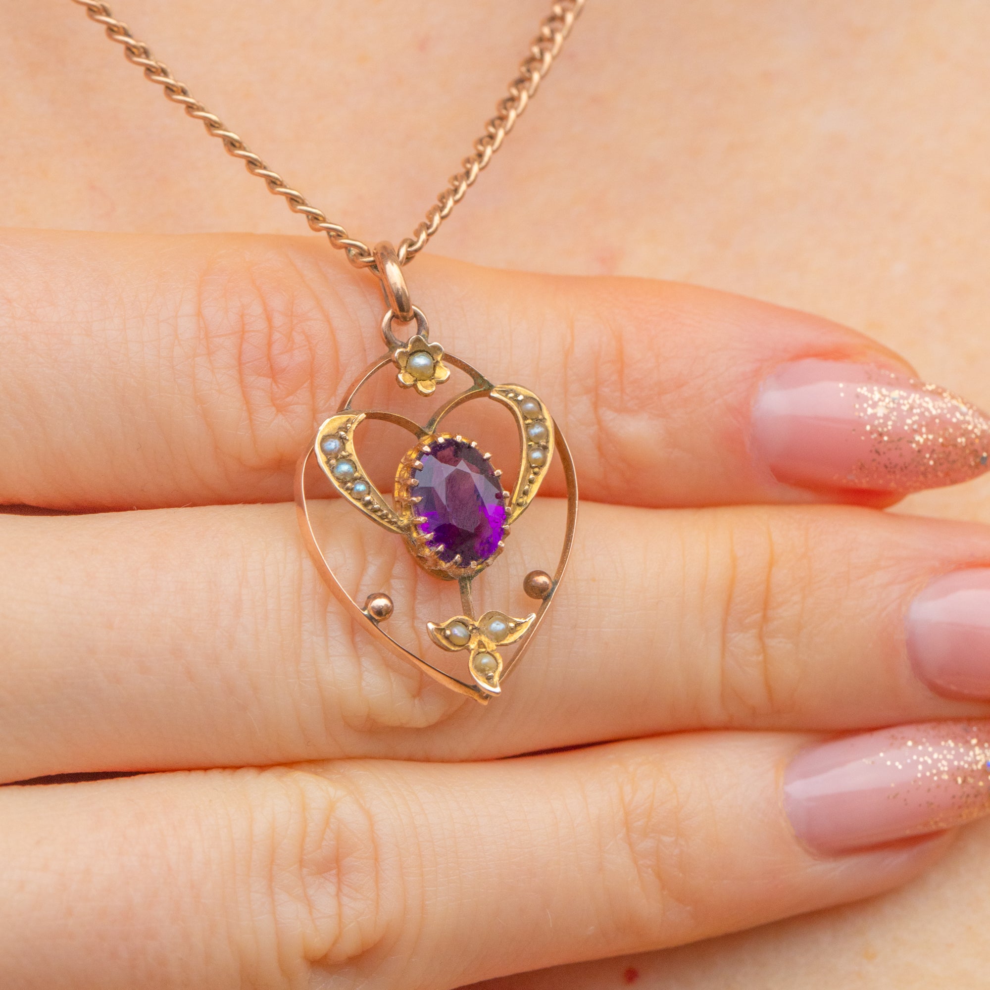 Brimming with Edwardian charm, this antique 9ct Gold Amethyst Pearl heart pendant is an incredible treasure. Her central faceted Amethyst boasts a rich violet gleam that will perfectly catch the sunlight and is perfectly complimented by the warmth of her 9ct Gold.