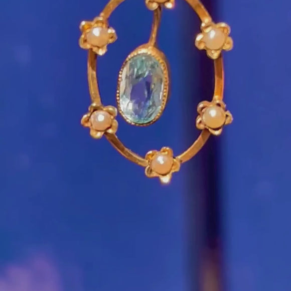 Edwardian 9ct Gold Aquamarine Pearl Flower Pendant