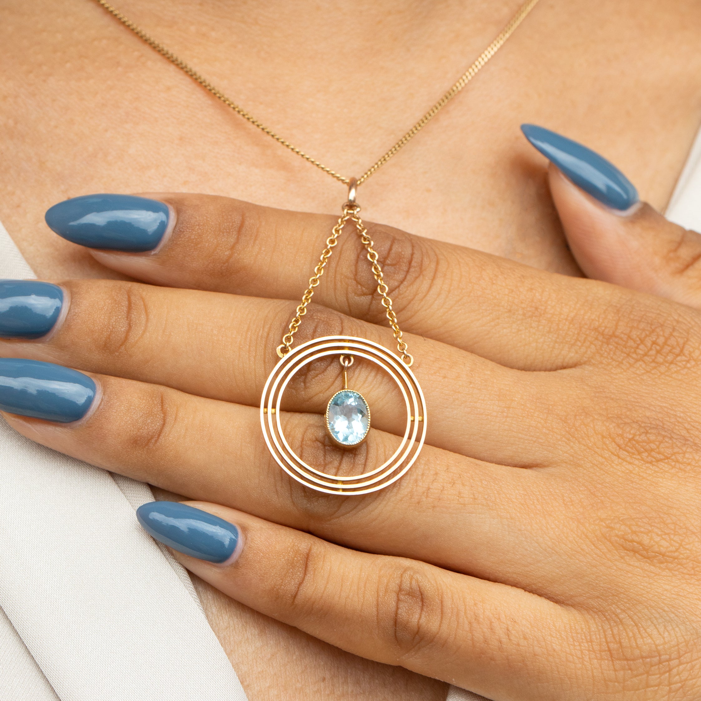 Plucked from the prettiest era, this Edwardian 9ct Gold Aquamarine pendant is heavenly! This antique pendant provides plentiful movement, with her arctic blue Aquamarine swinging in the centre of her perfectly formed 9ct Gold rings.