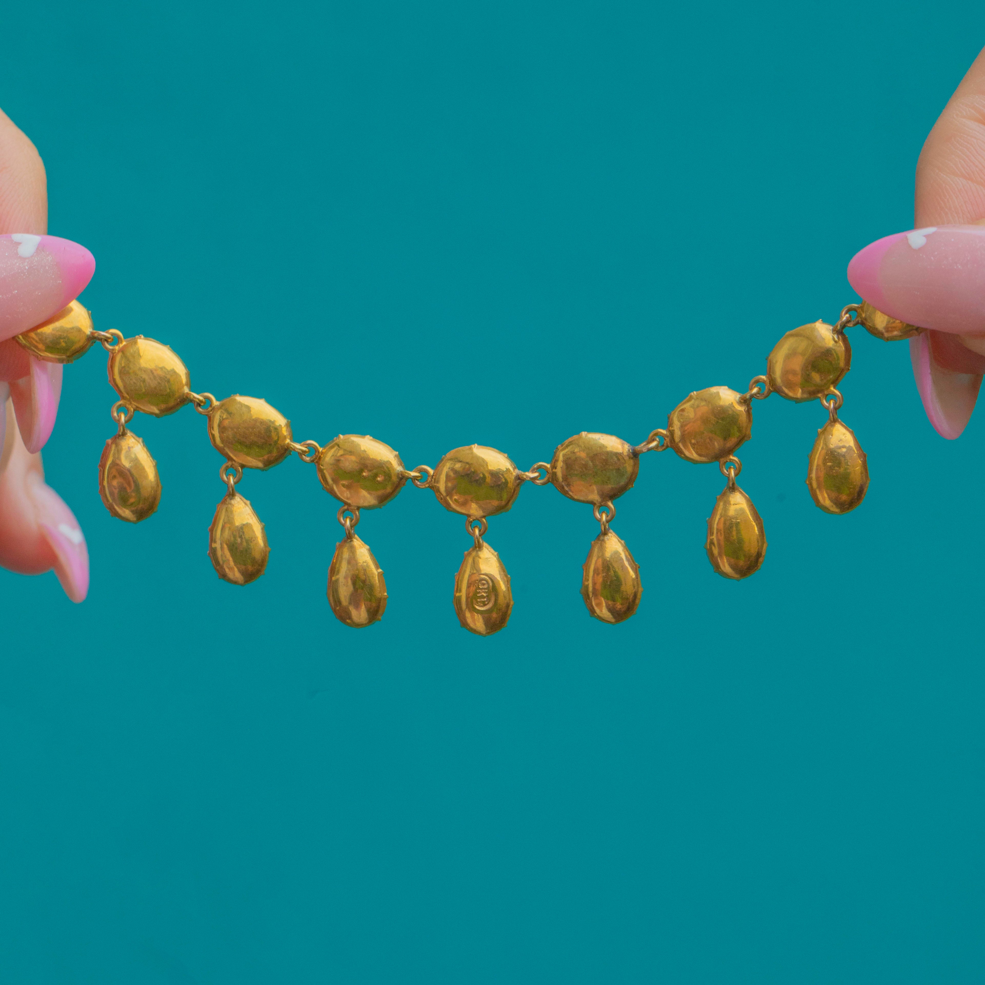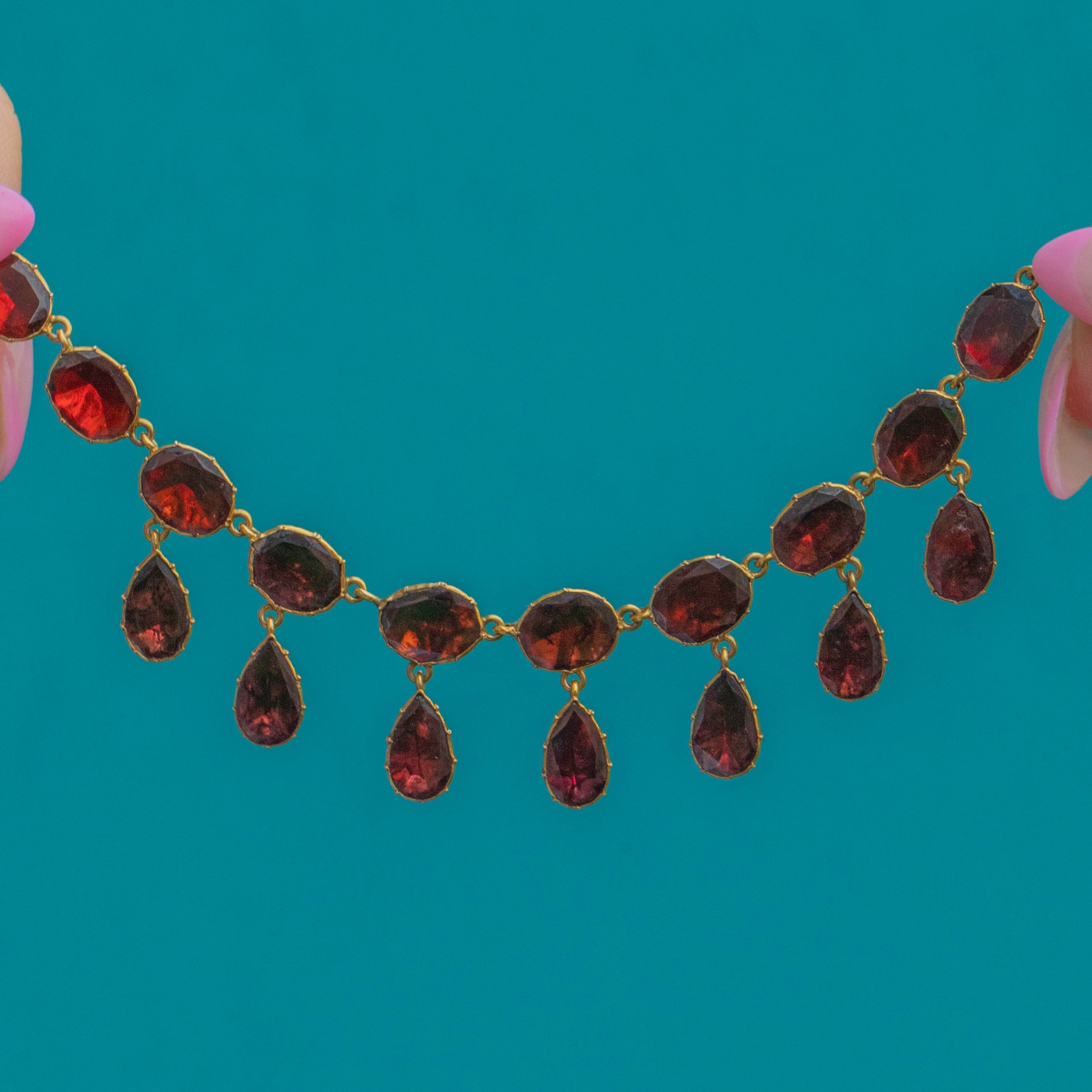 This exquisite Edwardian necklace features a continuous row of deep red flat-cut Garnets with a gorgeous fringe of cascading droplets... Totalling approximately 15.50 carats and set in rich 9ct Gold, each stone glows with warm crimson tones, arranged in an elegant tapering design that sits beautifully along the neckline.